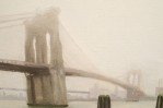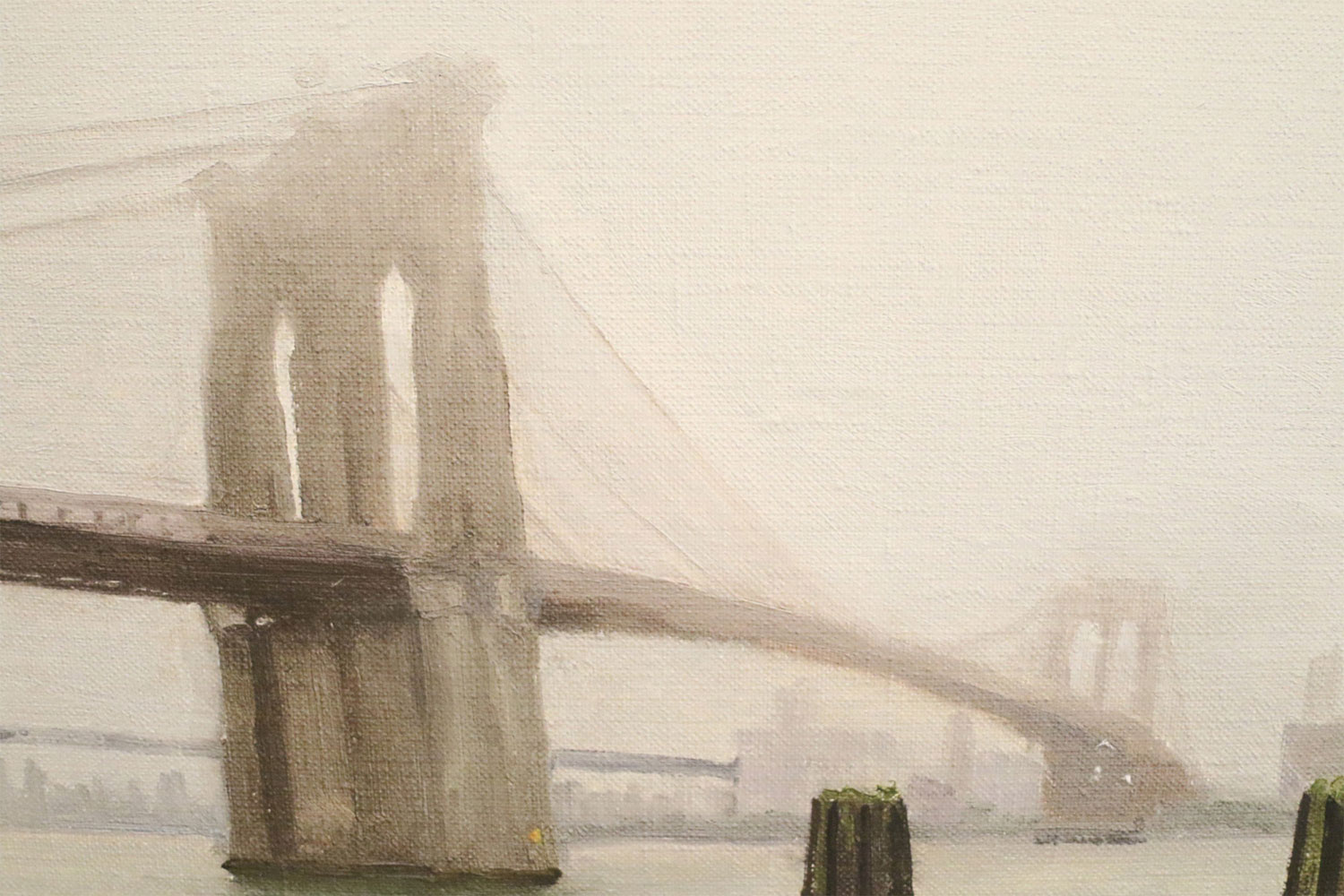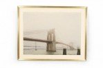 Contemporary watercolor painting of an urban bridge in fog in a gilt metal rectangular frame with a beige mat.
