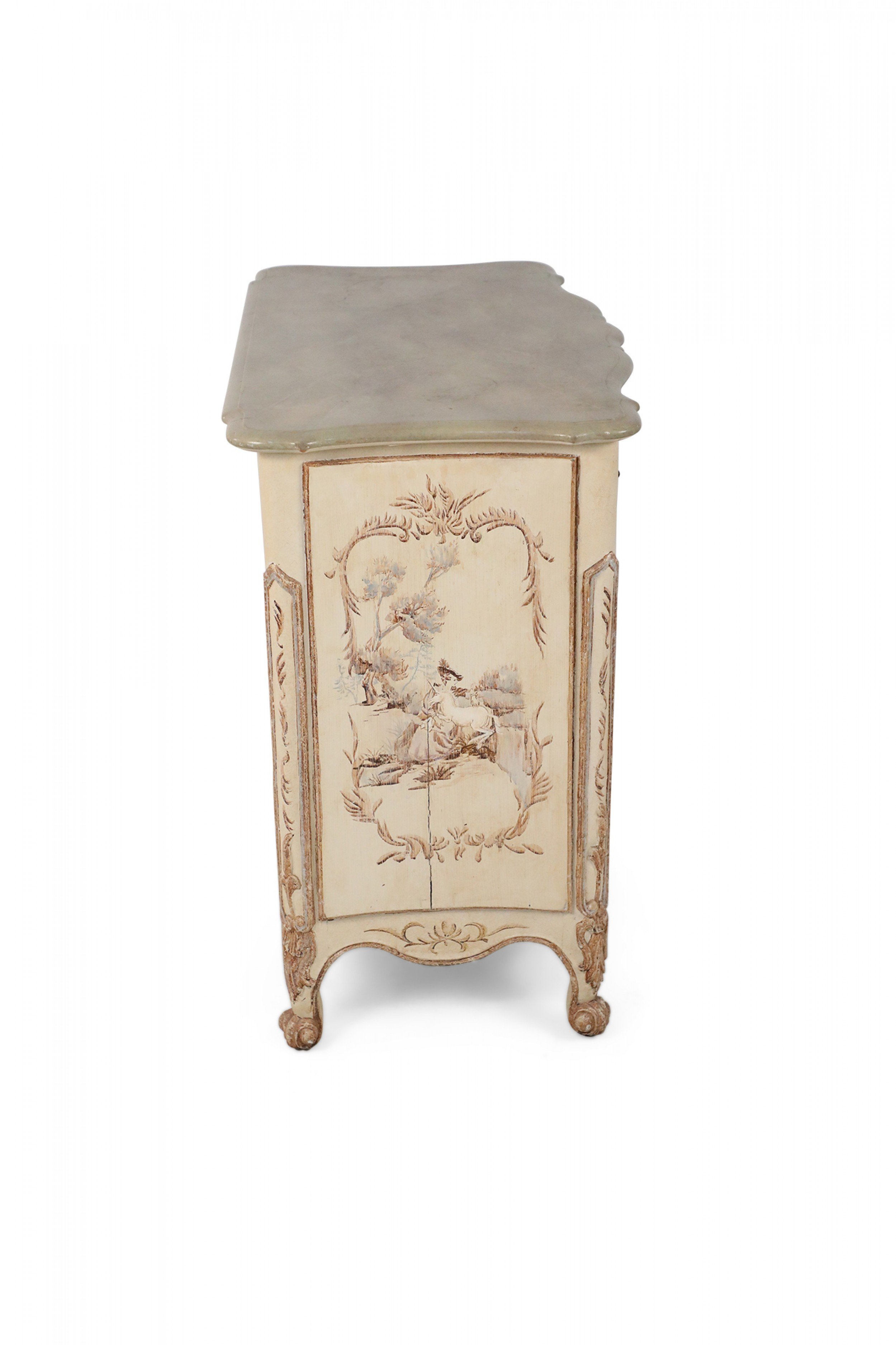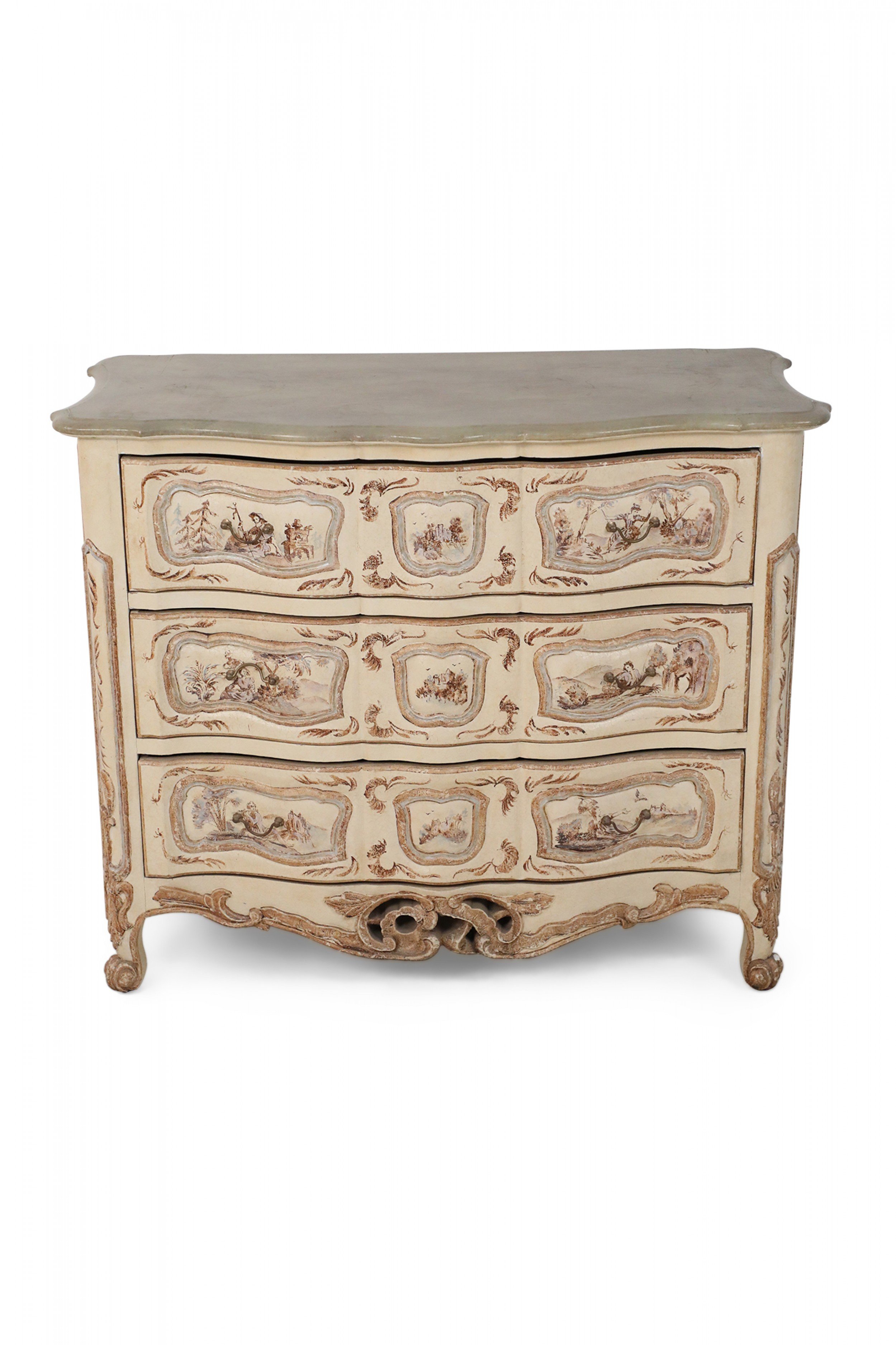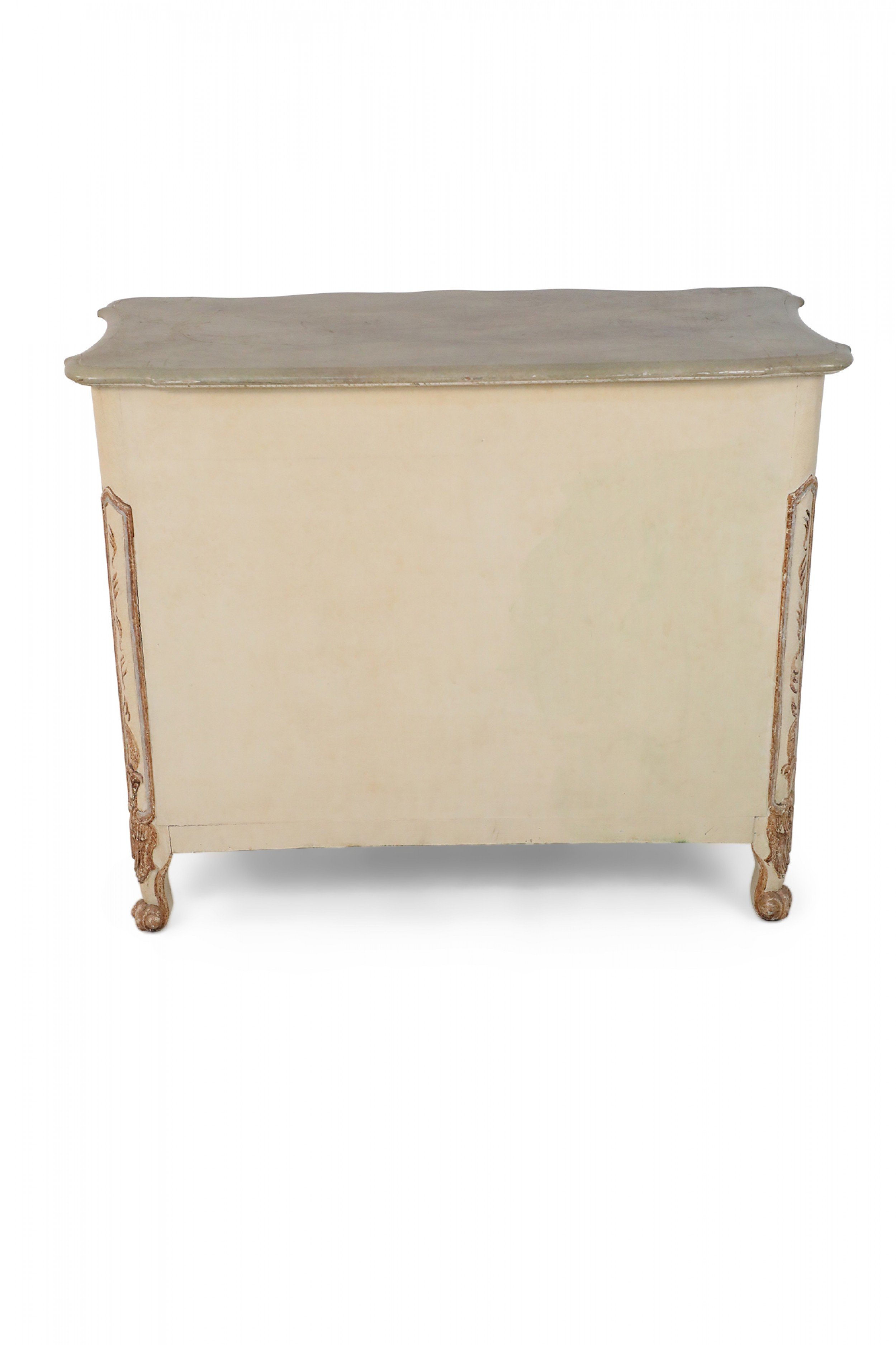 French Louis XV-style serpentine commode that contrasts a smooth, scalloped beige faux marble top with a wooden, cream-painted body of undulated drawers with brass pulls and petite, carved cabriole legs with ball feet connected by a carved, pierced apron..