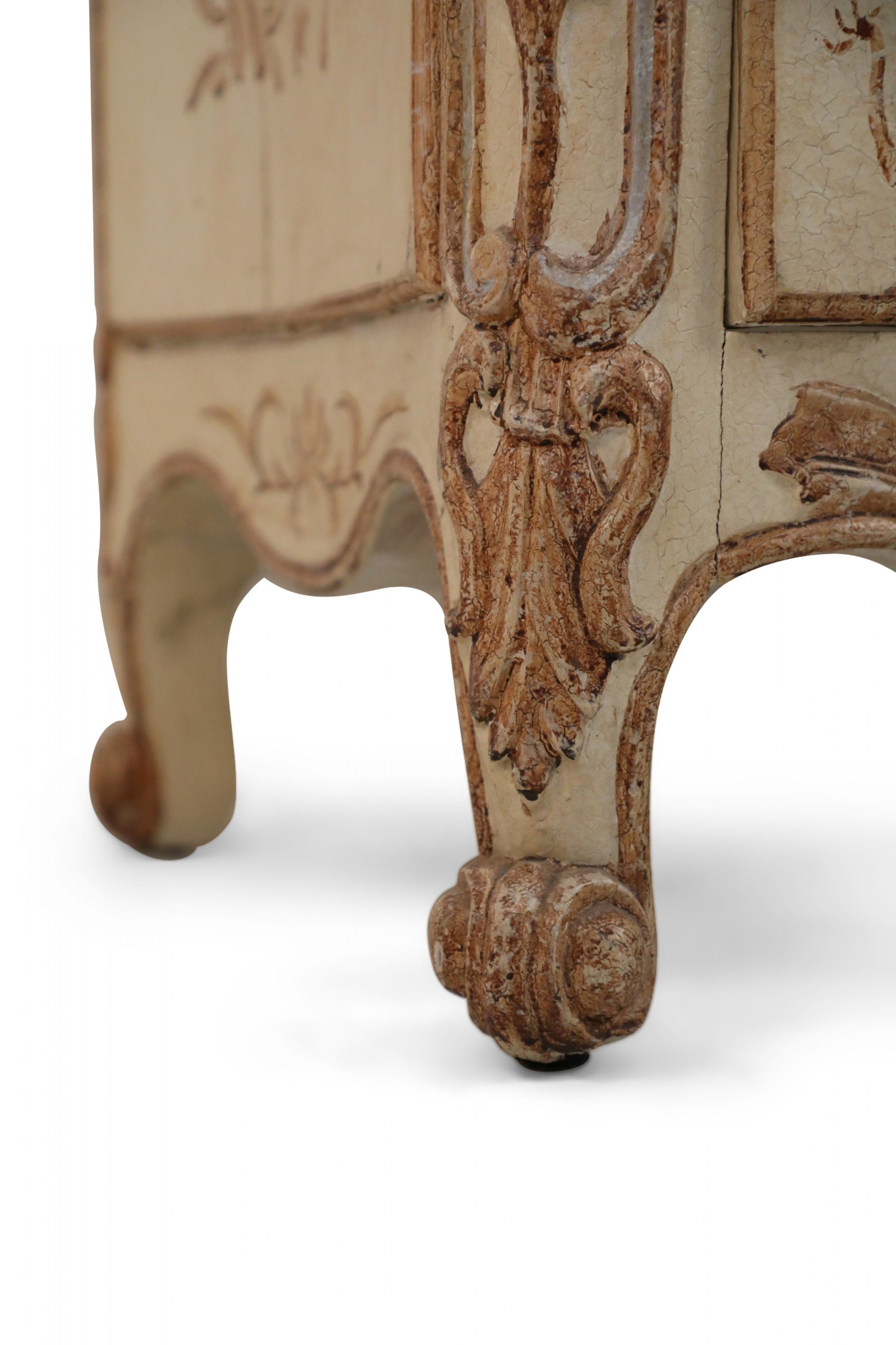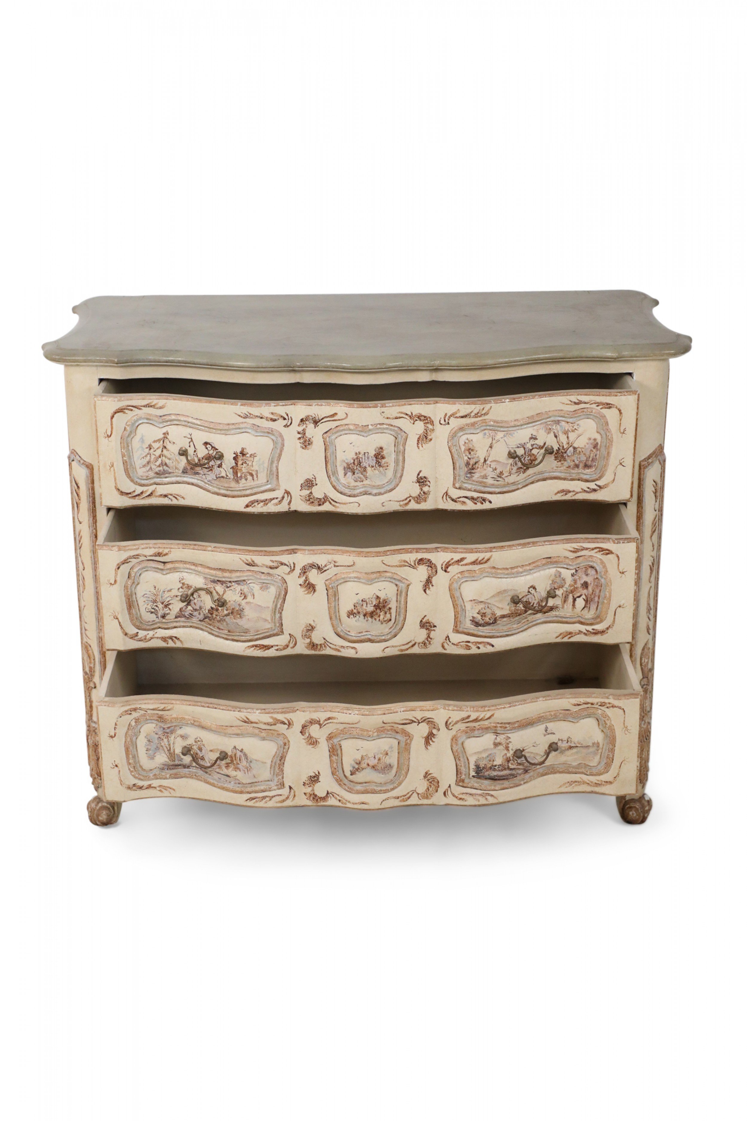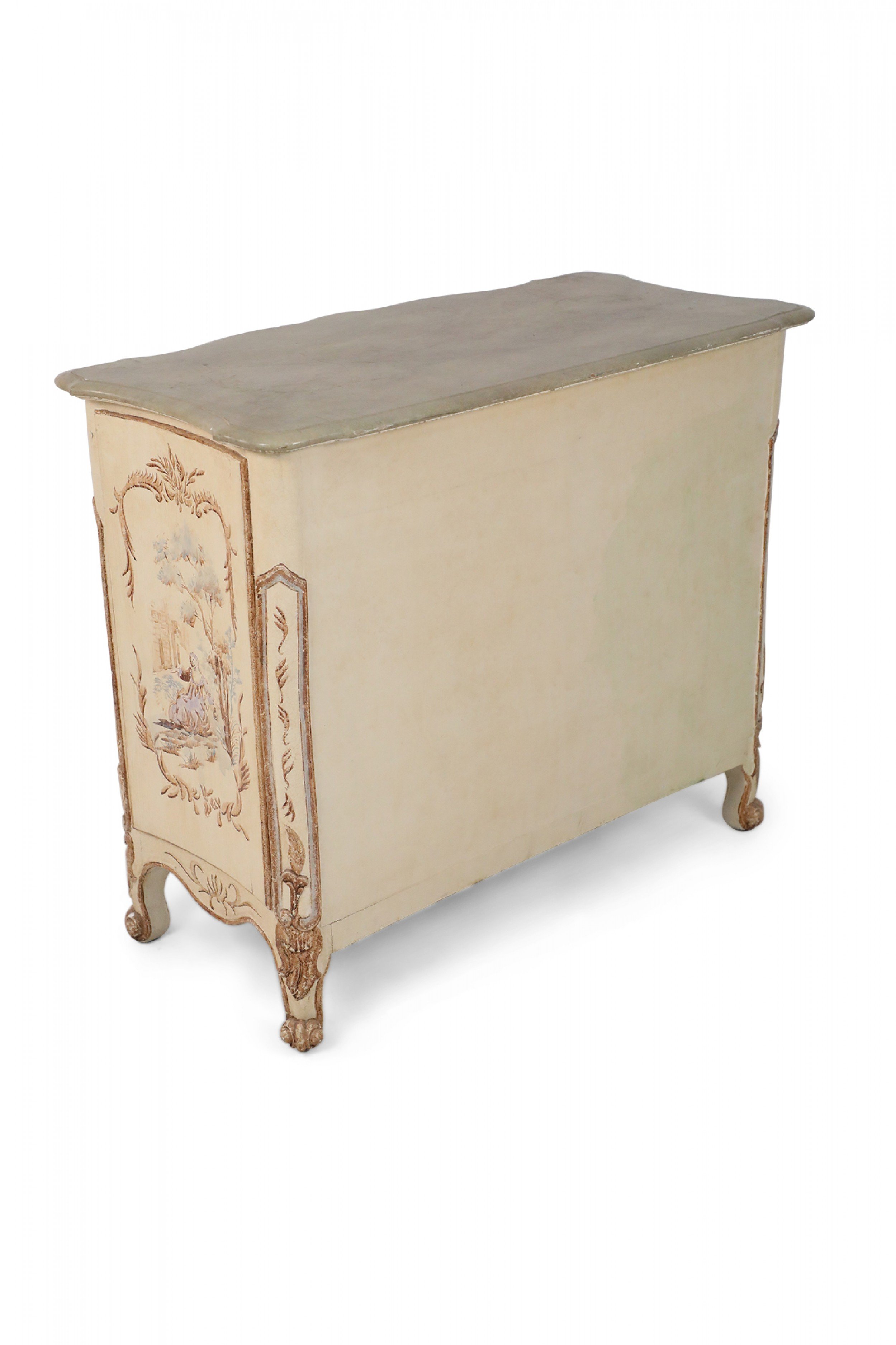 French Louis XV-style serpentine commode that contrasts a smooth, scalloped beige faux marble top with a wooden, cream-painted body of undulated drawers with brass pulls and petite, carved cabriole legs with ball feet connected by a carved, pierced apron..