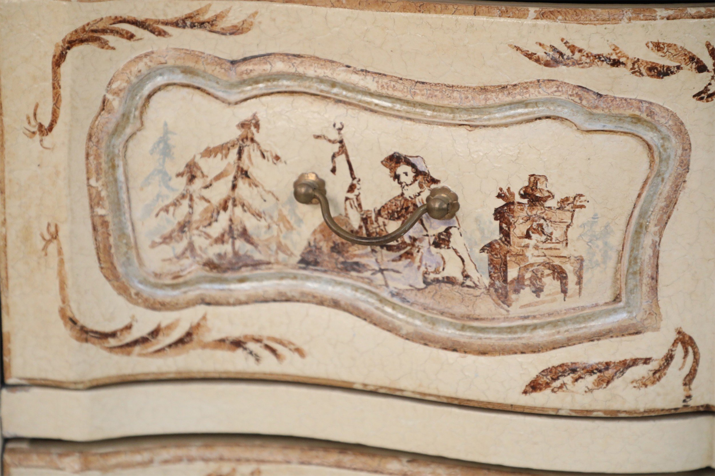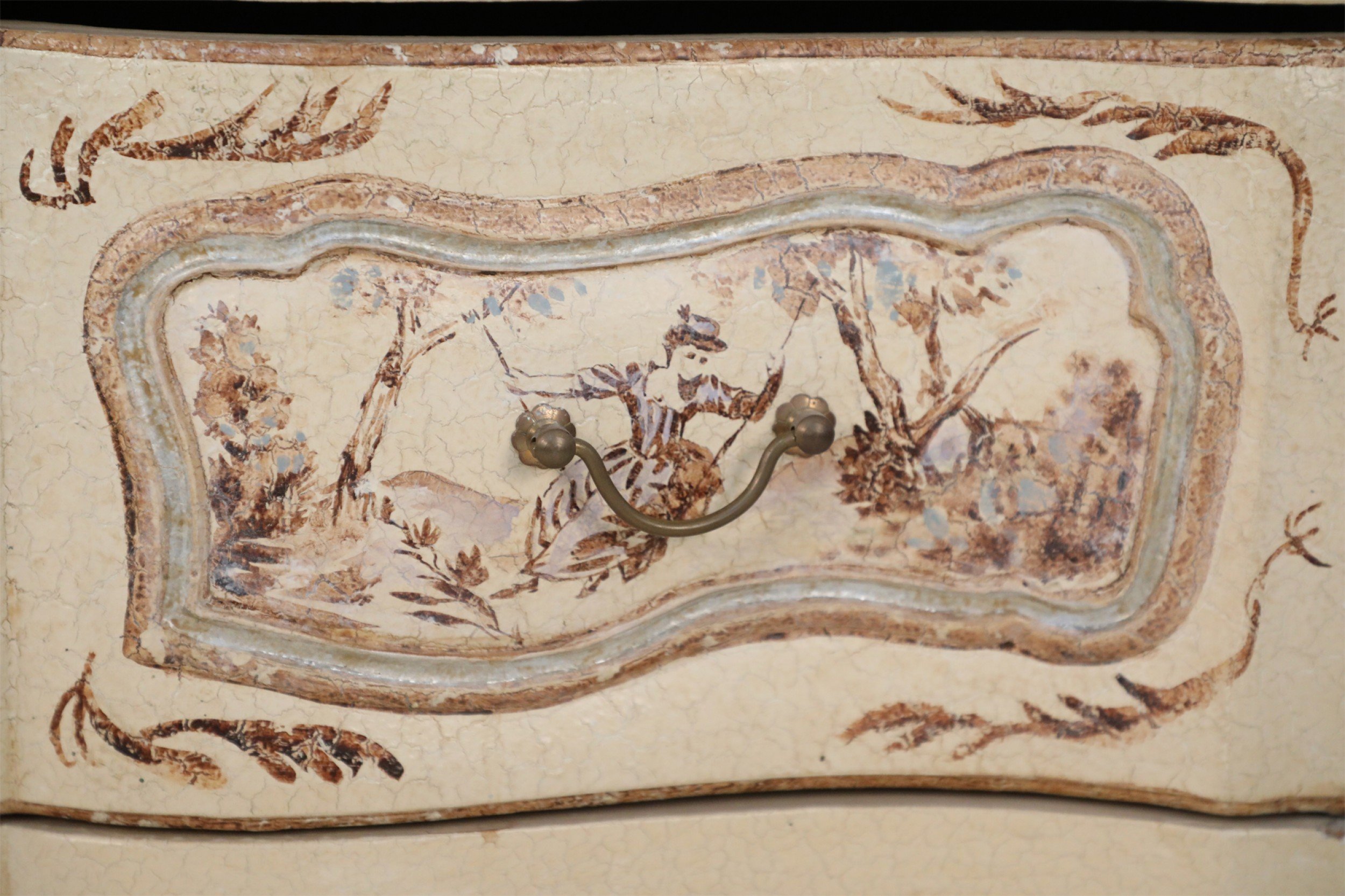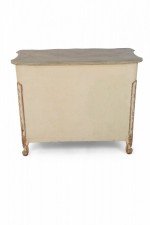 French Louis XV-style serpentine commode that contrasts a smooth, scalloped beige faux marble top with a wooden, cream-painted body of undulated drawers with brass pulls and petite, carved cabriole legs with ball feet connected by a carved, pierced apron.