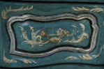 French Louis XV-style serpentine commode that contrasts a smooth, scalloped gray painted faux marble top with a wooden, teal-painted body of undulated drawers with gold pulls and petite, carved cabriole legs with ball feet connected by a carved, pierced apron. The commode is decorated with intricately-captured ribbon and leaf motifs along with figurative scenes of men holding umbrellas or fishing on the front and sides, rendered in yellow and cream. (Similar to NWL2320).