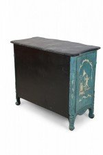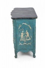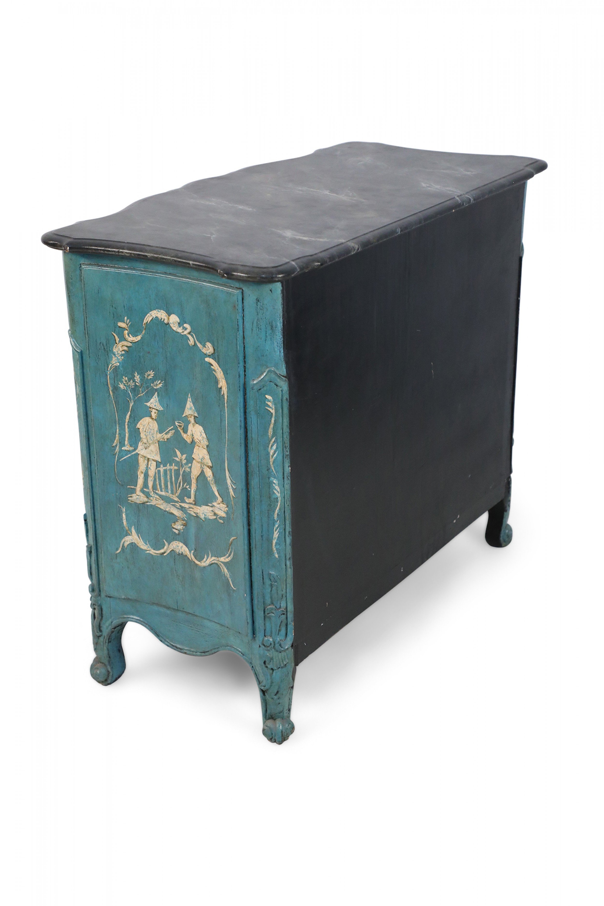 French Louis XV-style serpentine commode that contrasts a smooth, scalloped gray painted faux marble top with a wooden, teal-painted body of undulated drawers with gold pulls and petite, carved cabriole legs with ball feet connected by a carved, pierced apron. The commode is decorated with intricately-captured ribbon and leaf motifs along with figurative scenes of men holding umbrellas or fishing on the front and sides, rendered in yellow and cream. (Similar to NWL2320)..