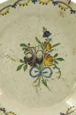 French Provincial Nevers (18th Century) faience plate with a center floral spray and a scalloped edge with hand painted border in blue and yellow.