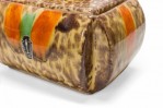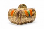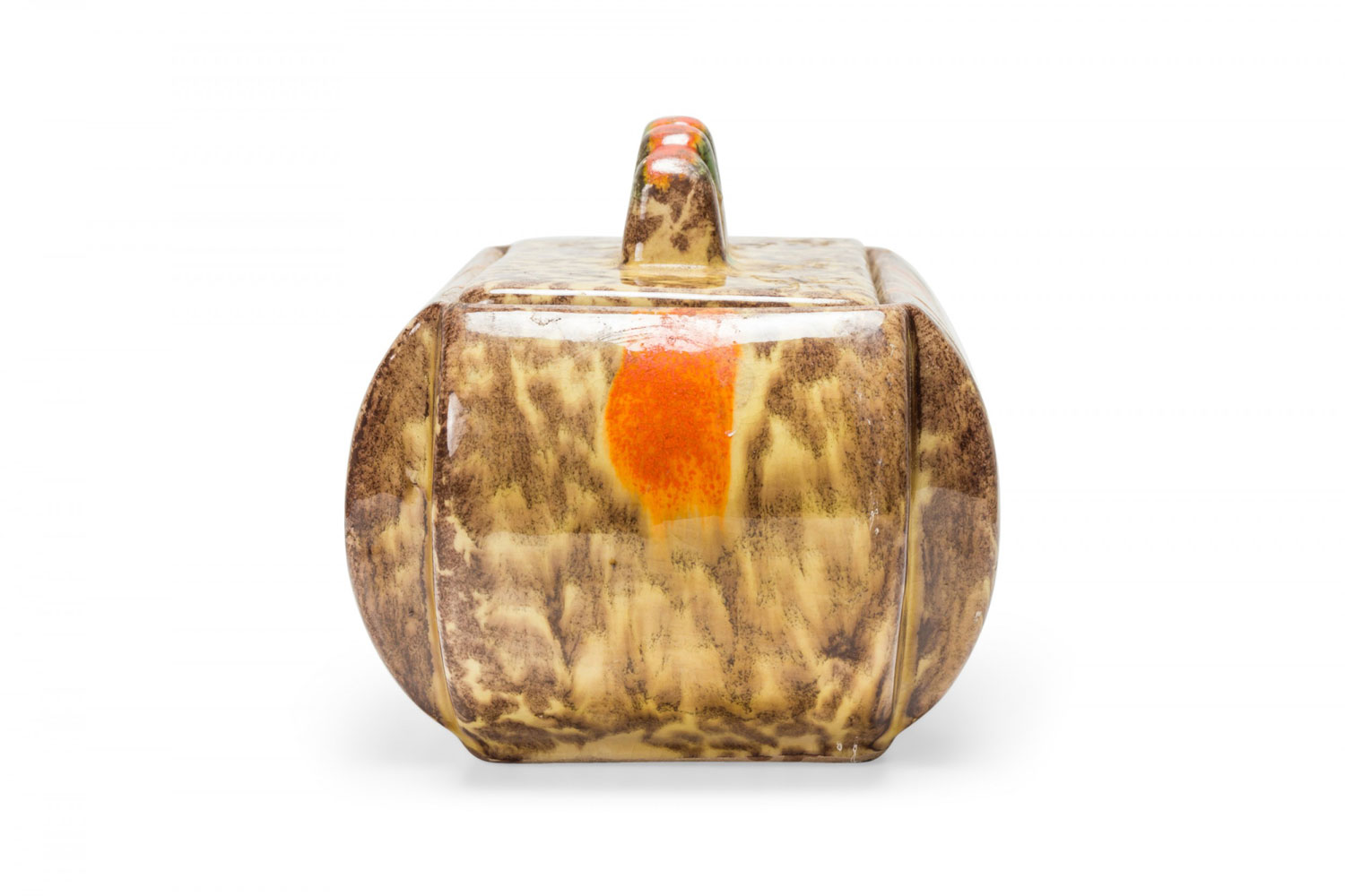 German Mid-Century ceramic lidded box with rounded sides and an incised lid handle, and an orange and green brushed shape on the side against a beige and brown specked glazed ground. (numbered on bottom, 11).