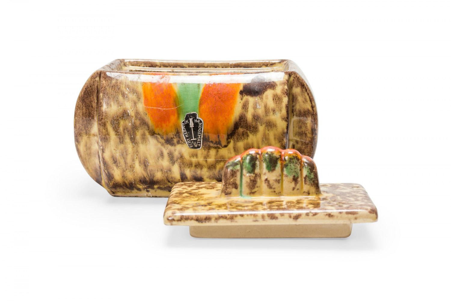 German Mid-Century ceramic lidded box with rounded sides and an incised lid handle, and an orange and green brushed shape on the side against a beige and brown specked glazed ground. (numbered on bottom, 11)