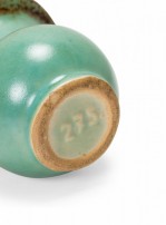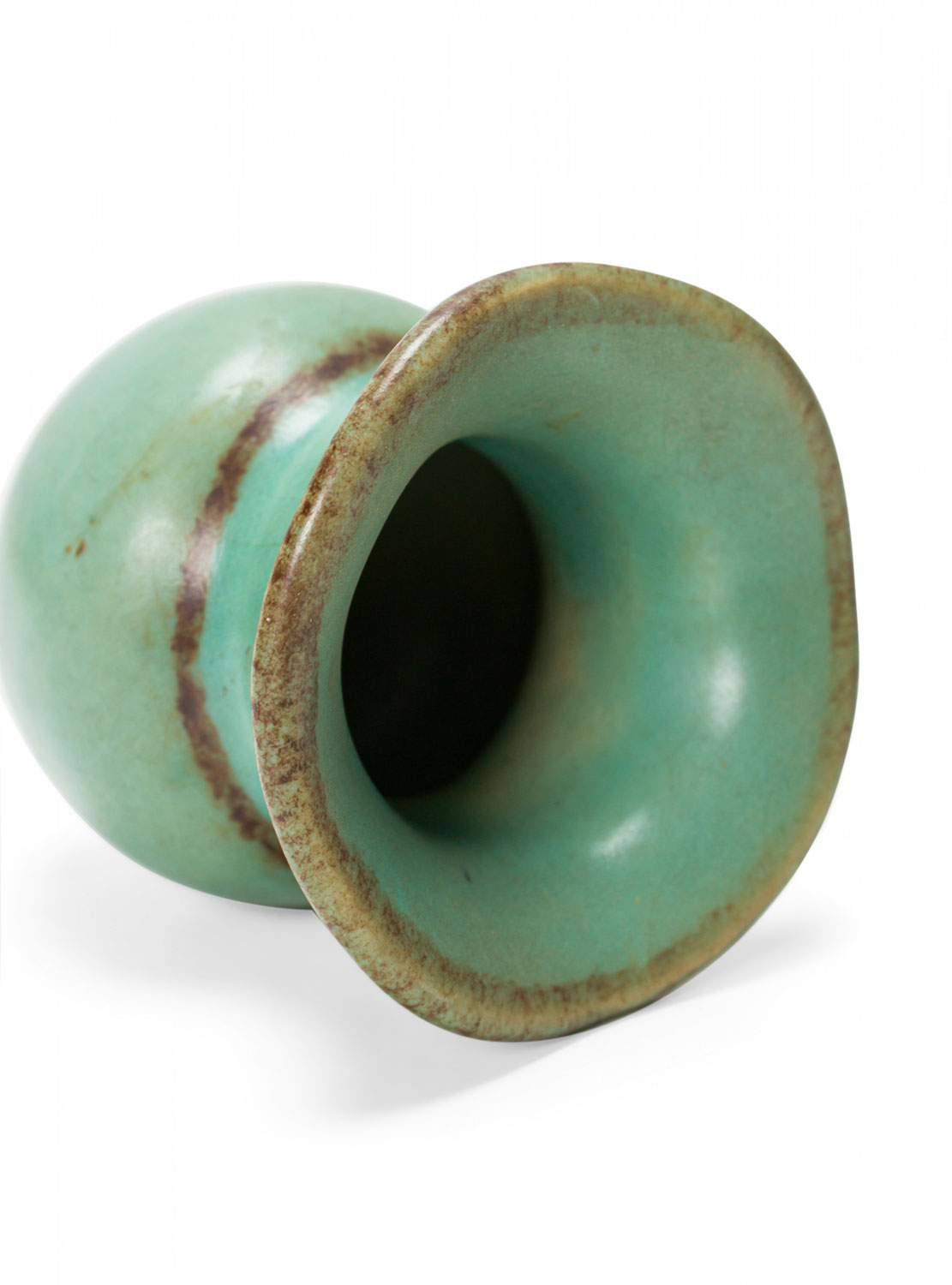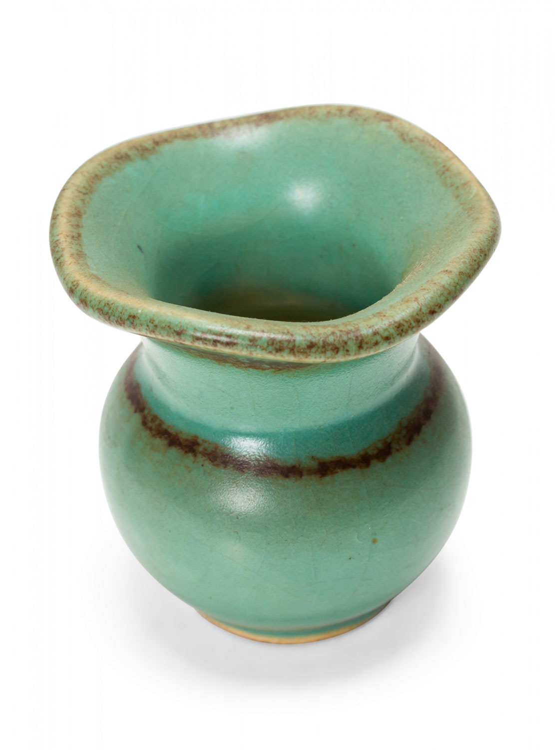 German Mid-Century flared mouth ceramic vase with a bulbous bottom and a sage green glaze with brown trim. (numbered on bottom, 275)