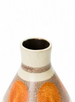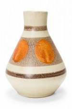 German Mid-Century ceramic vase with a tapered body and circular vase featuring a banded desgin of thick brown lines on either side of an orange circle and grey background band against a beige glazed ground with a narrower cylindrical neck and dark interior glaze. (numbered on bottom: 3185)(Similar piece: 063089)