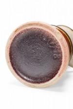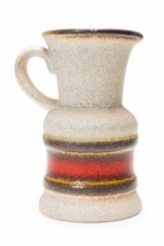 German Mid-Century ceramic pitcher with a brown and red inset band around the body below a flared opening and handle with a textured beige finish and brown interior. (numbered on bottom)
