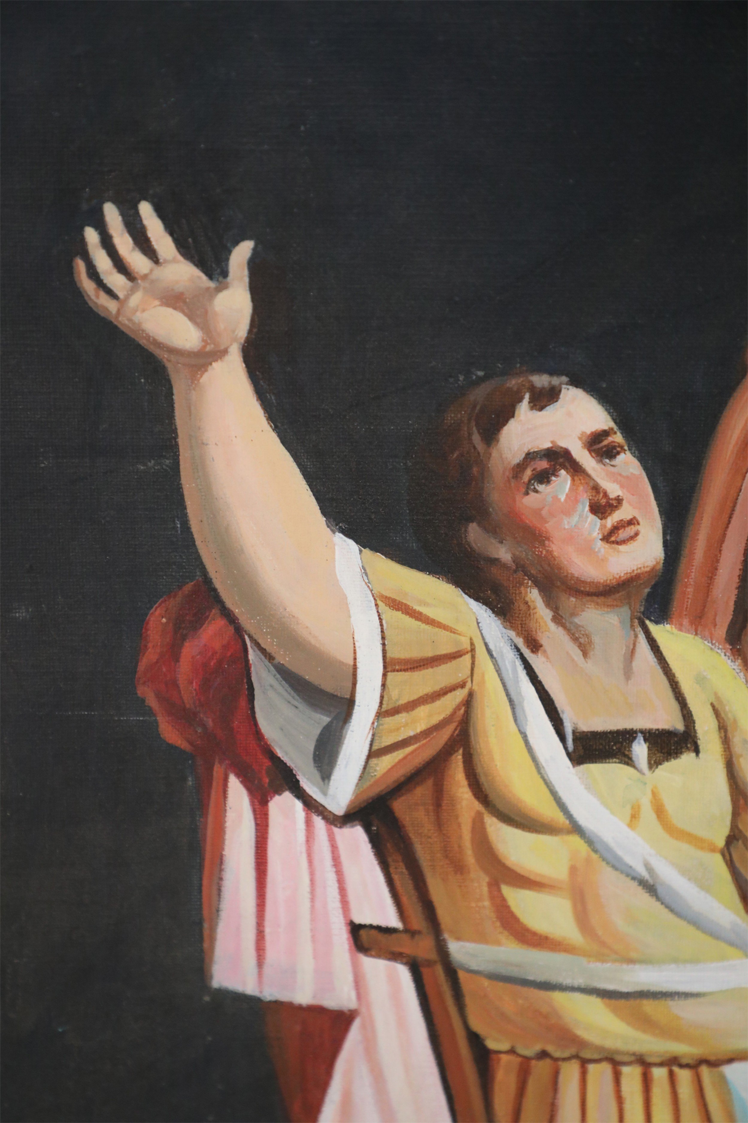 Italian Neo-classic style (20th Century) unframed canvas oil painting of a gladiator seated in front of a blue tent with gold fringed drapes, making a grand gesture while four others look on adoringly (Similar painting in slightly muted colors: NWL2287A).