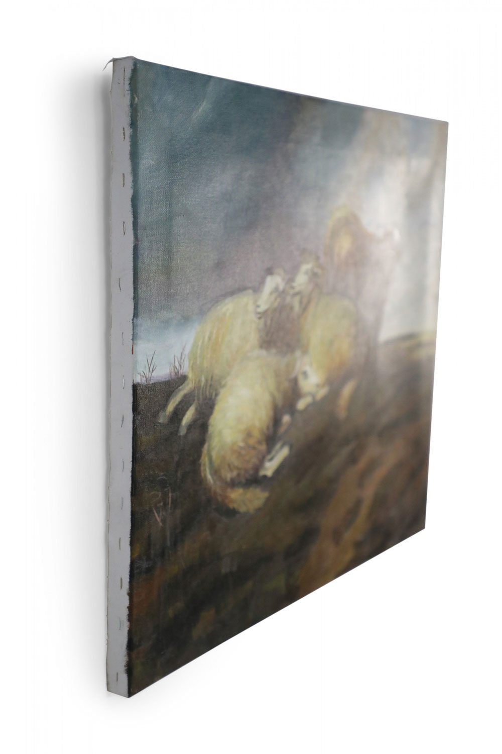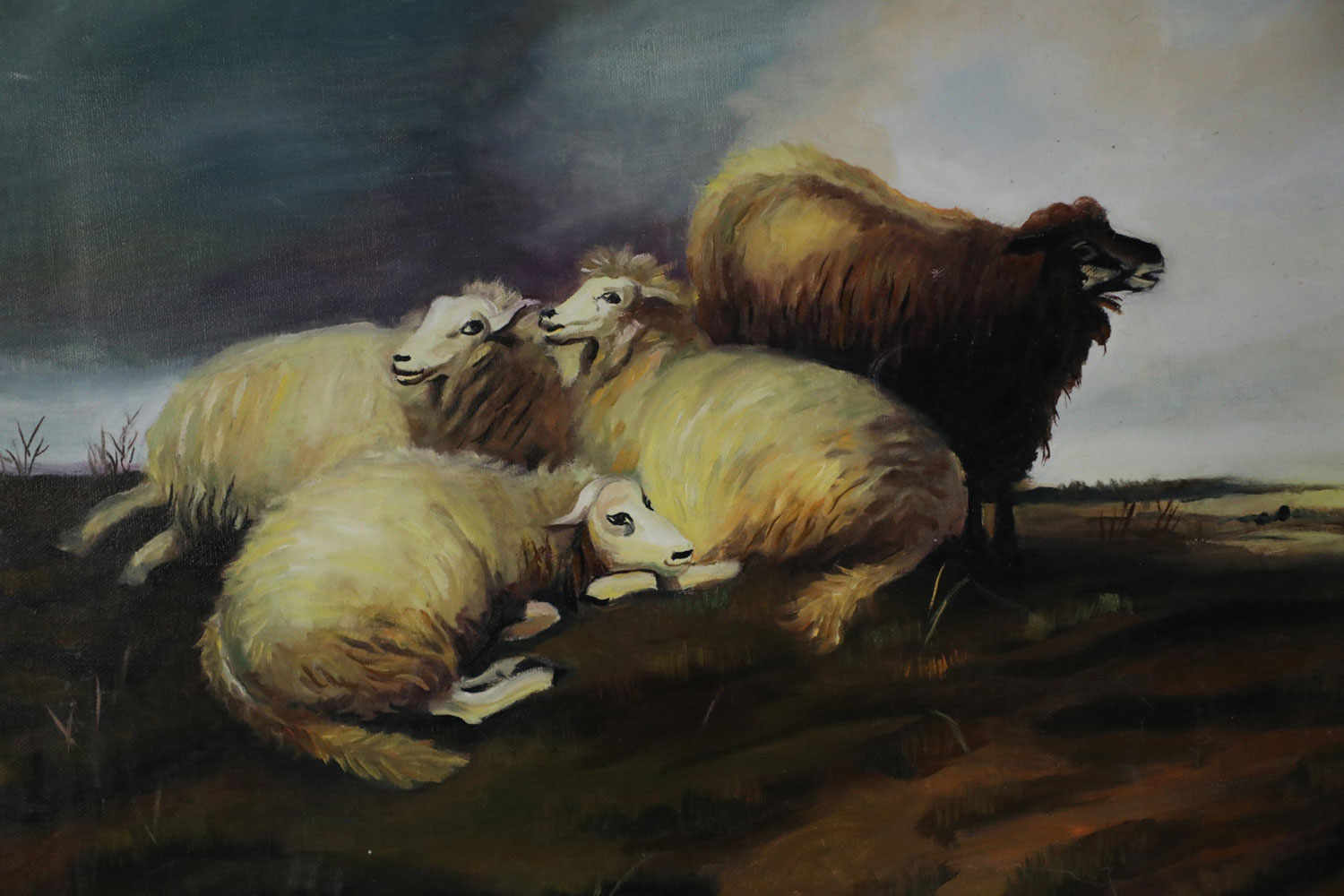 English Victorian style (20th Century) oil painting capturing a group of sheep huddled in a field of browns and greens, under a cloudy, darkening sky on rectangular, unframed canvas (Similar copies of same piece with minor variations: NWL2263A, NWL2263C)..