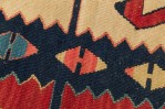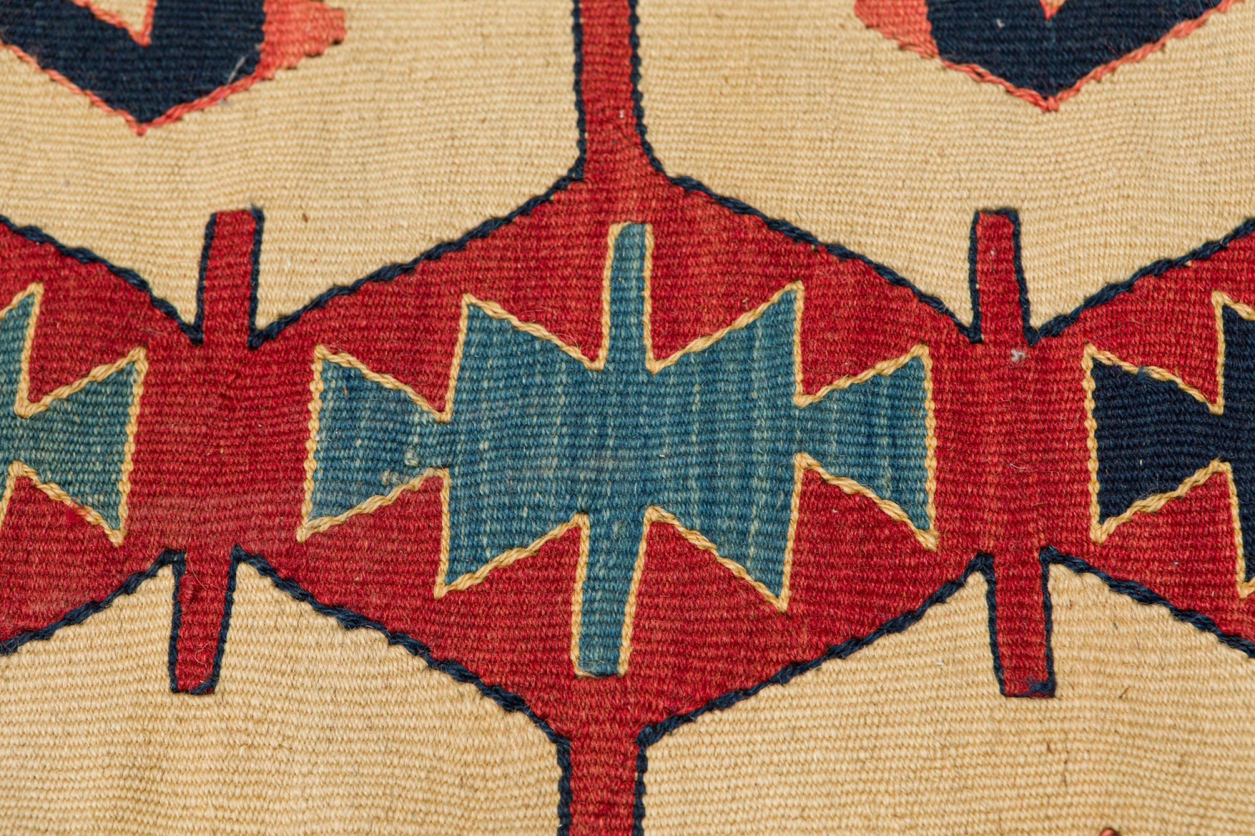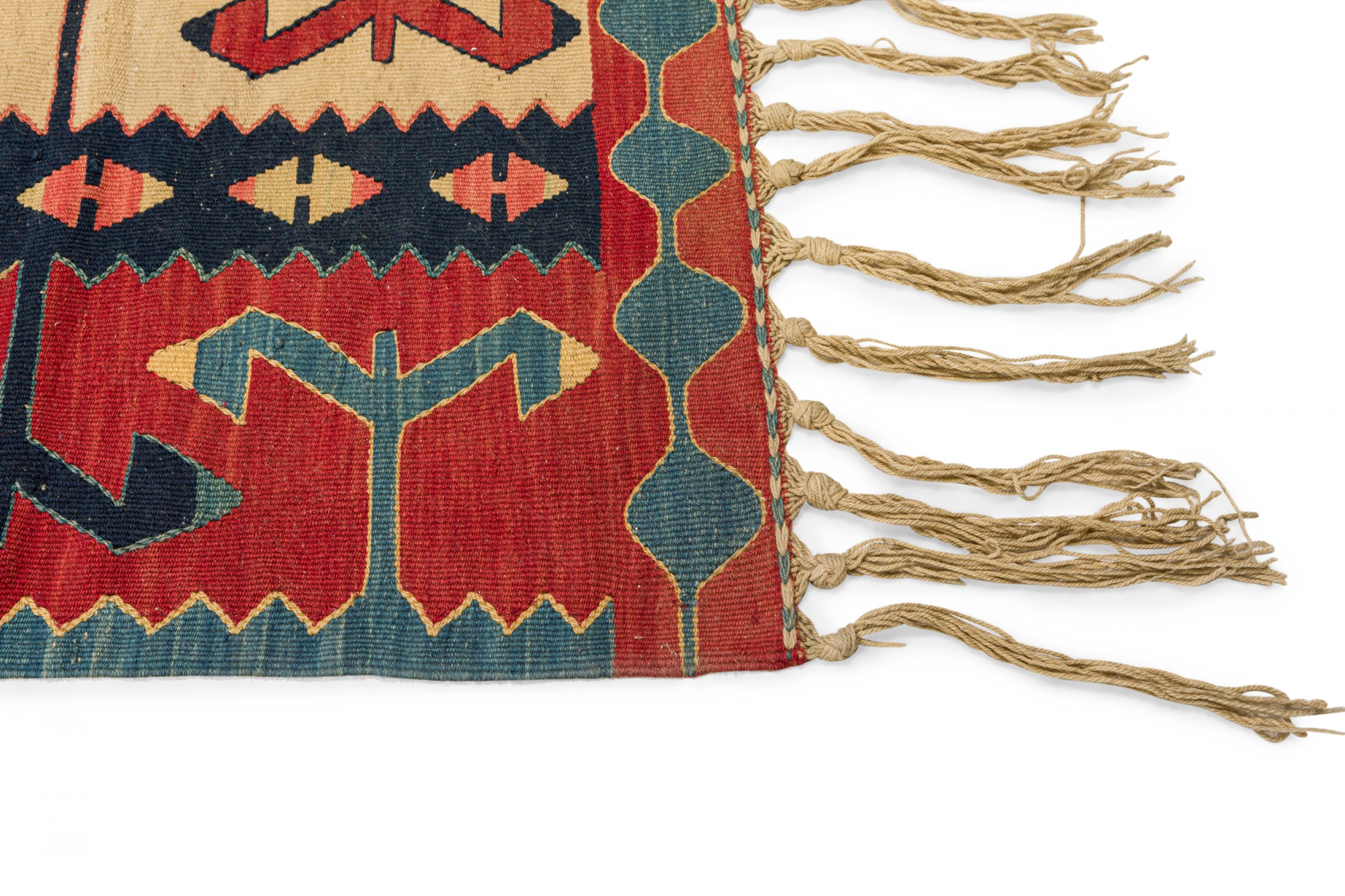 Indigenous American Woven Patterned Red, Blue, and Beige Rectangular Fringed Rug