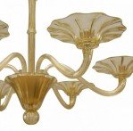 3 Italian Murano gold dusted fluted glass 6 arm chandeliers with scroll shaped arms issuing from a simulated bamboo stem with large dish shaped bobeche (PRICED EACH).