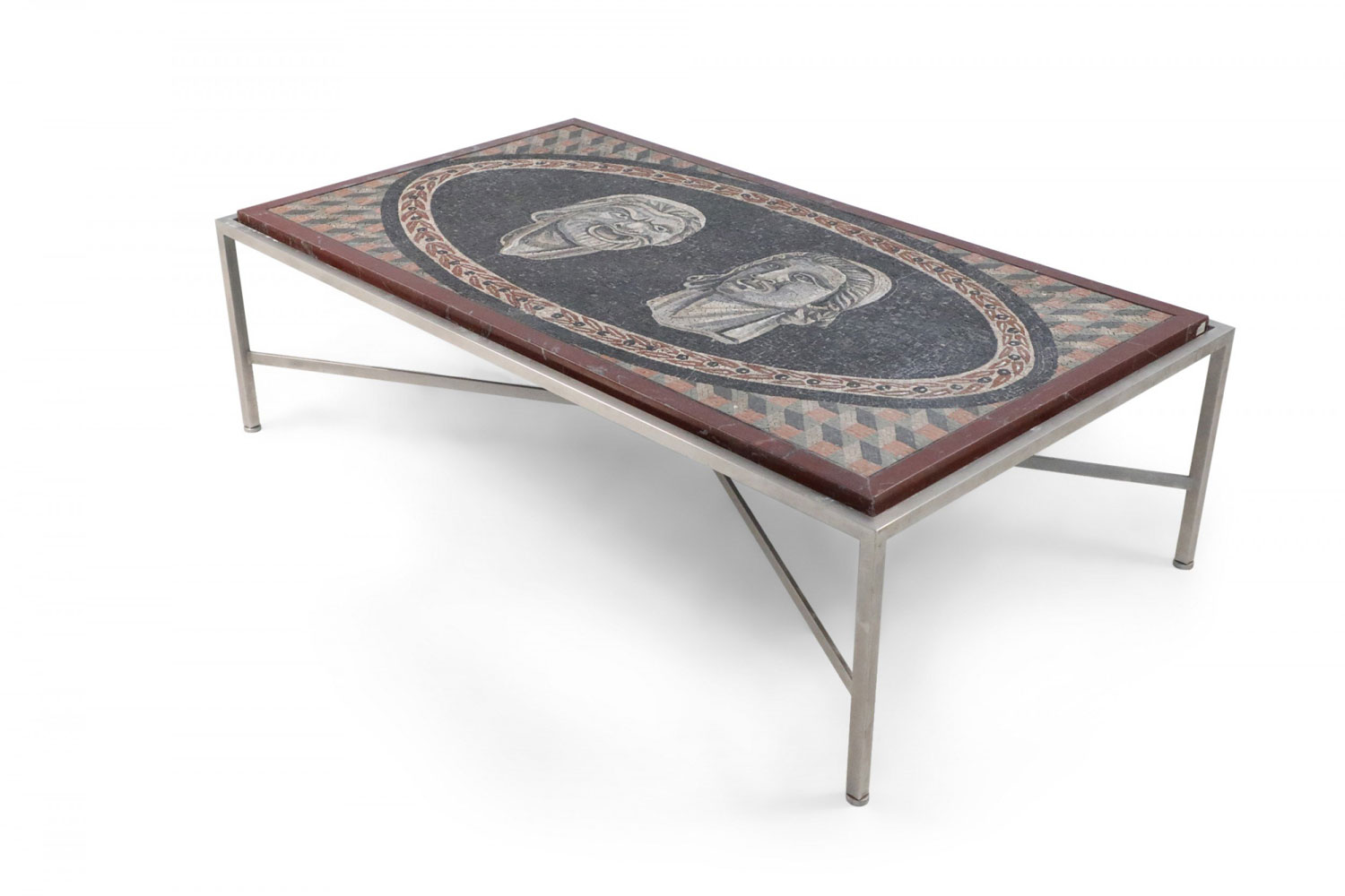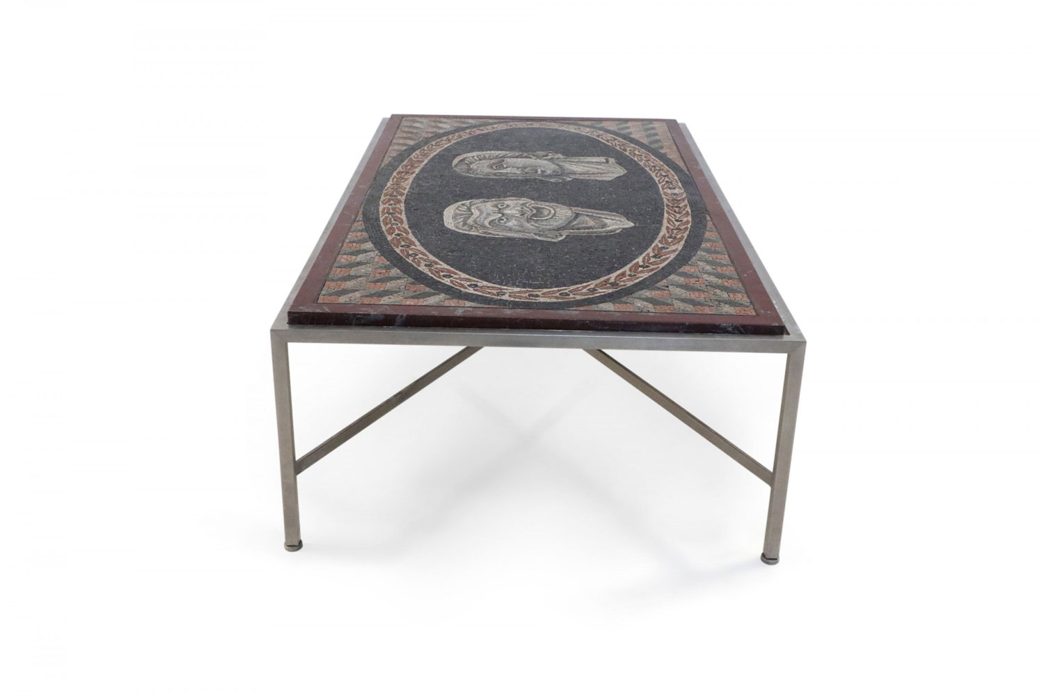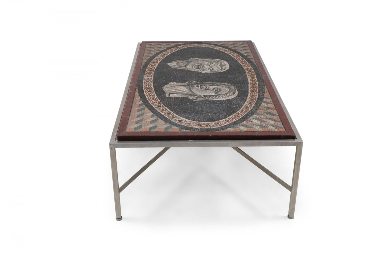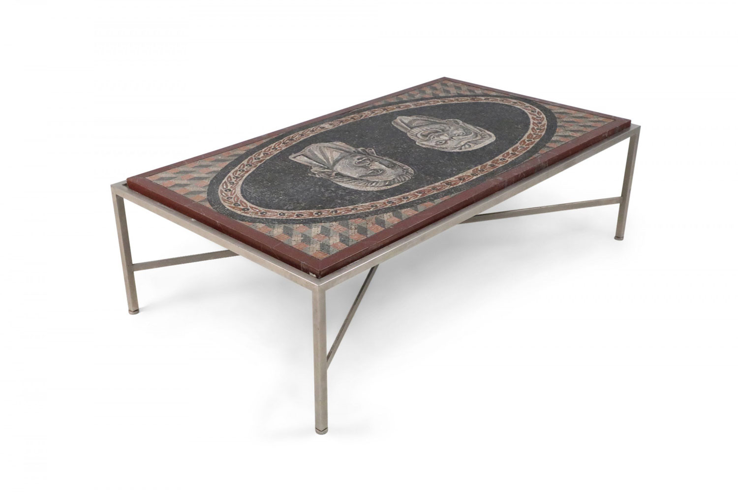 Italian (19th Century) rectangular coffee table with mosaic marble top showing 2 Roman faces set in a steel base with a stretcher..