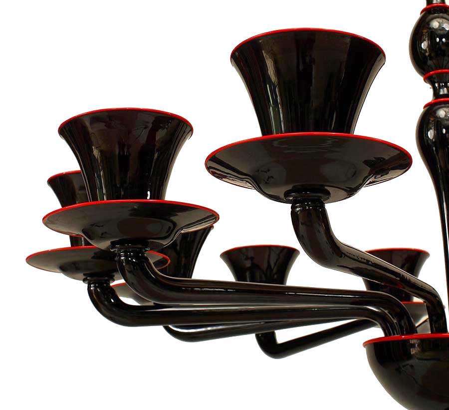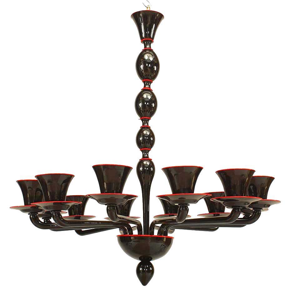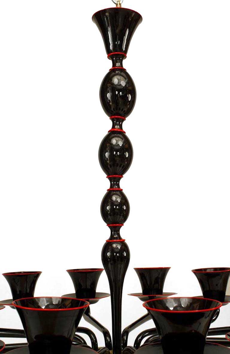 Italian Venetian Murano (1940's) "Flaubert" model 12 arm chandelier composed of dark purple & red-trimmed glass with large cups & bowls emanating from a segmented shaft & bottom finial (att: BAROVIER & TOSO).