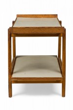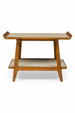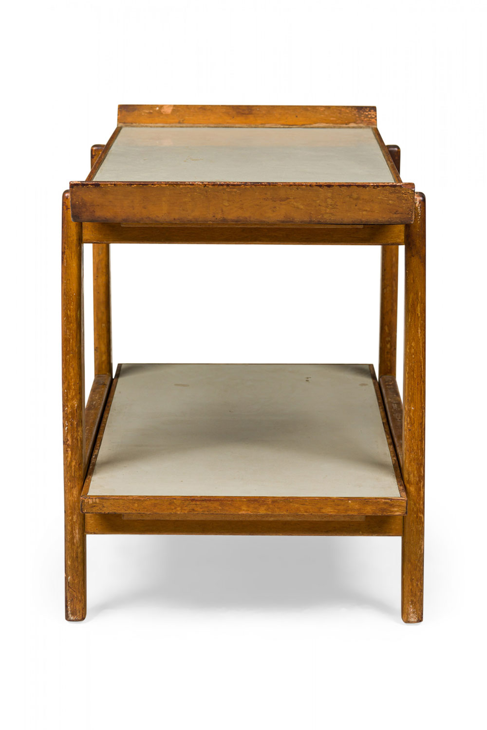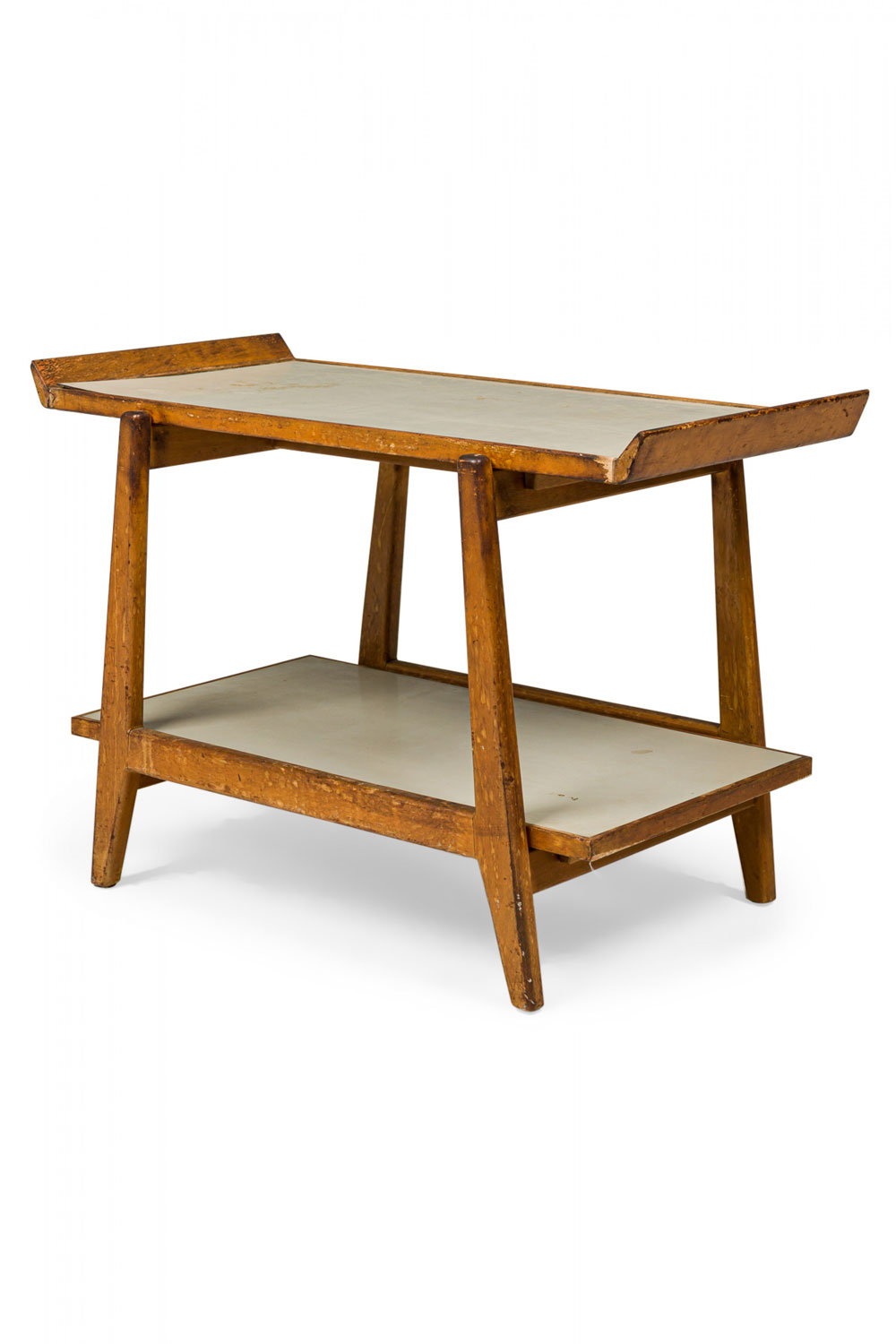 Danish Mid-Century two-tier serving table with a birch frame, light gray laminate shelf surfaces, and a removable tray top. (JENS RISOM).