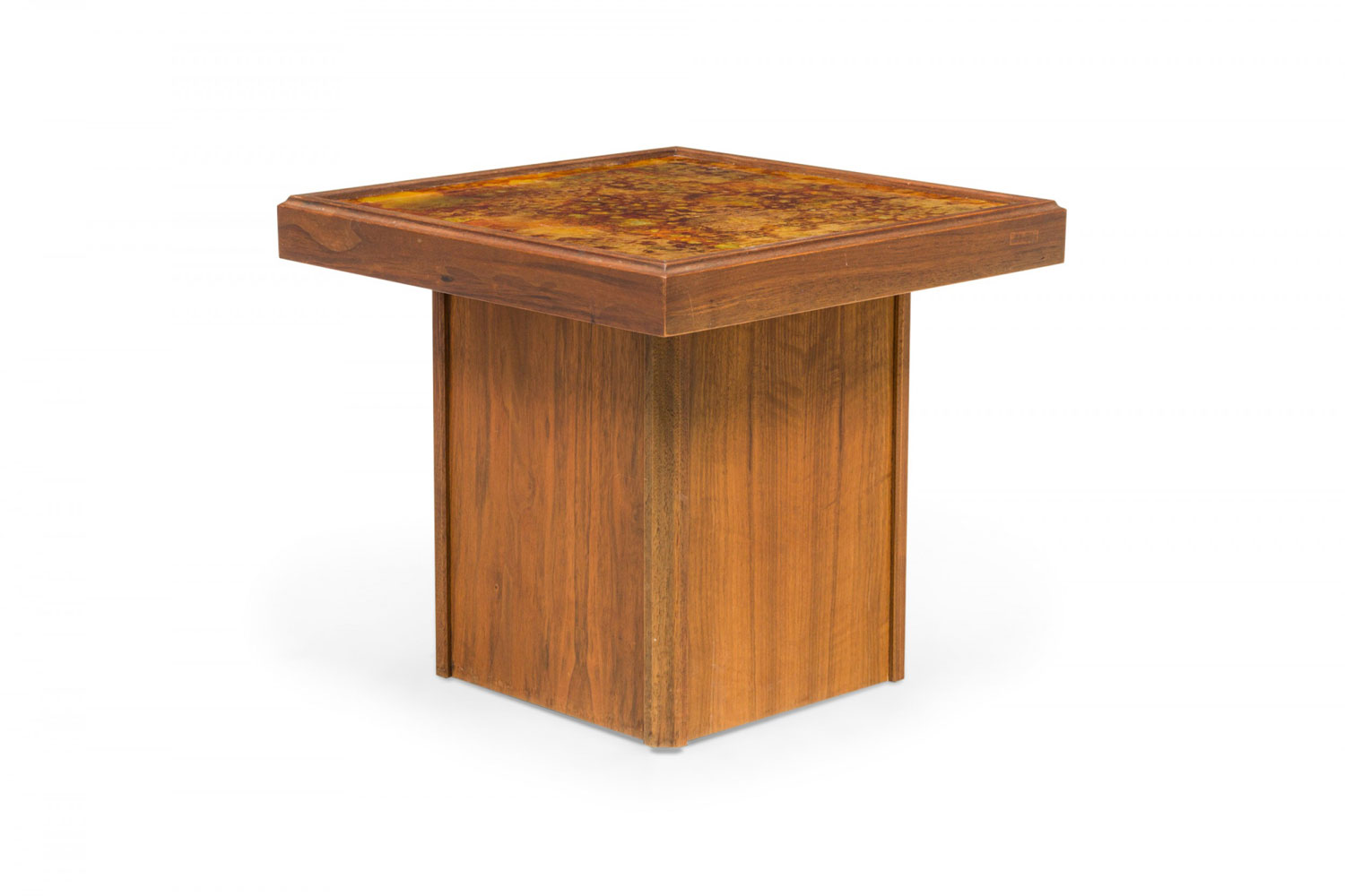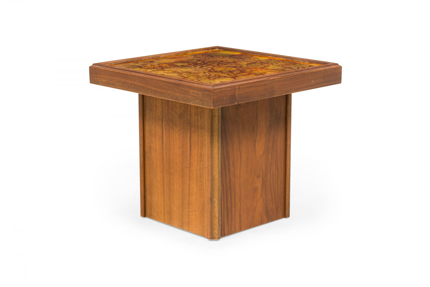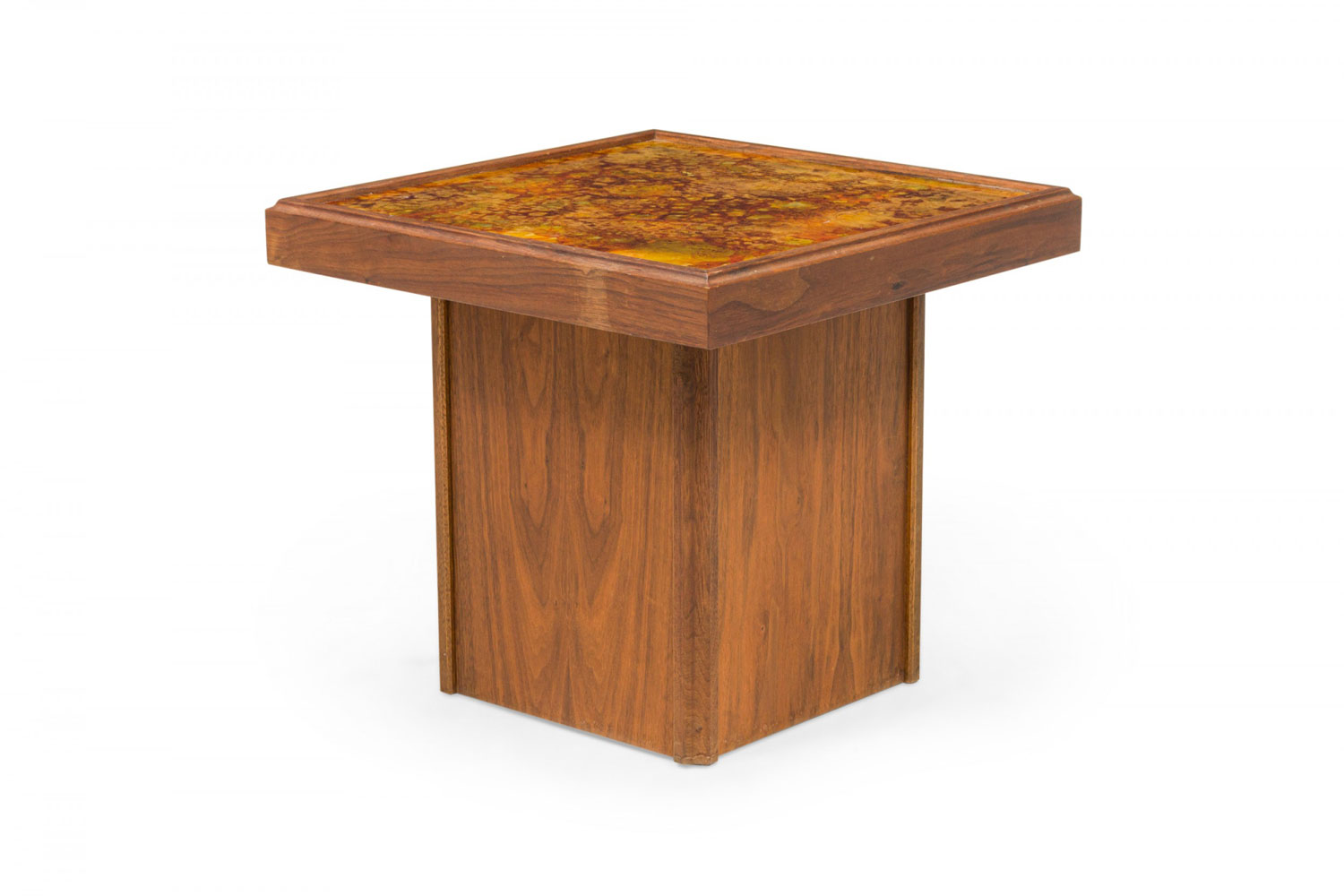 PAIR of American Mid-Century square end / side tables with reverse painted glass tops mounted in a walnut frame, supported by a smaller square walnut pedestal base. (JOHN KEAL FOR BROWN SALTMAN)(PRICED AS PAIR)