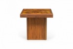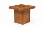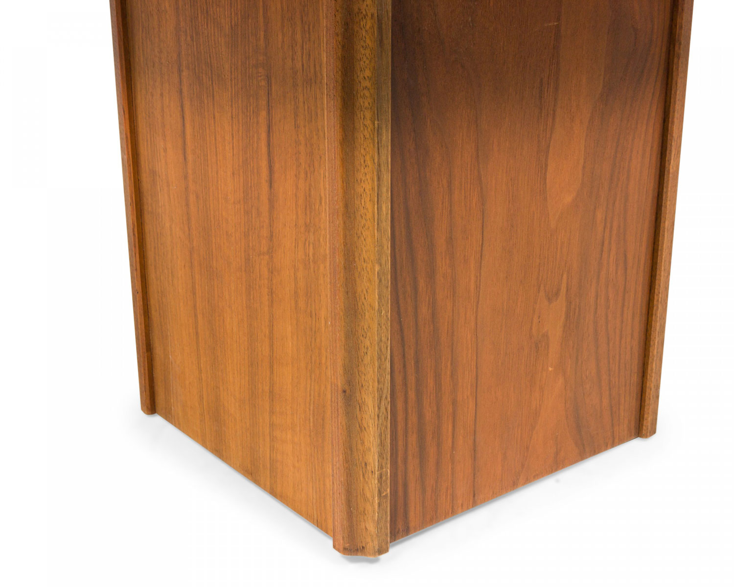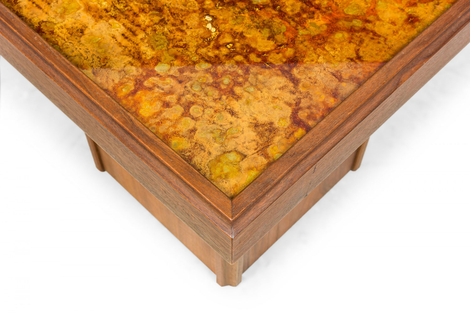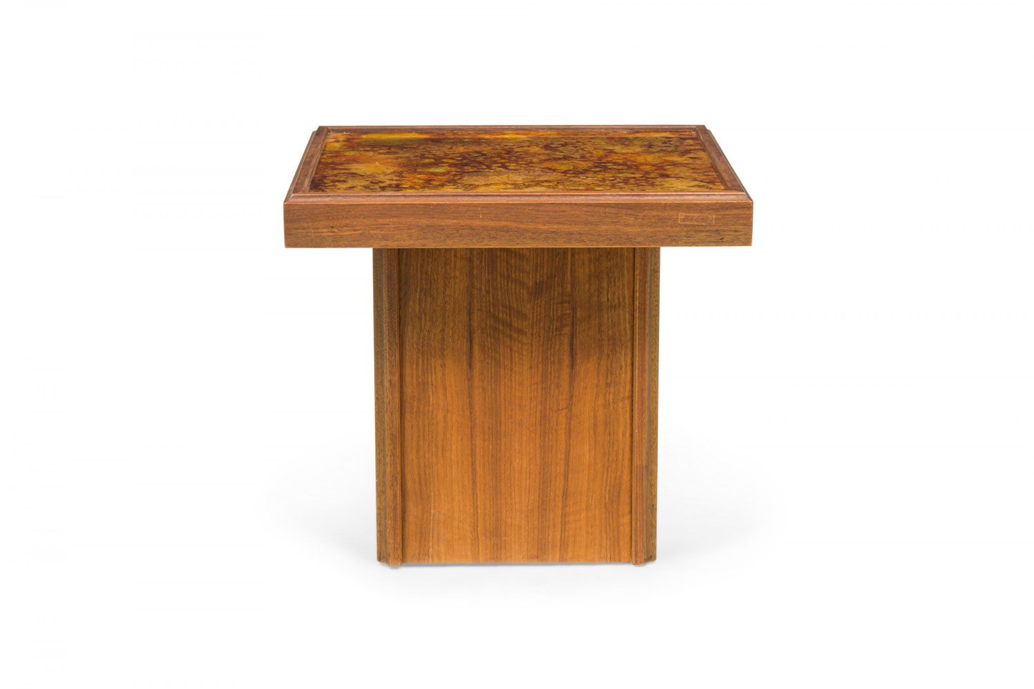 PAIR of American Mid-Century square end / side tables with reverse painted glass tops mounted in a walnut frame, supported by a smaller square walnut pedestal base. (JOHN KEAL FOR BROWN SALTMAN)(PRICED AS PAIR)