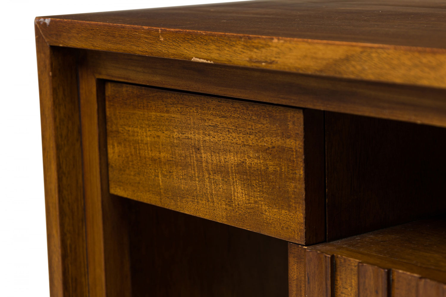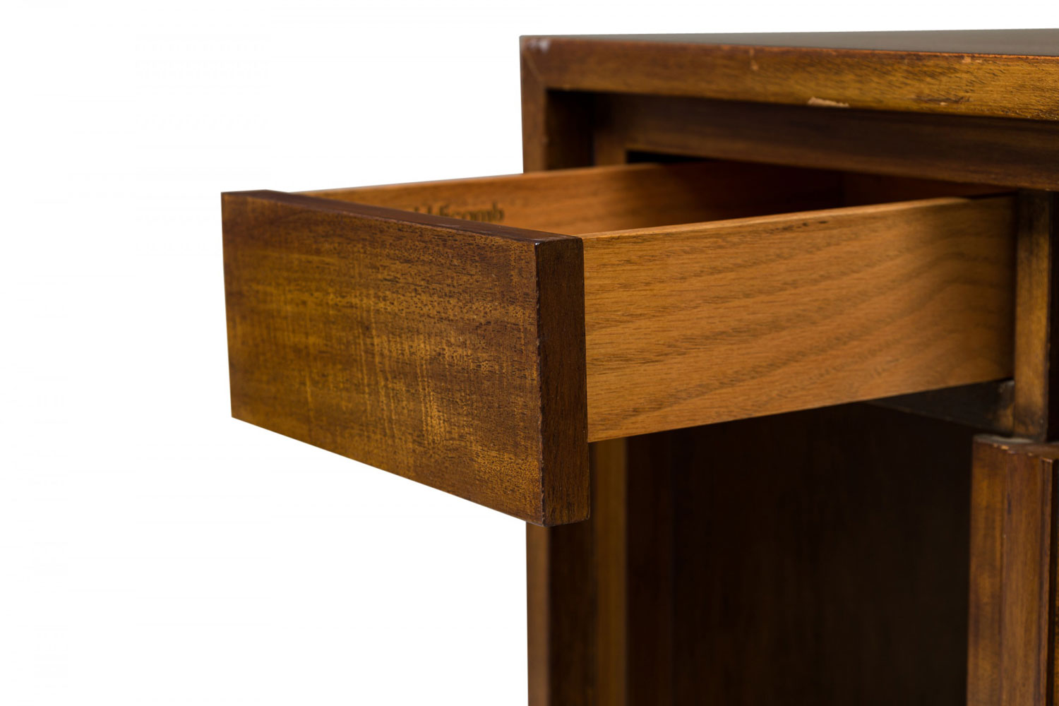 Style: Mid-Century Materials & Techniques: Mirror, walnut, wood Category: Tables, Bedroom Good; Wear consistent with age and use
