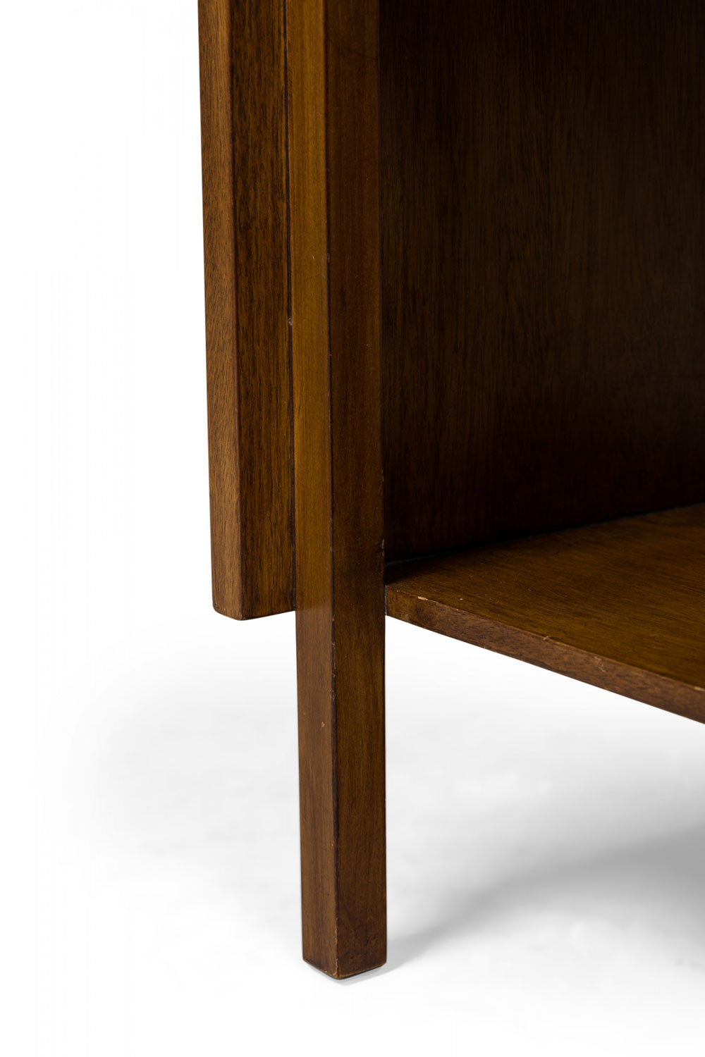 PAIR American Mid-Century walnut bedside tables / end tables with mirrored drawer and cabinet arrangements, including a single drawer and an open compartment over a mirrored base arrangement comprised of an open cabinet and a larger closed cabinet with a slat front door, resting on four square walnut legs. (JOHN STUART)(PRICED AS PAIR)(Additional single cabinet: DUF0125C)