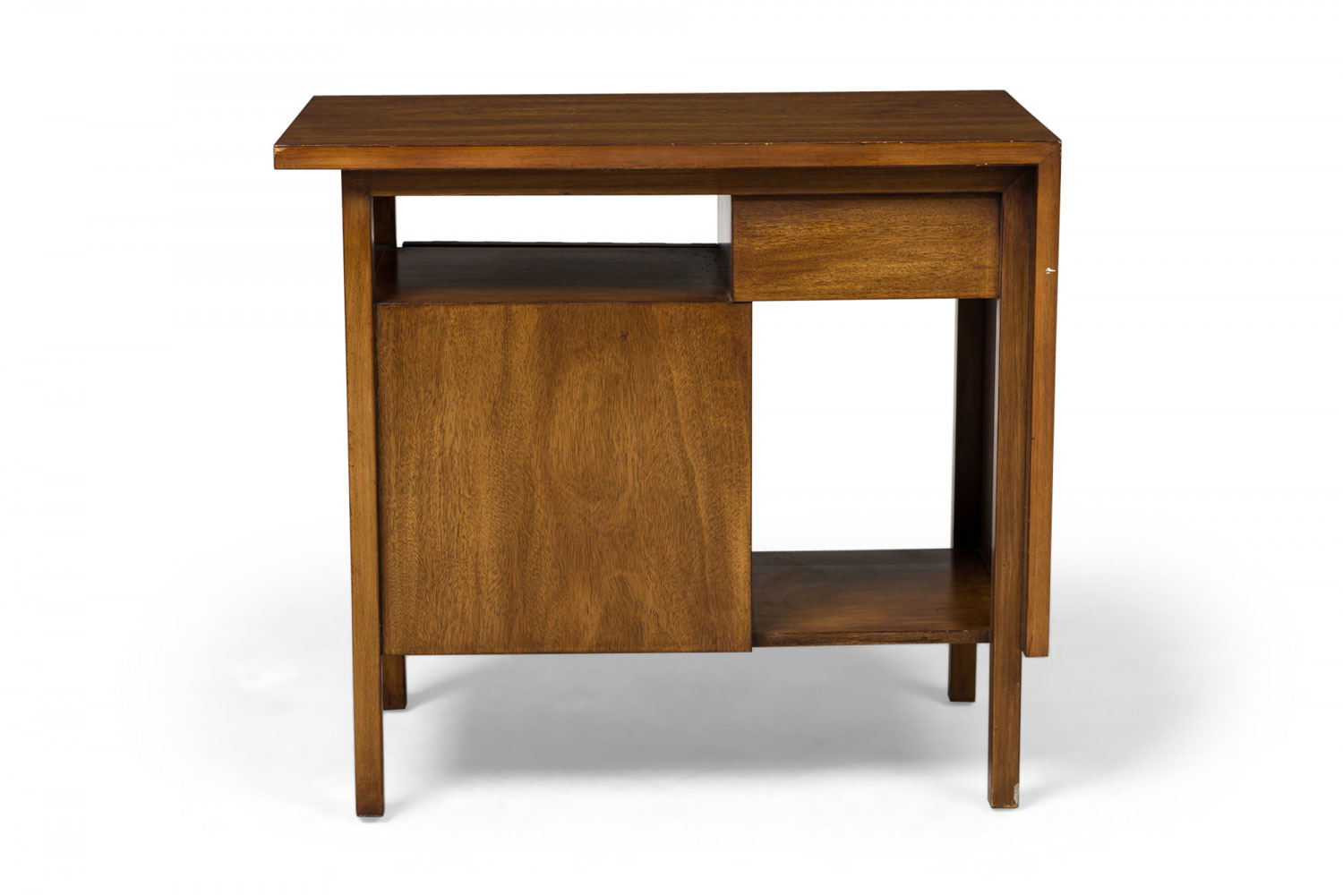 PAIR American Mid-Century walnut bedside tables / end tables with mirrored drawer and cabinet arrangements, including a single drawer and an open compartment over a mirrored base arrangement comprised of an open cabinet and a larger closed cabinet with a slat front door, resting on four square walnut legs. (JOHN STUART)(PRICED AS PAIR)(Additional single cabinet: DUF0125C).