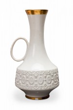 German Mid-Century handled porcelain vase / pitcher with a wide body with a raised geometric pattern extending upware to a long narrow flared neck with a small circular handle and a gilt rim and base. (mark on bottom, ROYAL PORZELLAN BAVARIA KPM GERMANY HANDARBEIT).