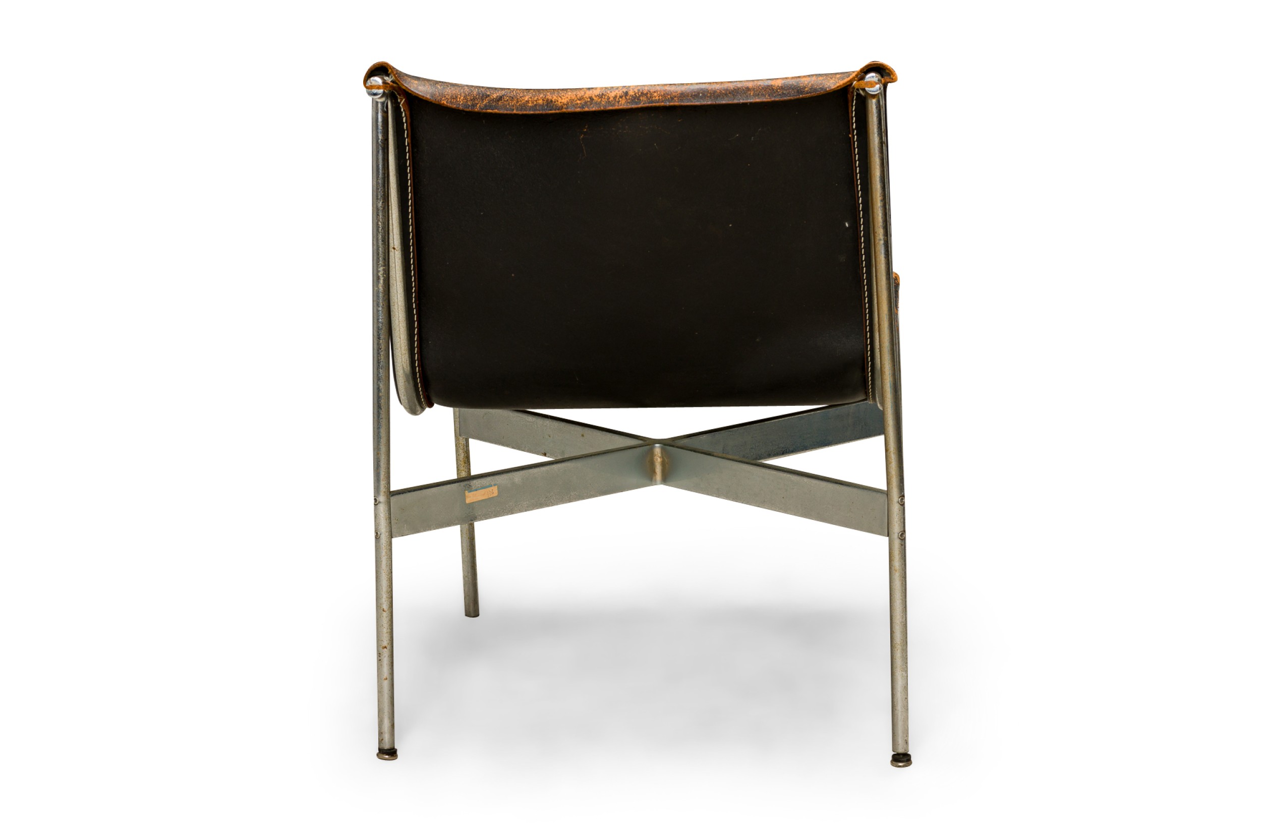 PAIR of Mid-Century Modern sling lounge chairs with polished chrome frames with an X-shaped stretcher beneath a leather sling seat and back. (KATAVOLOS, LITTELL, & KELLEY FOR LAVERNE)( PRICED AS PAIR).