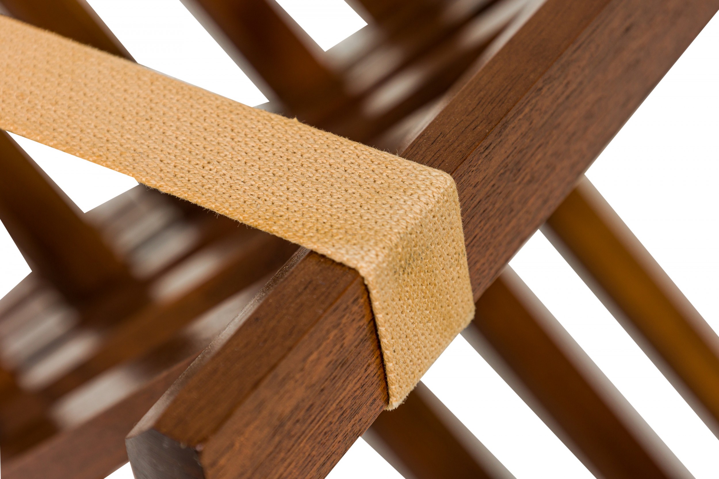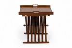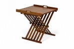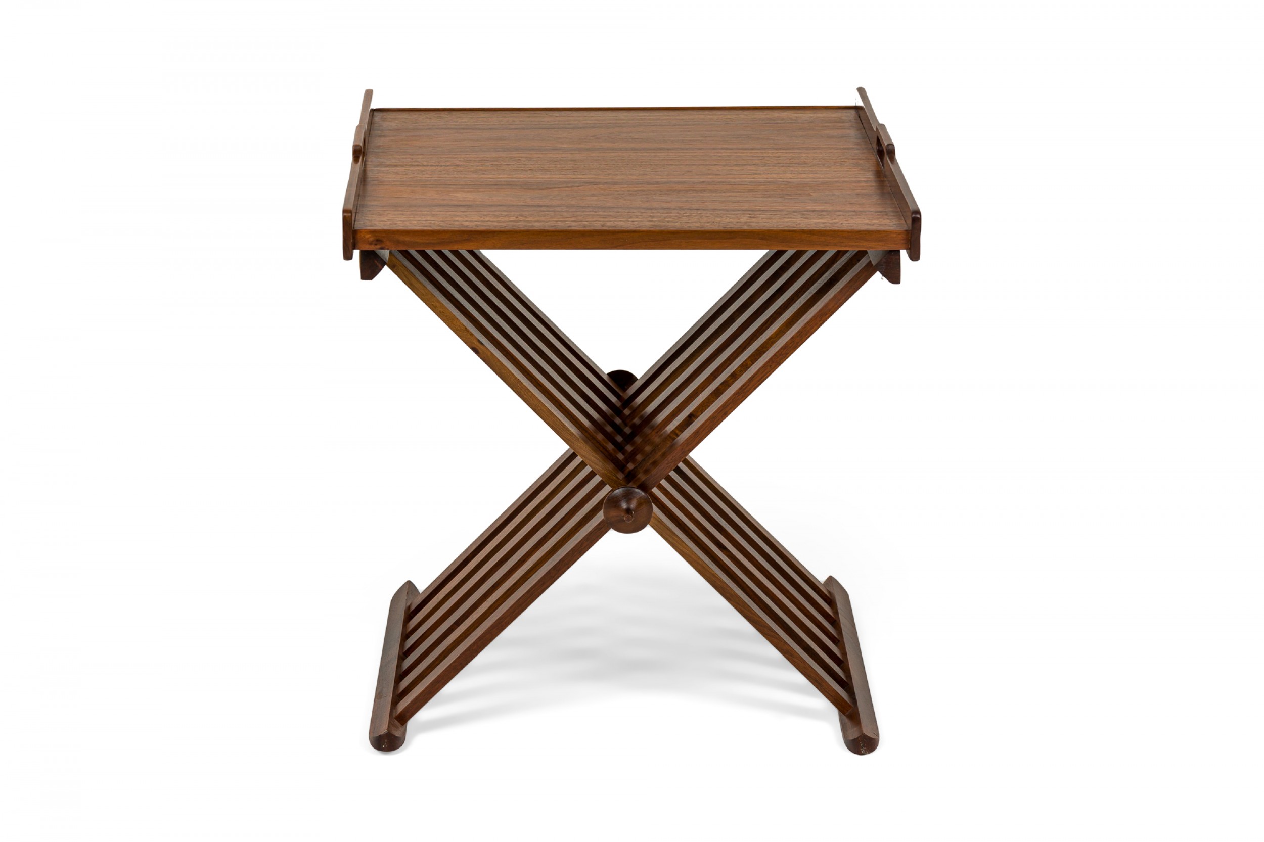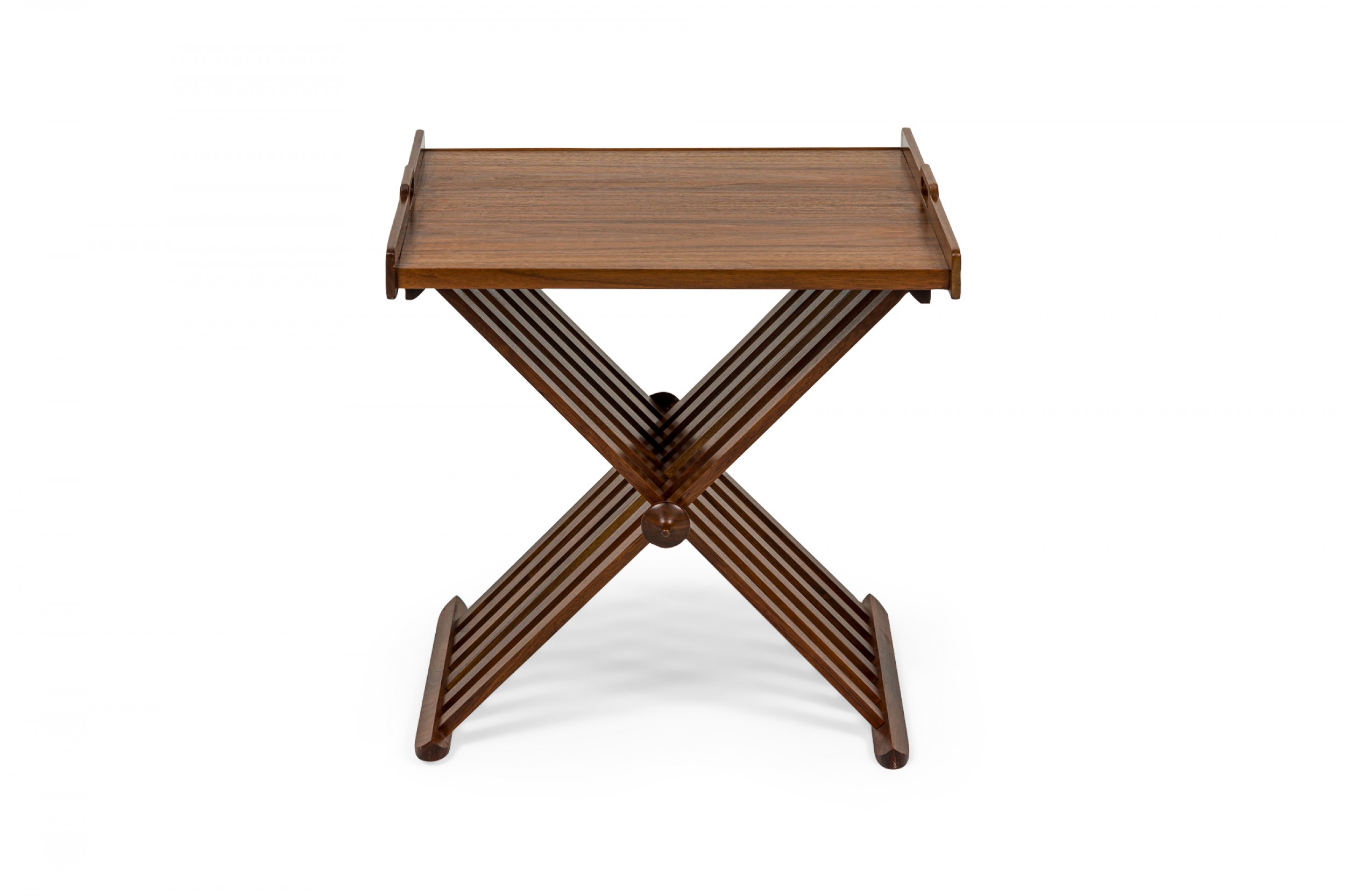 American Mid-Century wooden end / side tables with removable tray tops with two low sides with bracket-shaped cutout handles and folding X-form bases comprised of wooden slats. (KIPP STEWART FOR DREXEL FURNITURE COMPANY)