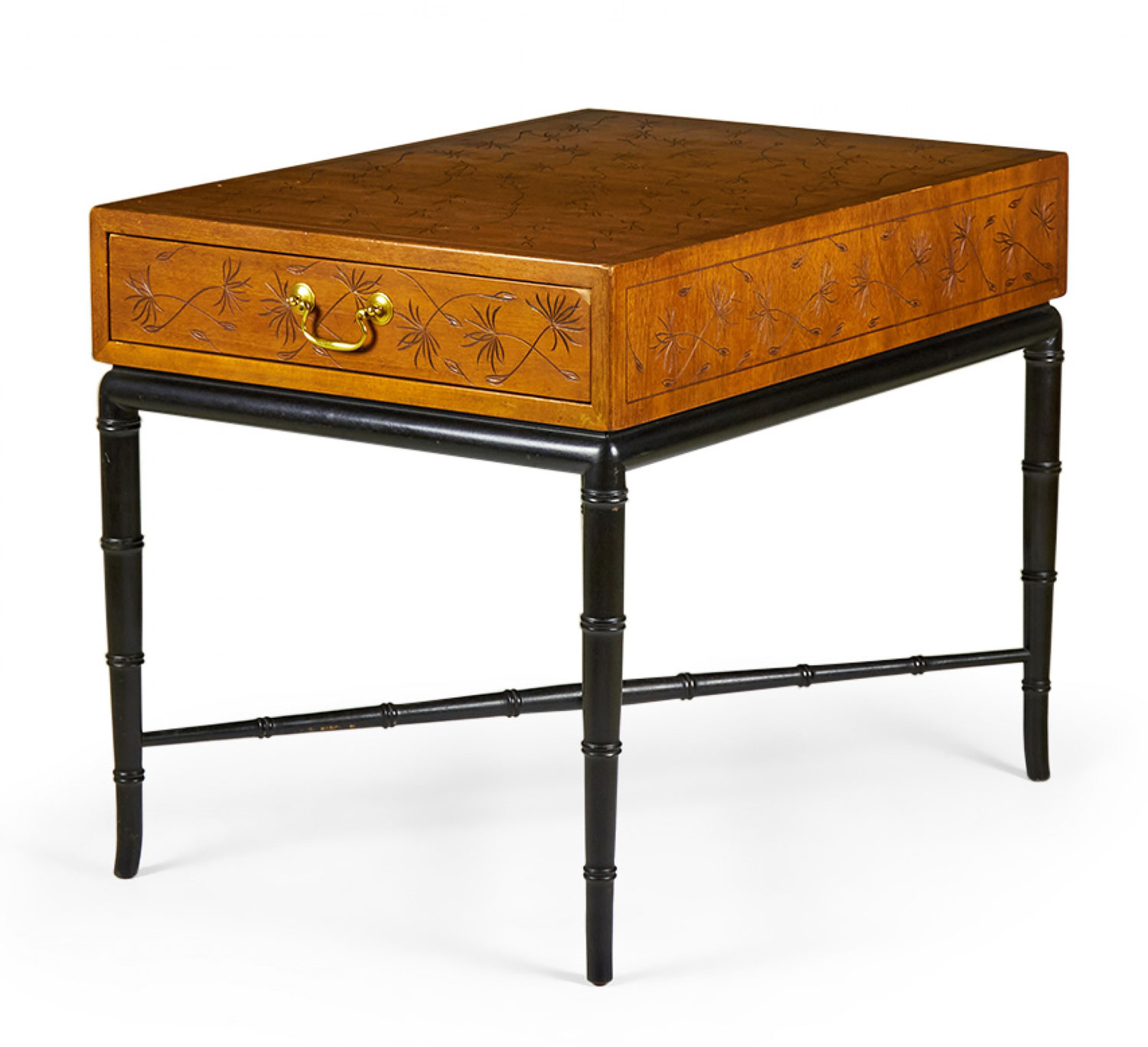 Hollywood Regency-style (1950s) end / side table with a walnut top section with an incised dandelion design and a single drawer with a brass drawer pull, resting on a black lacquered faux bamboo base with four tapered legs and an x-shaped stretcher. (KITTINGER COMPANY OF BUFFALO)
