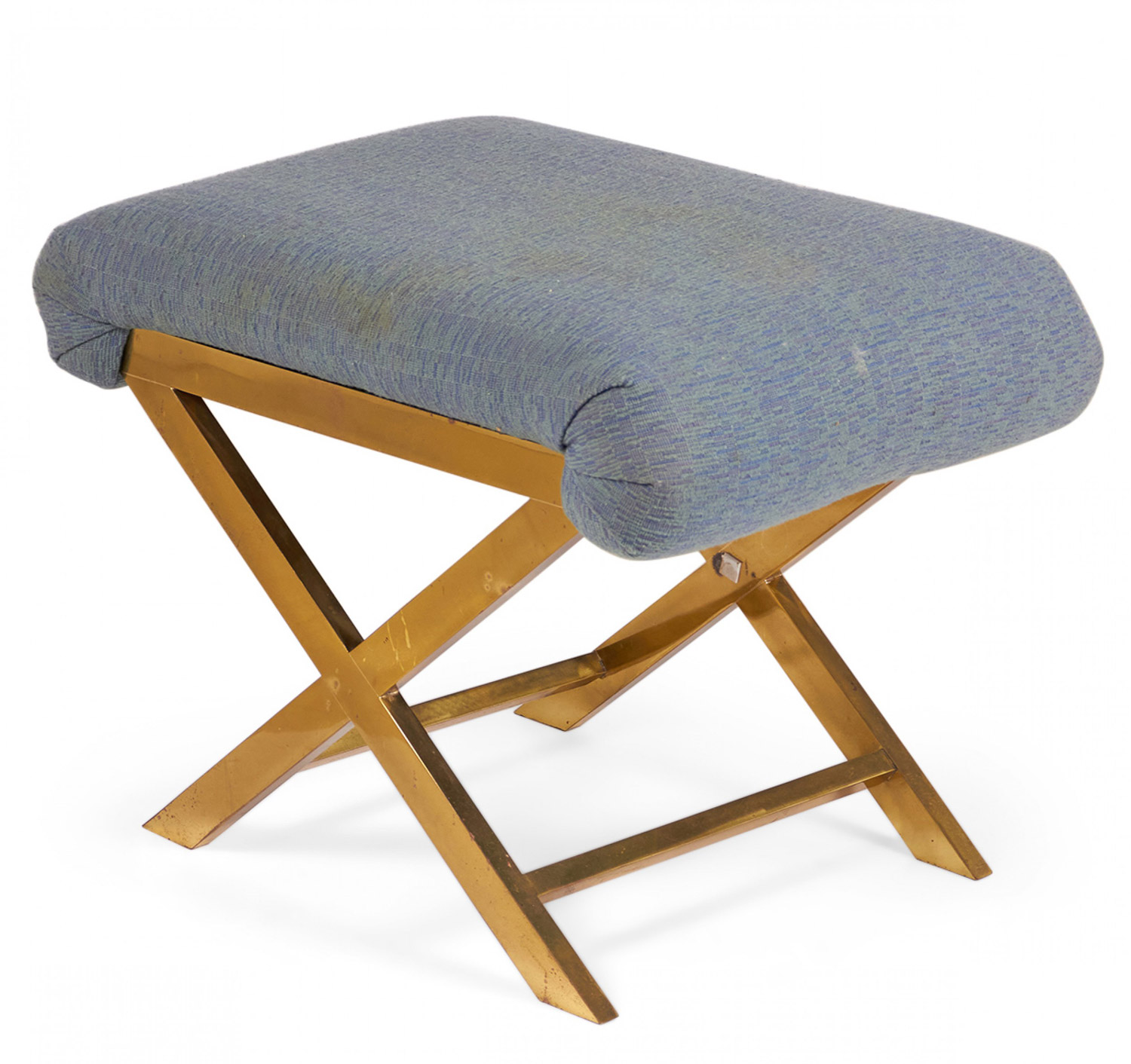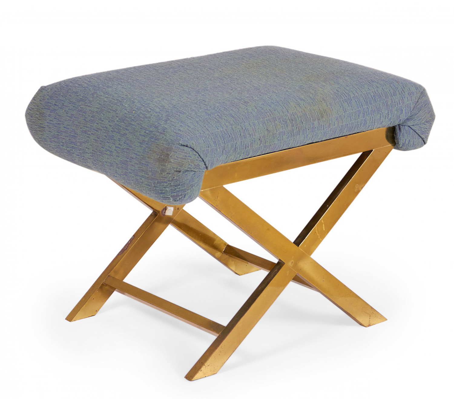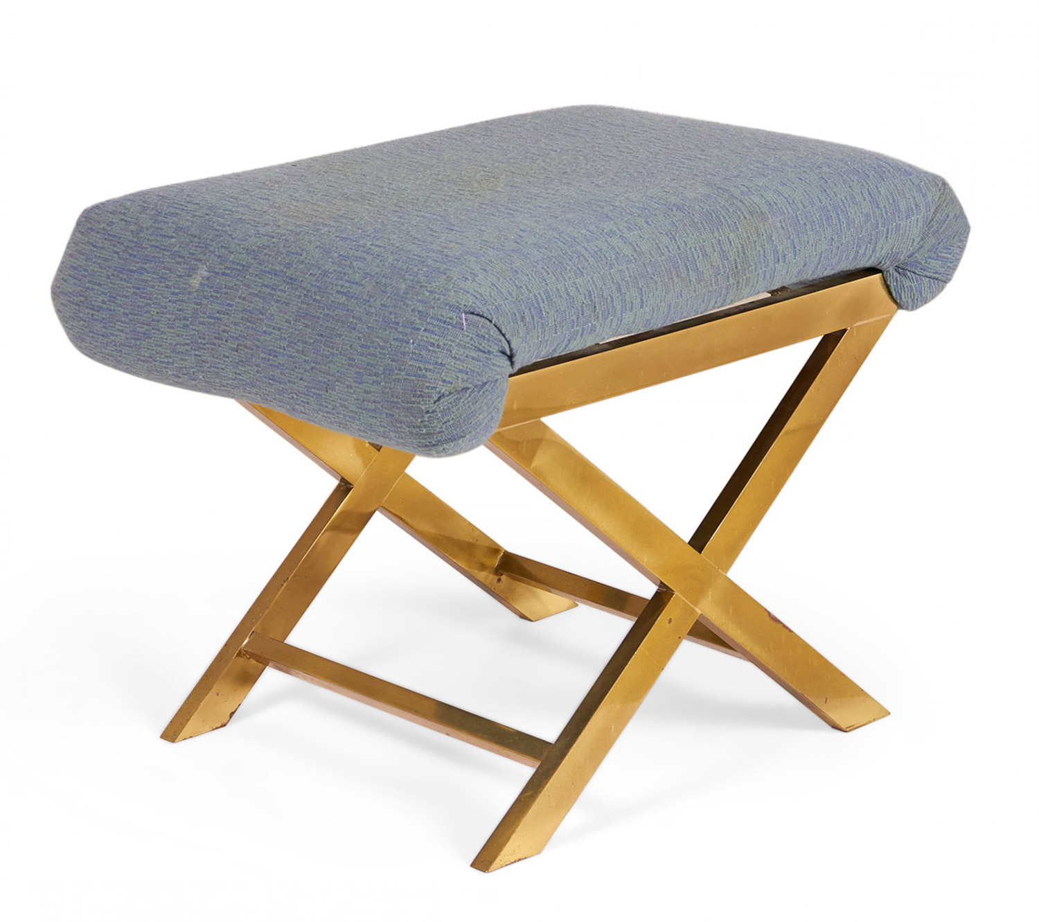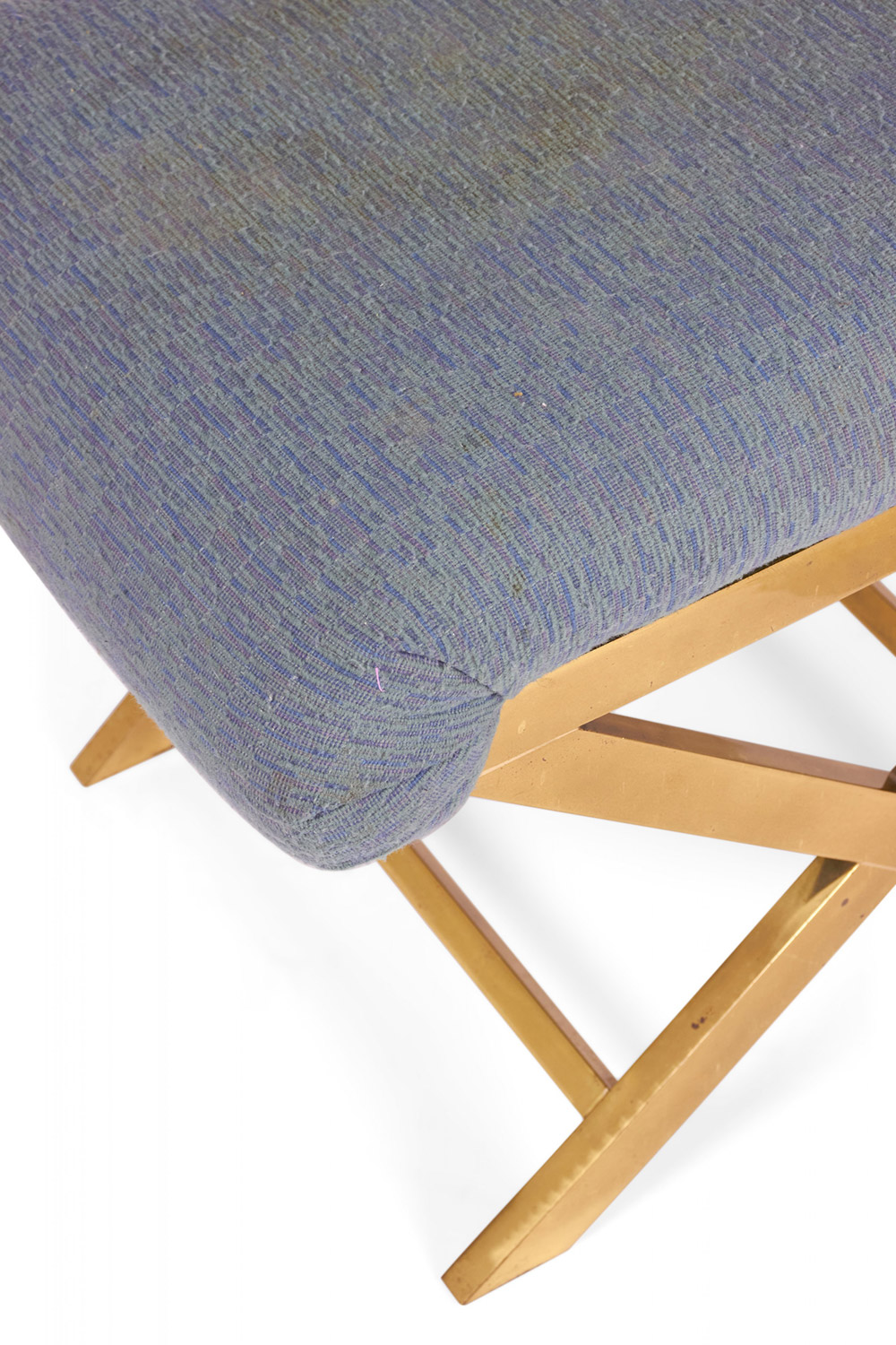 Mid-Century x-bench with a brass frame topped with a gray-blue cotton upholstered seat. (Same benches with different upholstery: DUF0056-DUF0059).