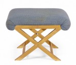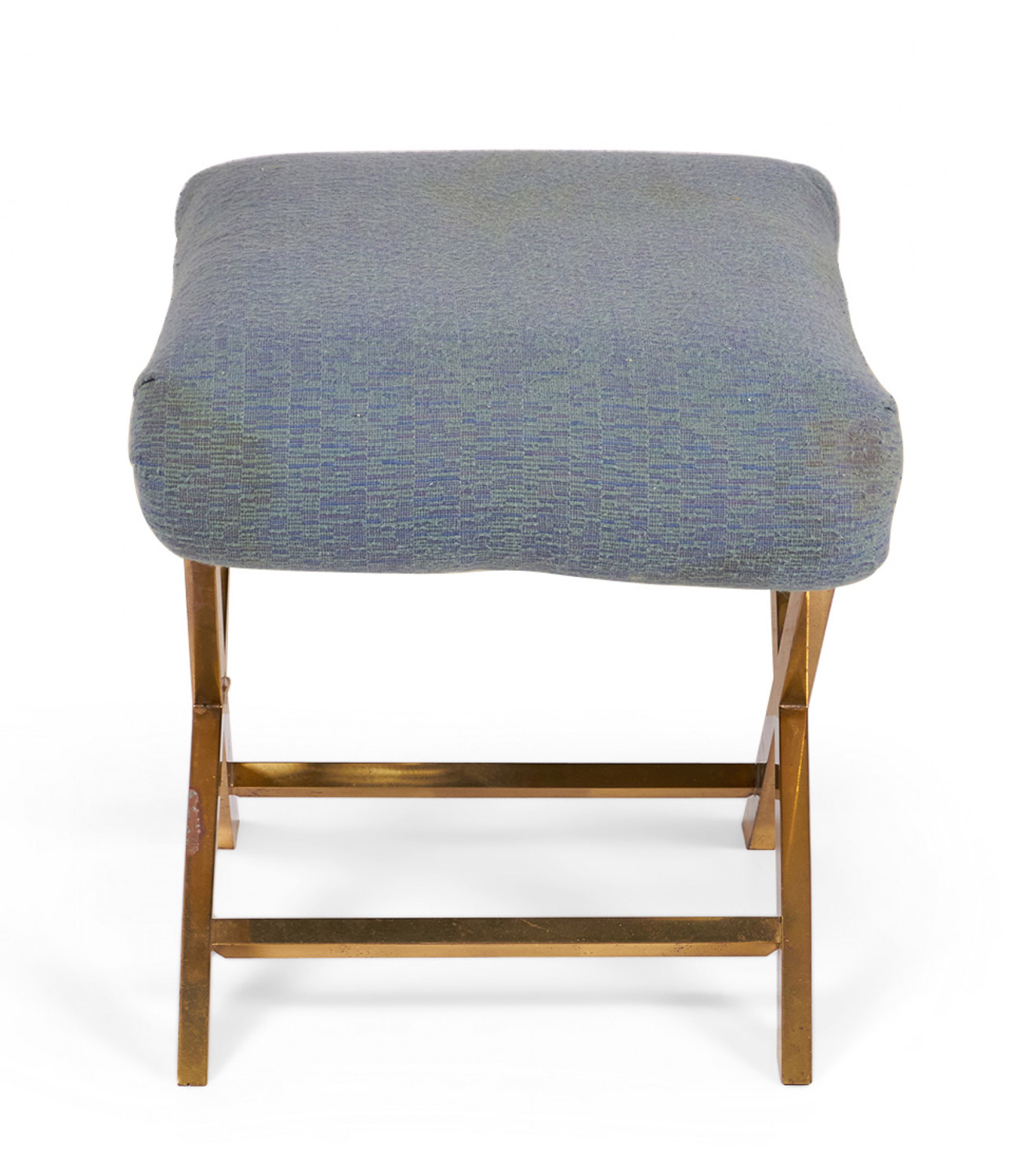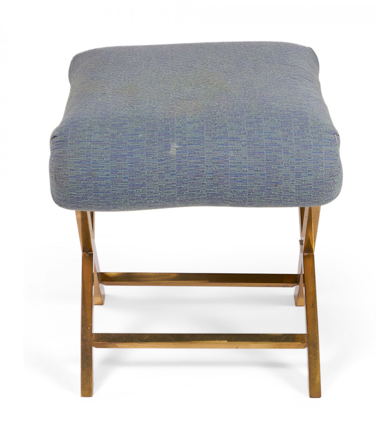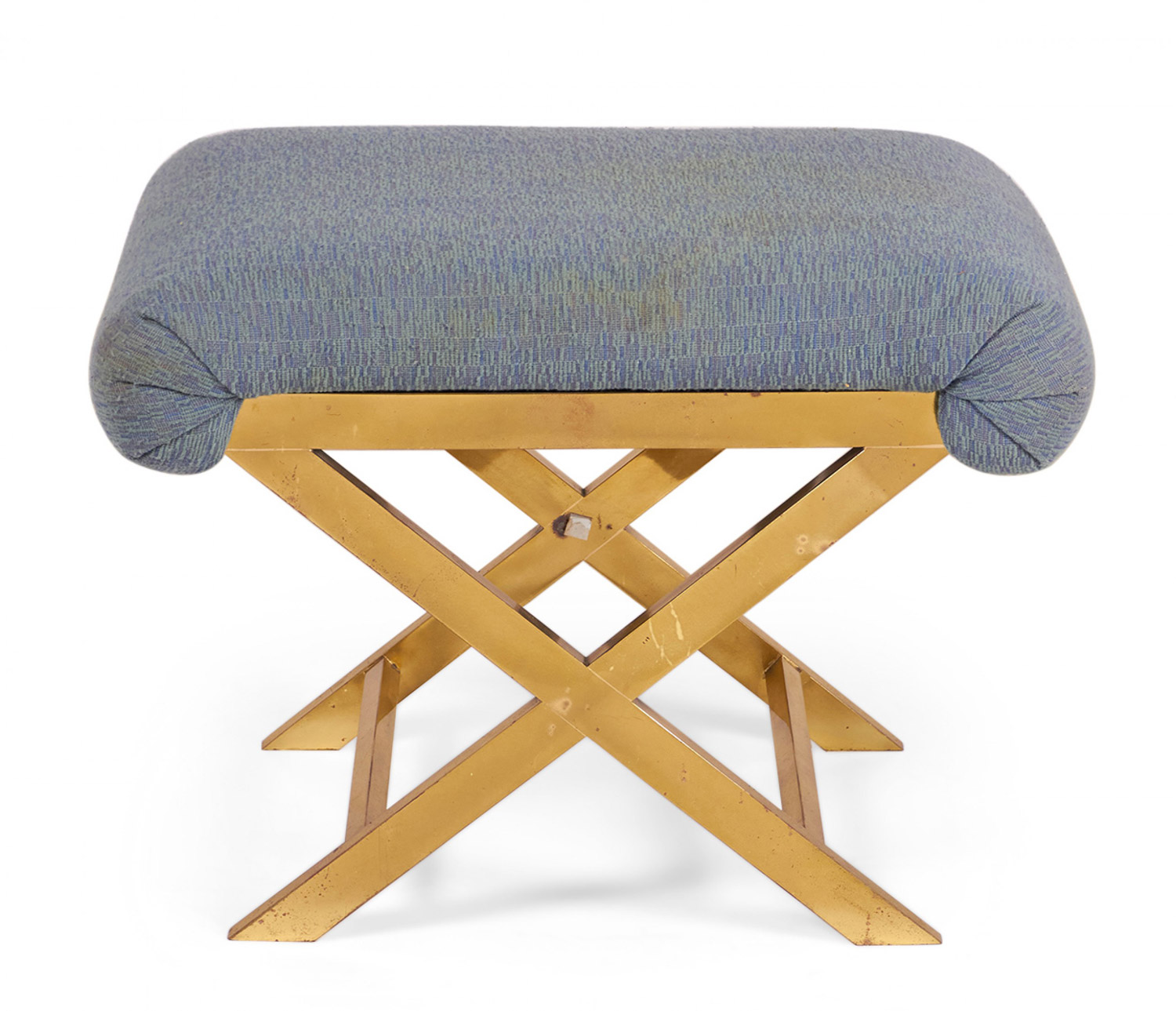Mid-Century x-bench with a brass frame topped with a gray-blue cotton upholstered seat. (Same benches with different upholstery: DUF0056-DUF0059).