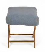 Mid-Century Brass and Gray-Blue Cotton Upholstery X-Bench