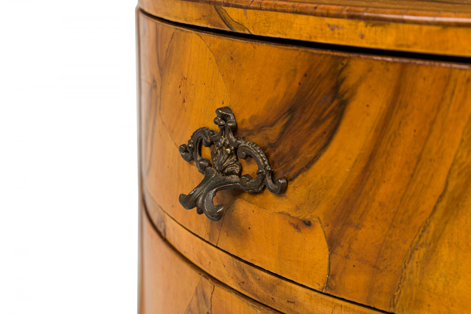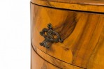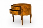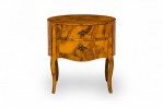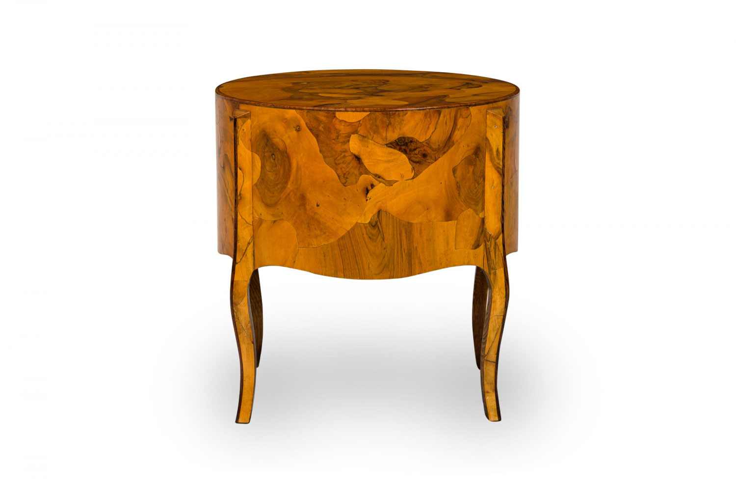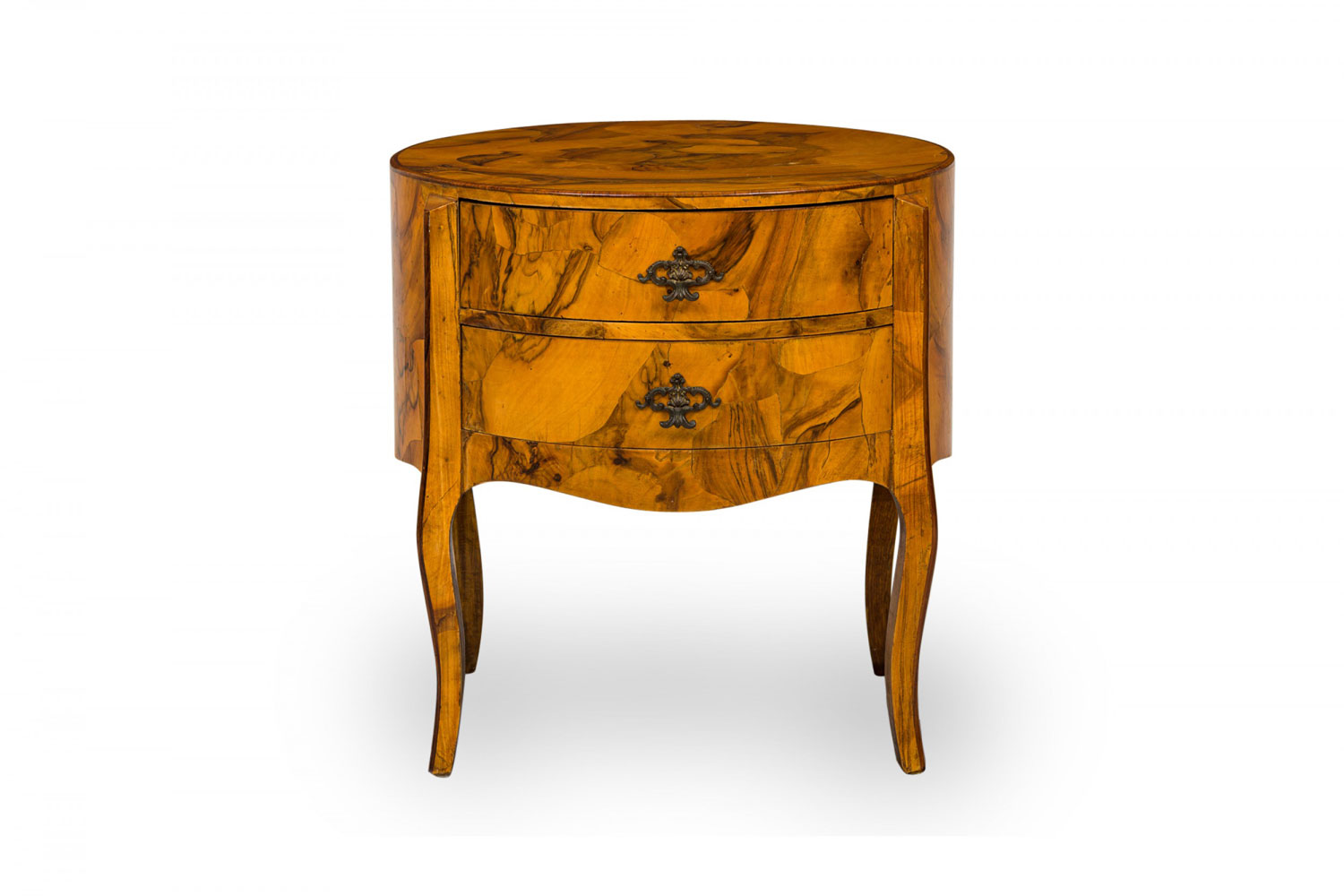 Italian Mid-Century drum form end / side table with oyster burl veneer and two drawers with shaped bronze drawer pulls, resting on four curved legs.
