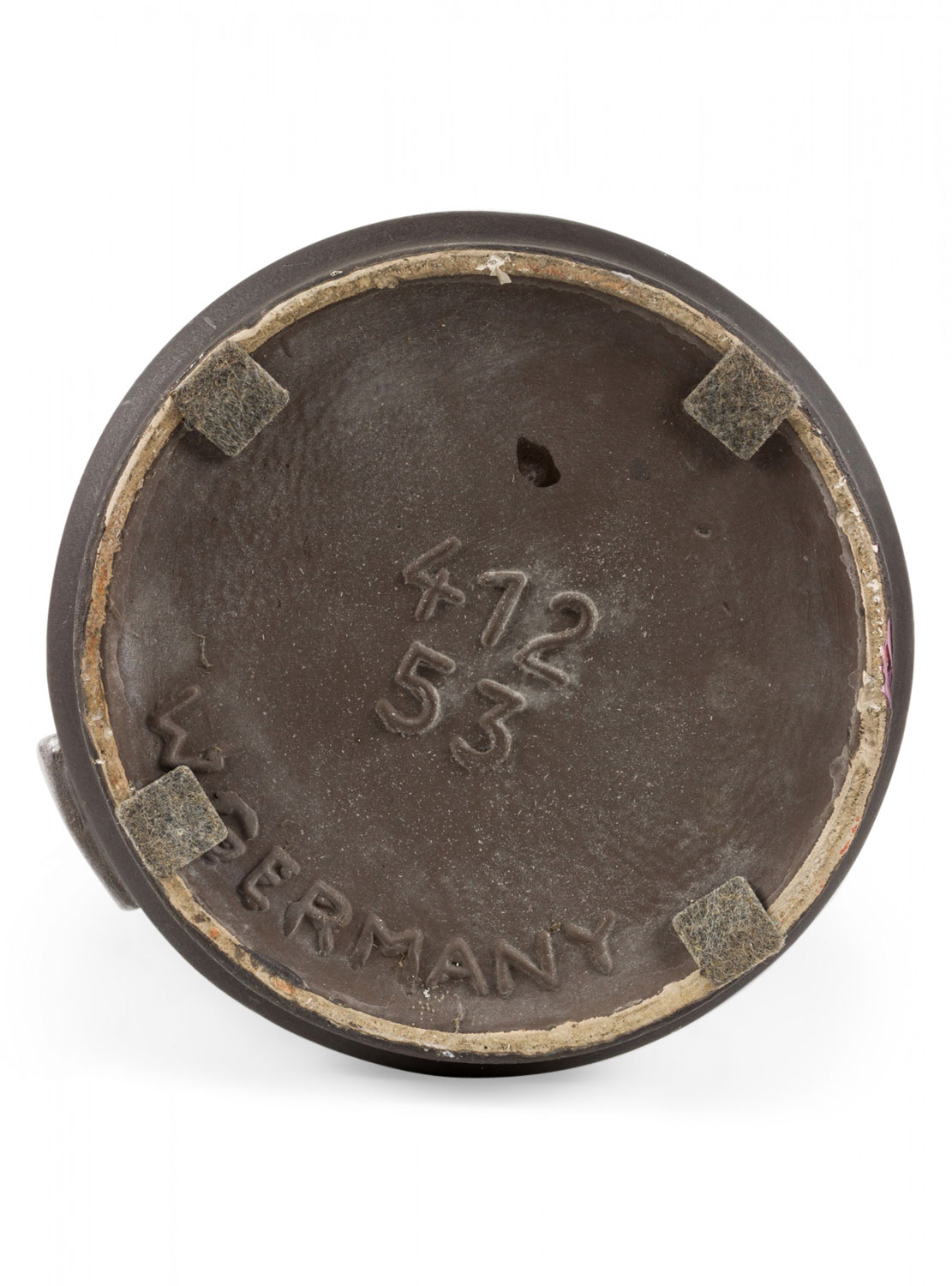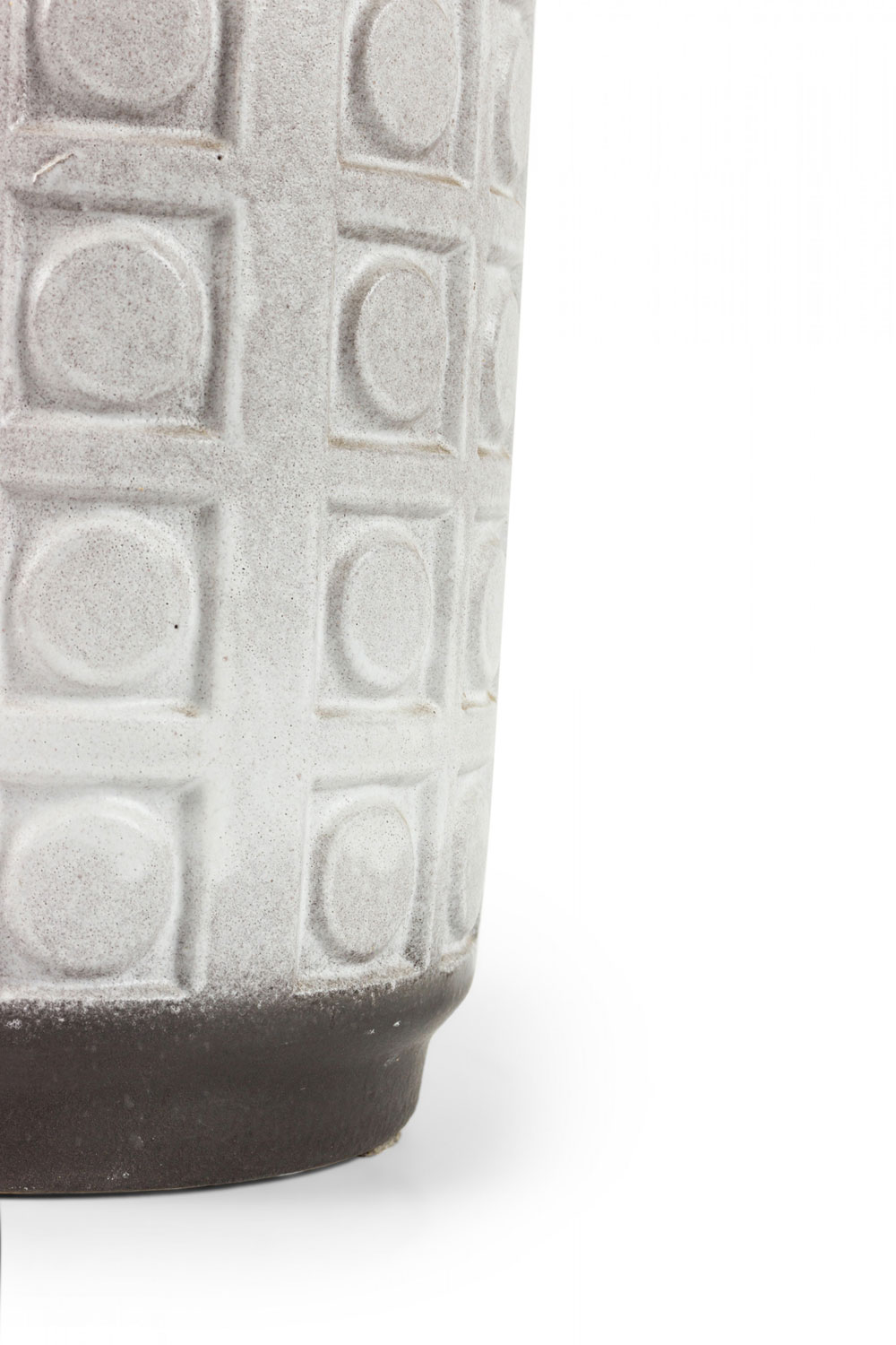 West German Mid-Century large ceramic handled vase with a black glazed mouth and bottom and a white speckled glazed body with an incised geometric circle and square pattern. (stamped on bottom, W. GERMANY 412-53)