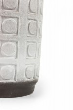 West German Mid-Century large ceramic handled vase with a black glazed mouth and bottom and a white speckled glazed body with an incised geometric circle and square pattern. (stamped on bottom, W. GERMANY 412-53).