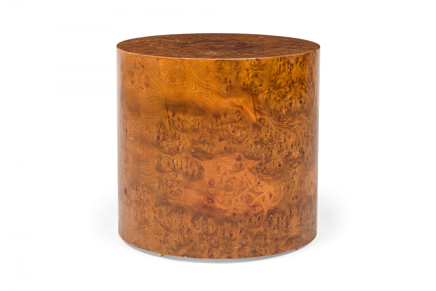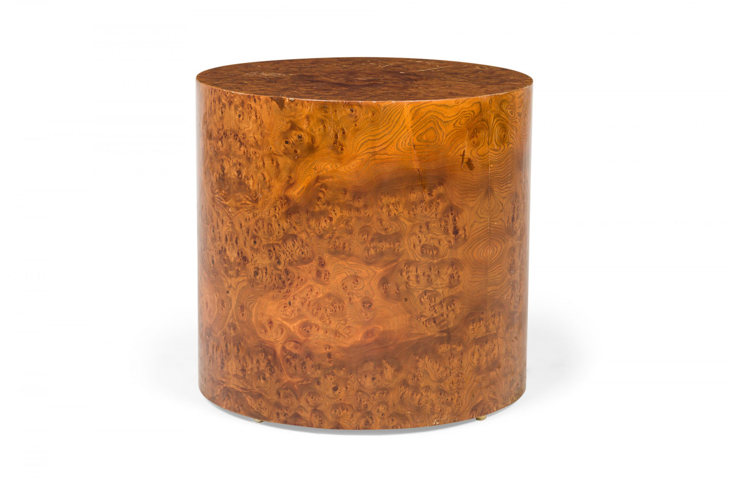 American Mid-Century drum form end / side table with an ash burl wood veneer. (MILO BAUGHMAN FOR DIRECTIONAL FURNITURE COMPANY).