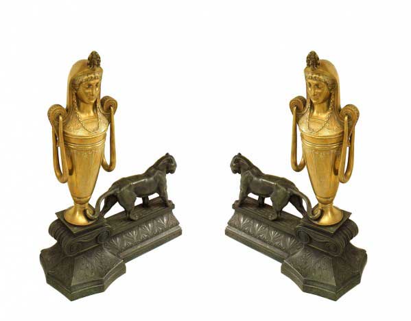 PAIR of French Empire-style (19/20th Century) bronze sphinx andirons on rectangular base (PRICED AS PAIR).