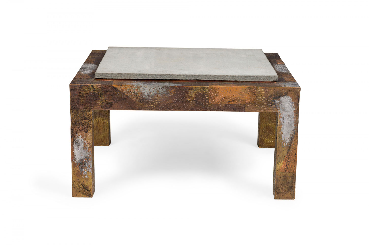 PAIR of American Mid-Century square coffee / cocktail tables with textured metal clad frames and pronounced light gray slate tops. (manner of PAUL EVANS)(PRICED AS PAIR).