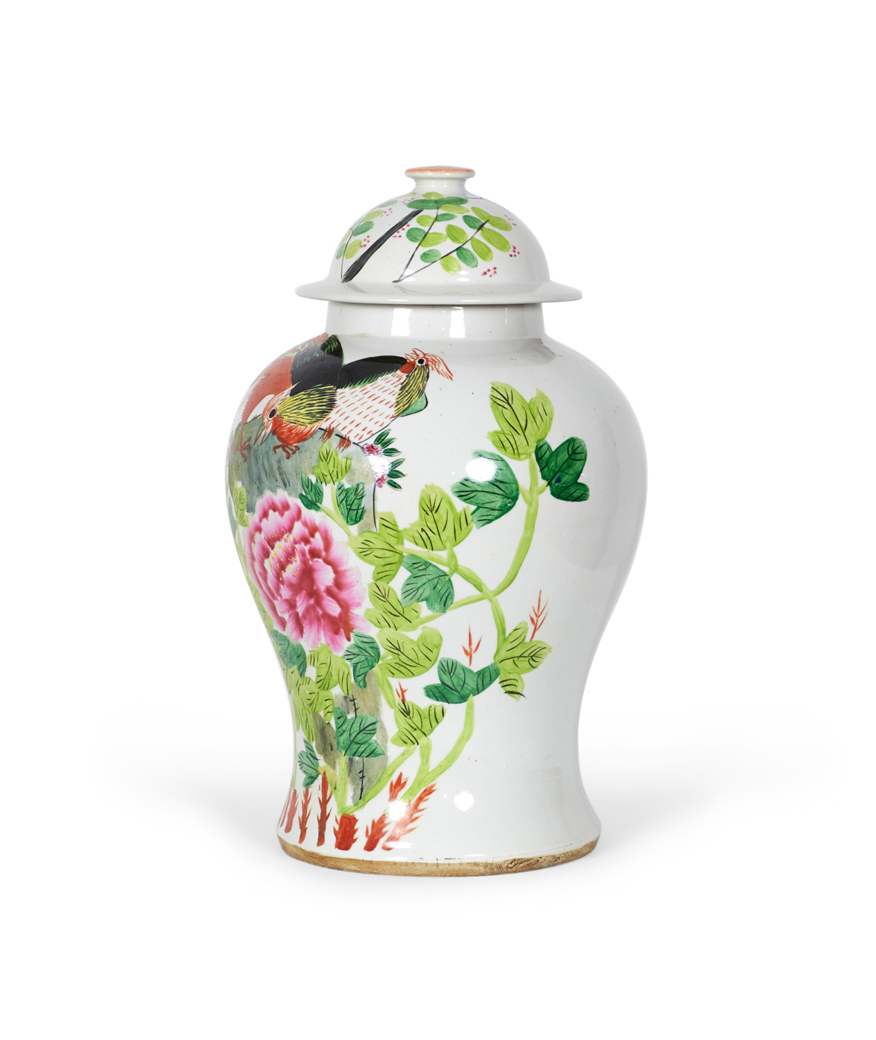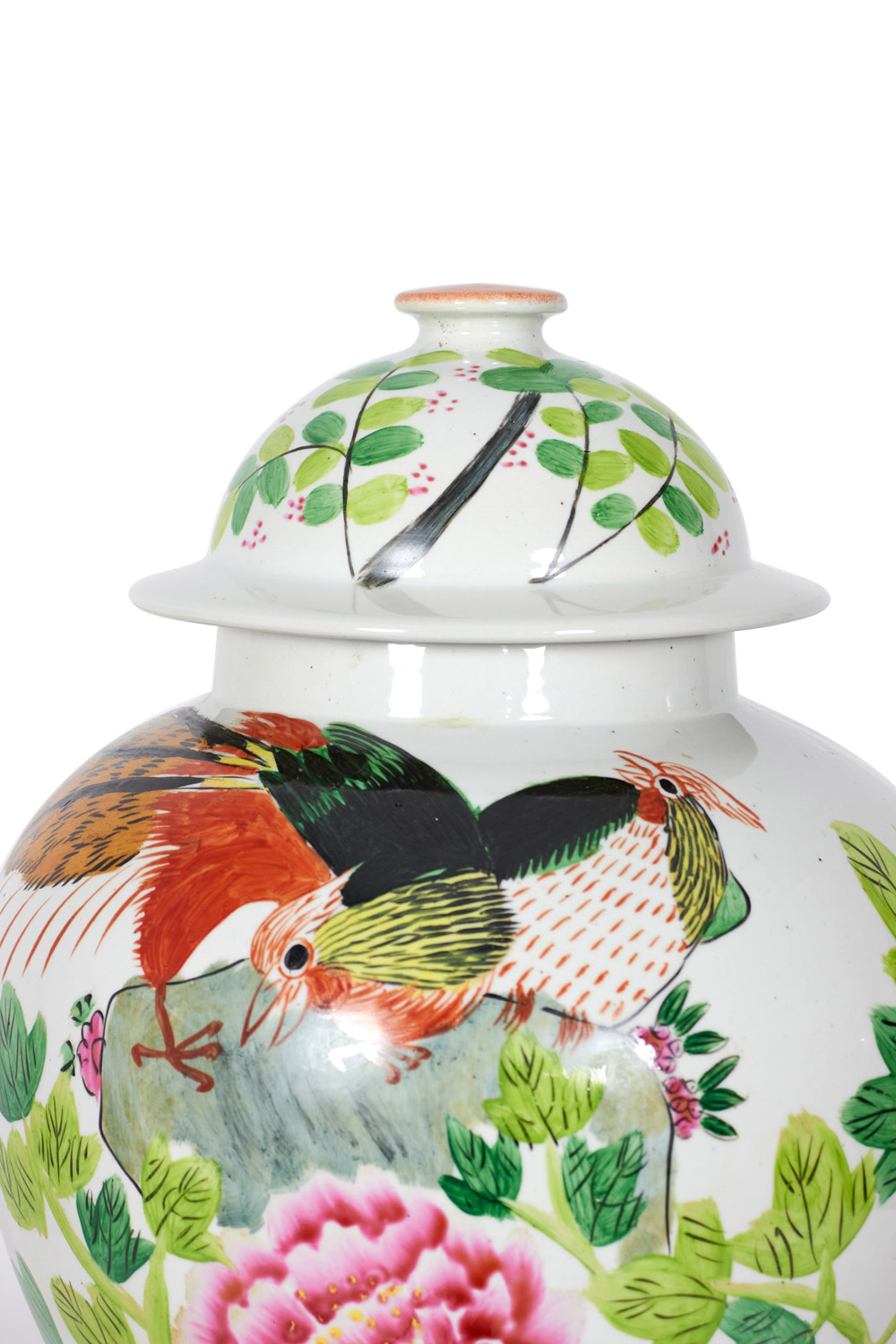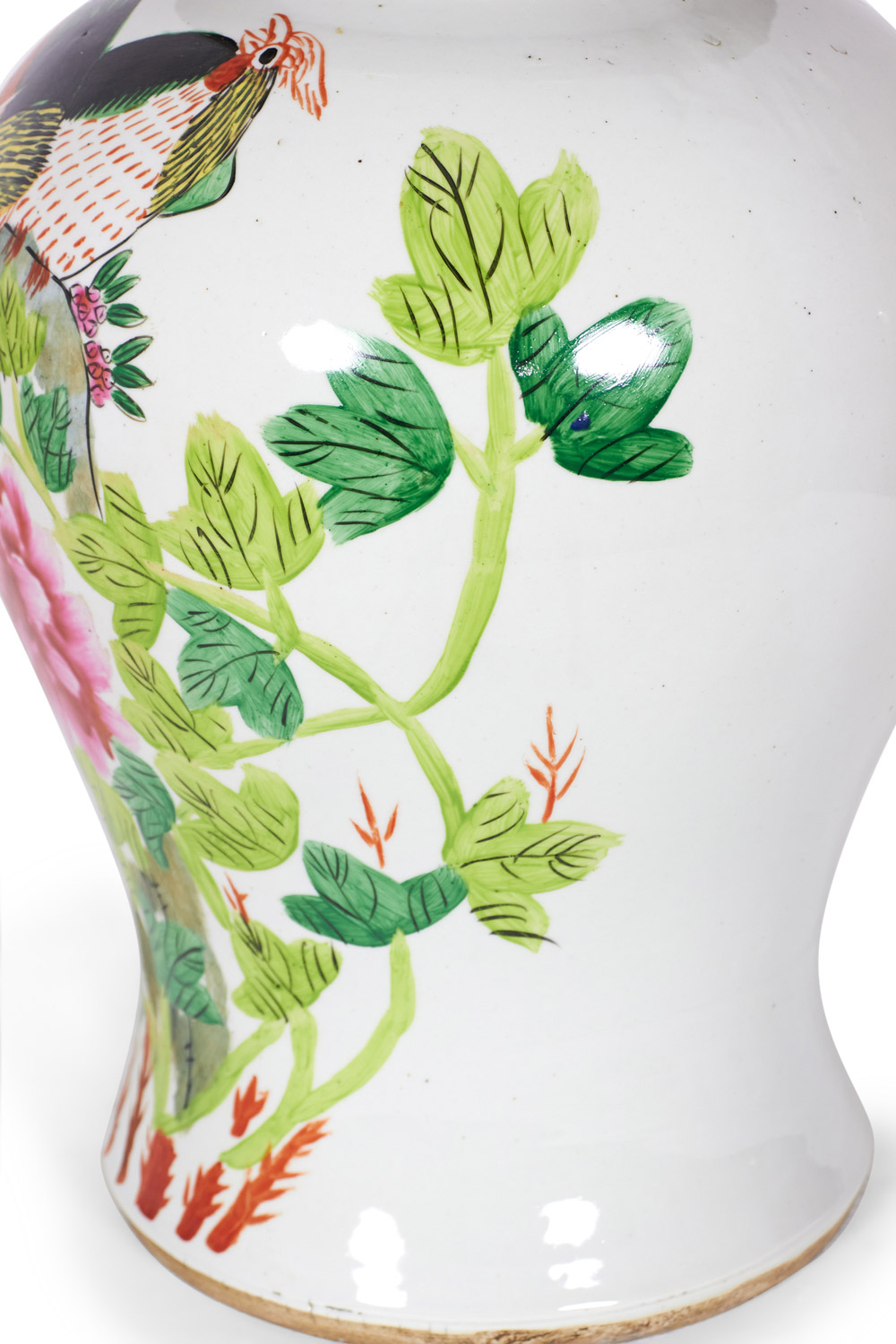 Pair of Antique Chinese Floral and Bird Patterned Porcelain Lidded Ginger Jars