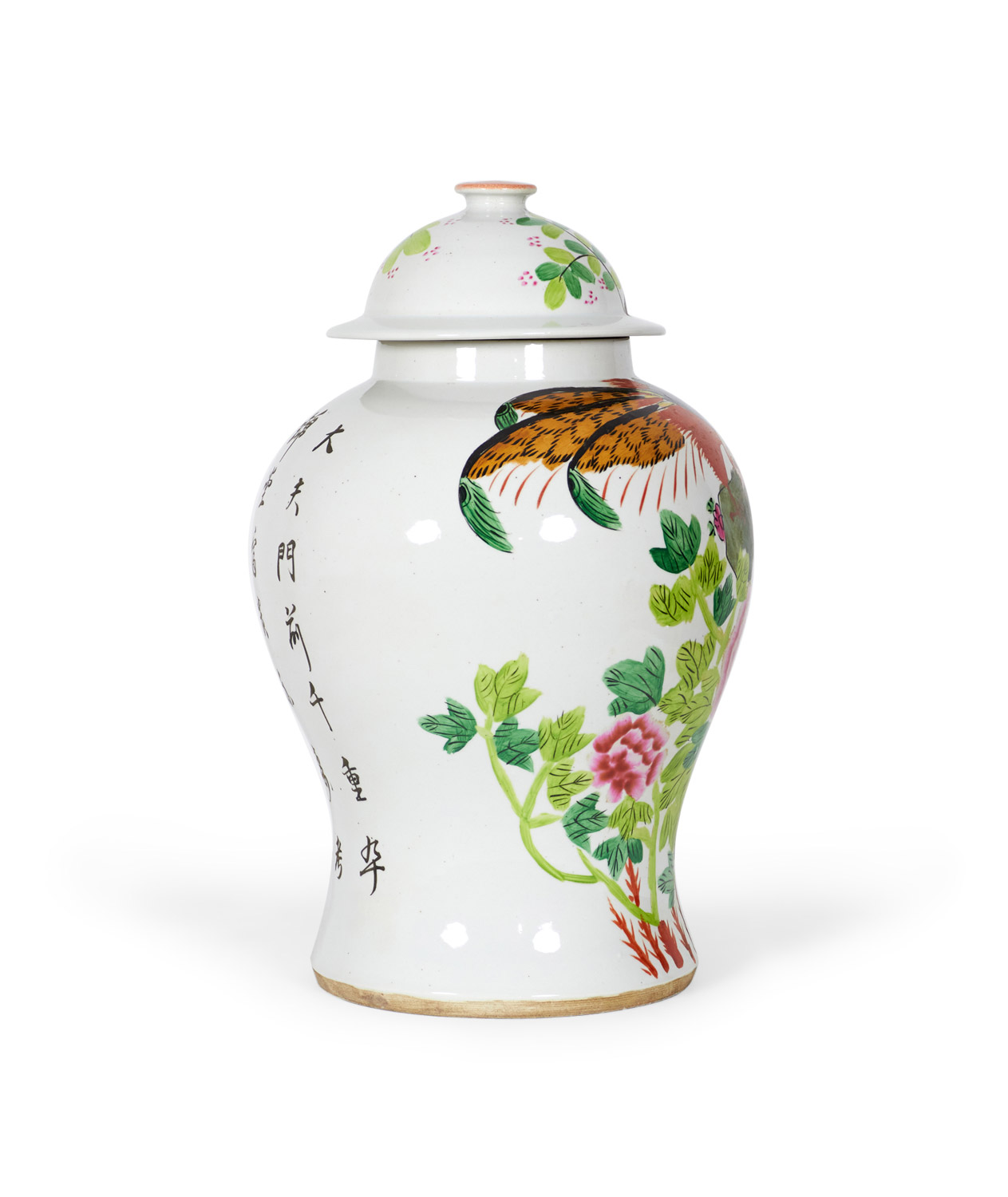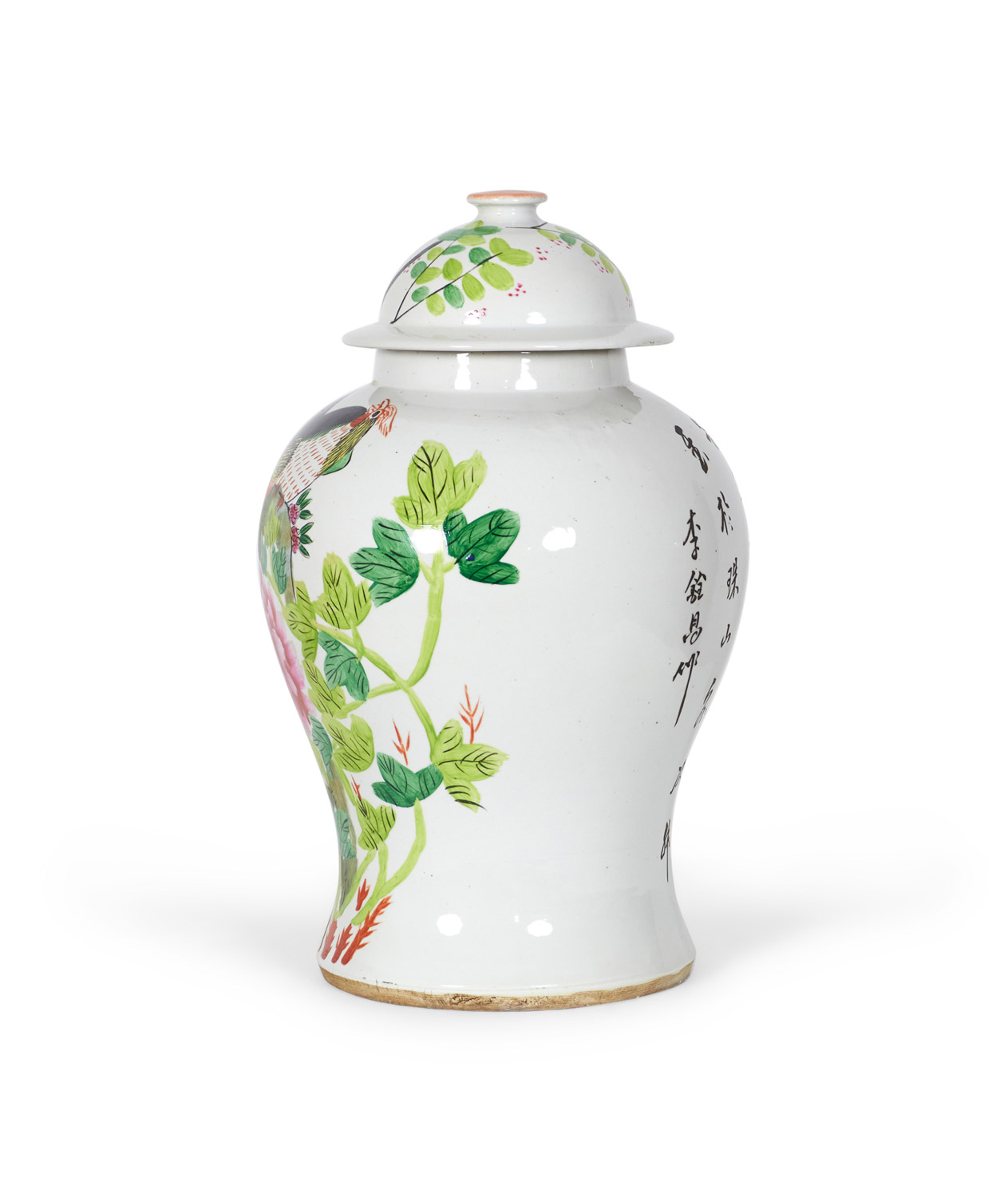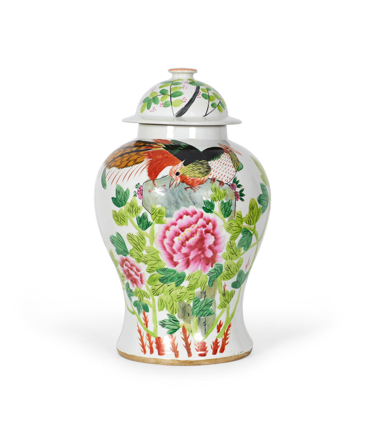 Pair of Antique Chinese Floral and Bird Patterned Porcelain Lidded Ginger Jars