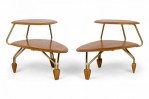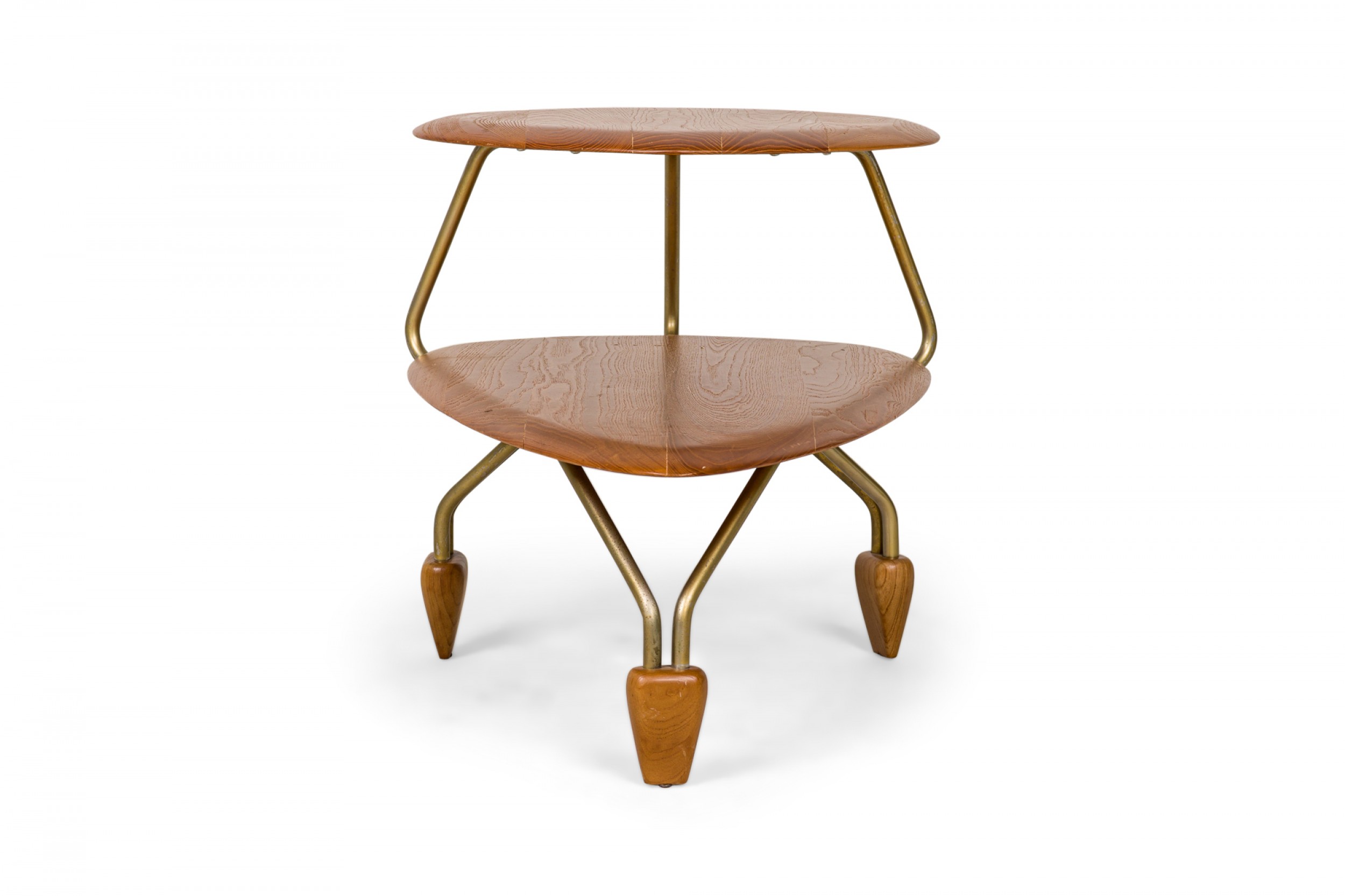 PAIR of American Mid-Century end / side tables with a walnut upper pointed oval tier, suspended by three curved brass supports above a similarly shaped longer walnut tabletop, resting on three double curved brass legs ending in shaped tapered walnut feet. (PRICED AS PAIR).