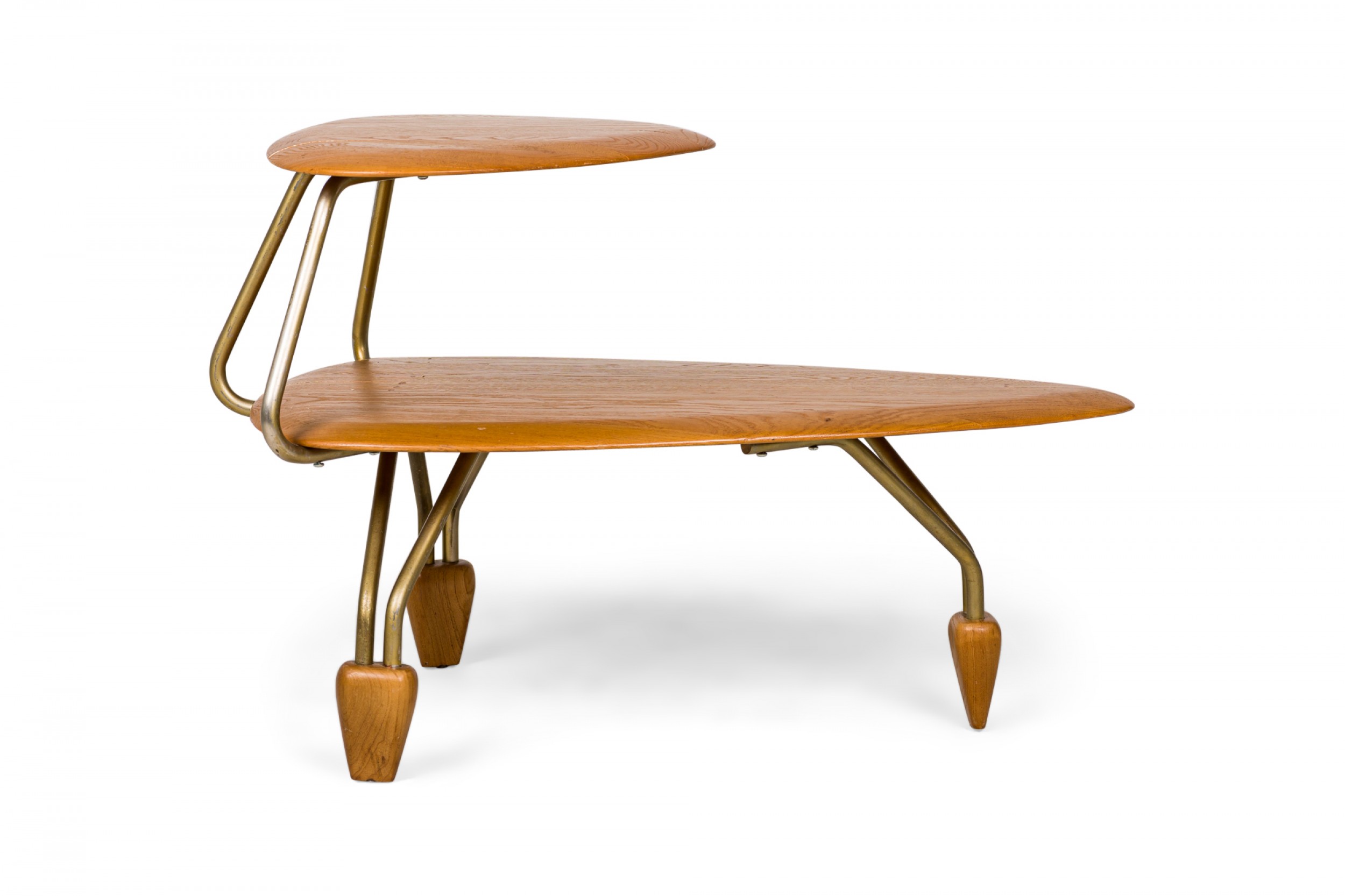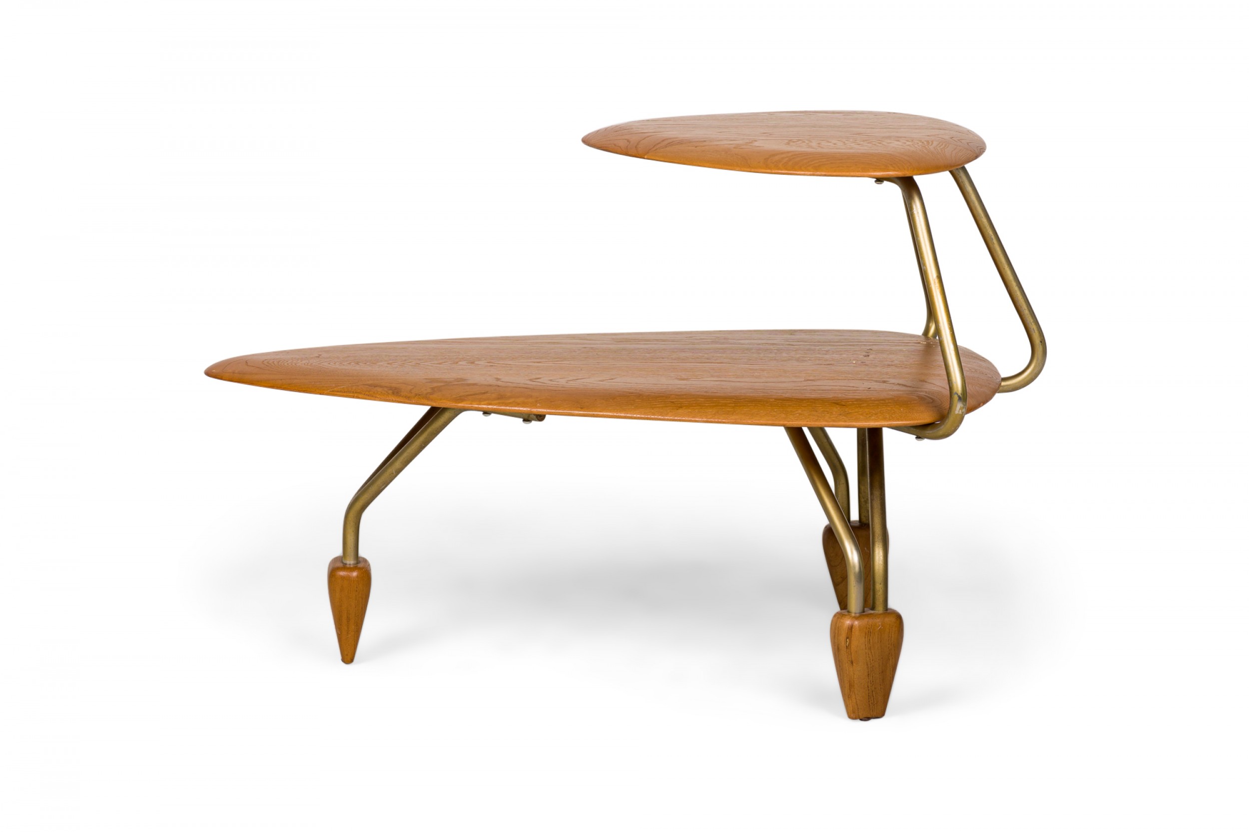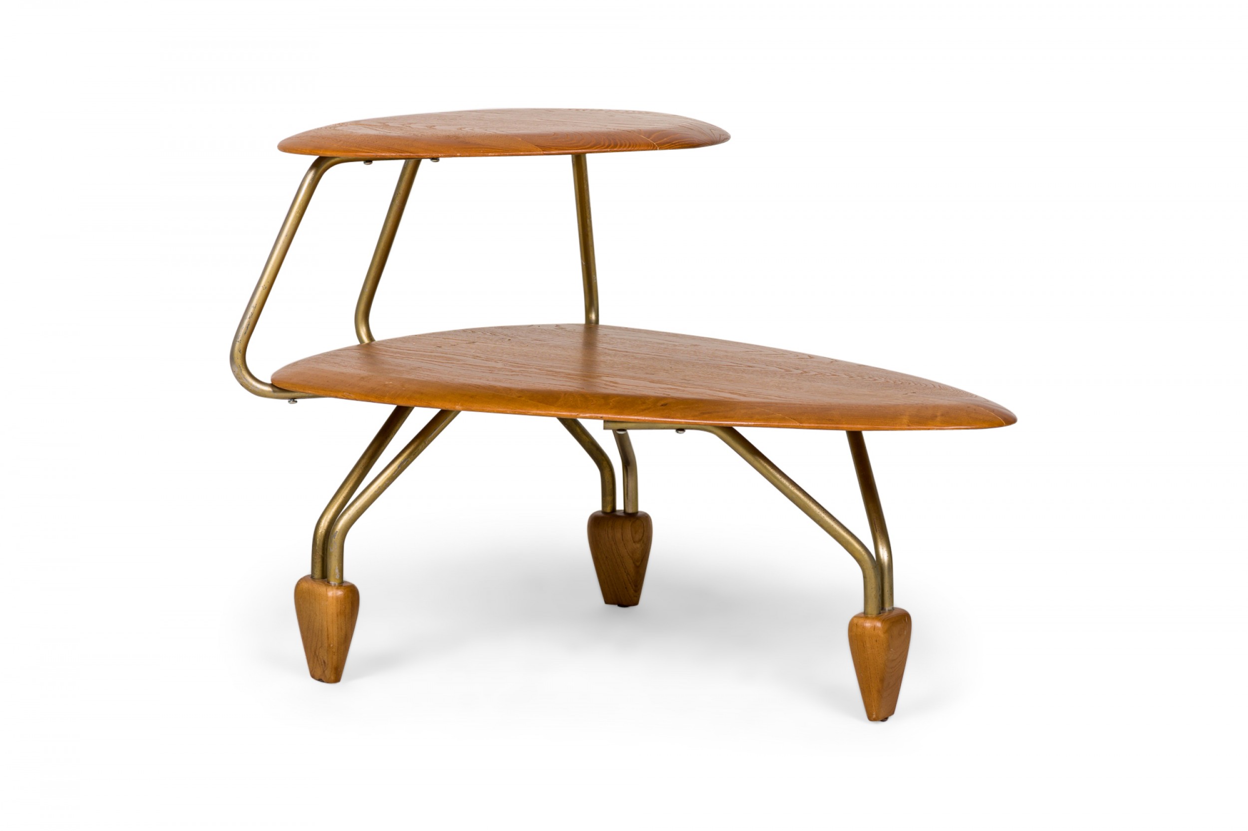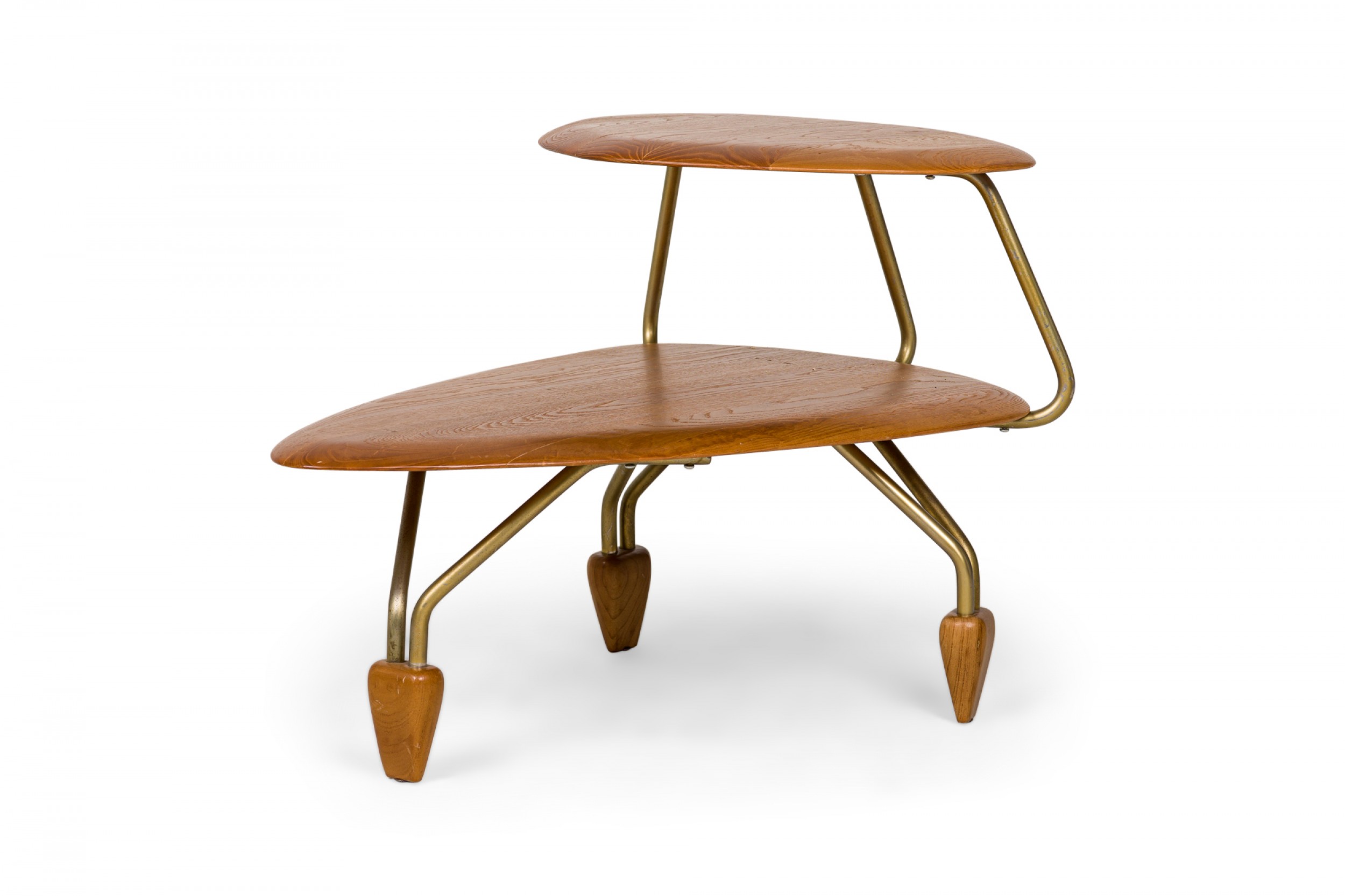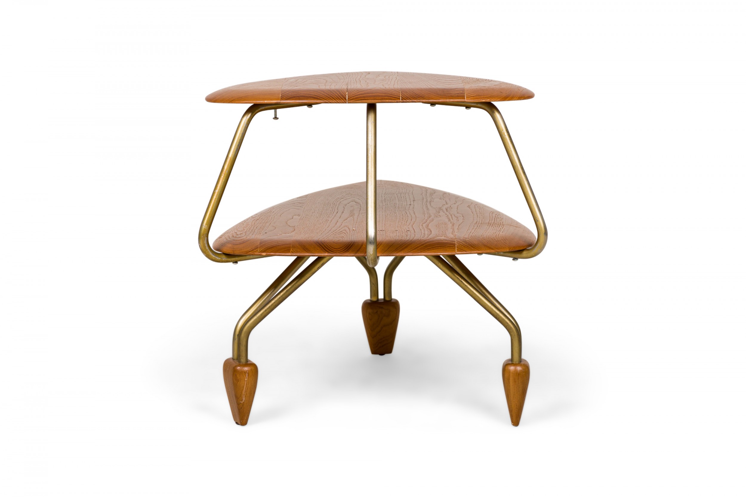 PAIR of American Mid-Century end / side tables with a walnut upper pointed oval tier, suspended by three curved brass supports above a similarly shaped longer walnut tabletop, resting on three double curved brass legs ending in shaped tapered walnut feet. (PRICED AS PAIR)