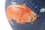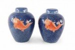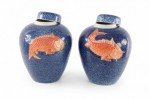 Pair of Chinese Blue and Orange Fish Design Lidded Porcelain Jars