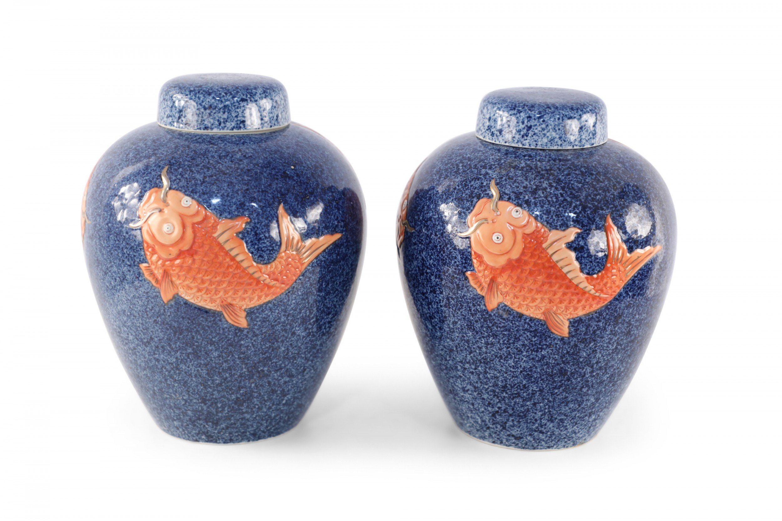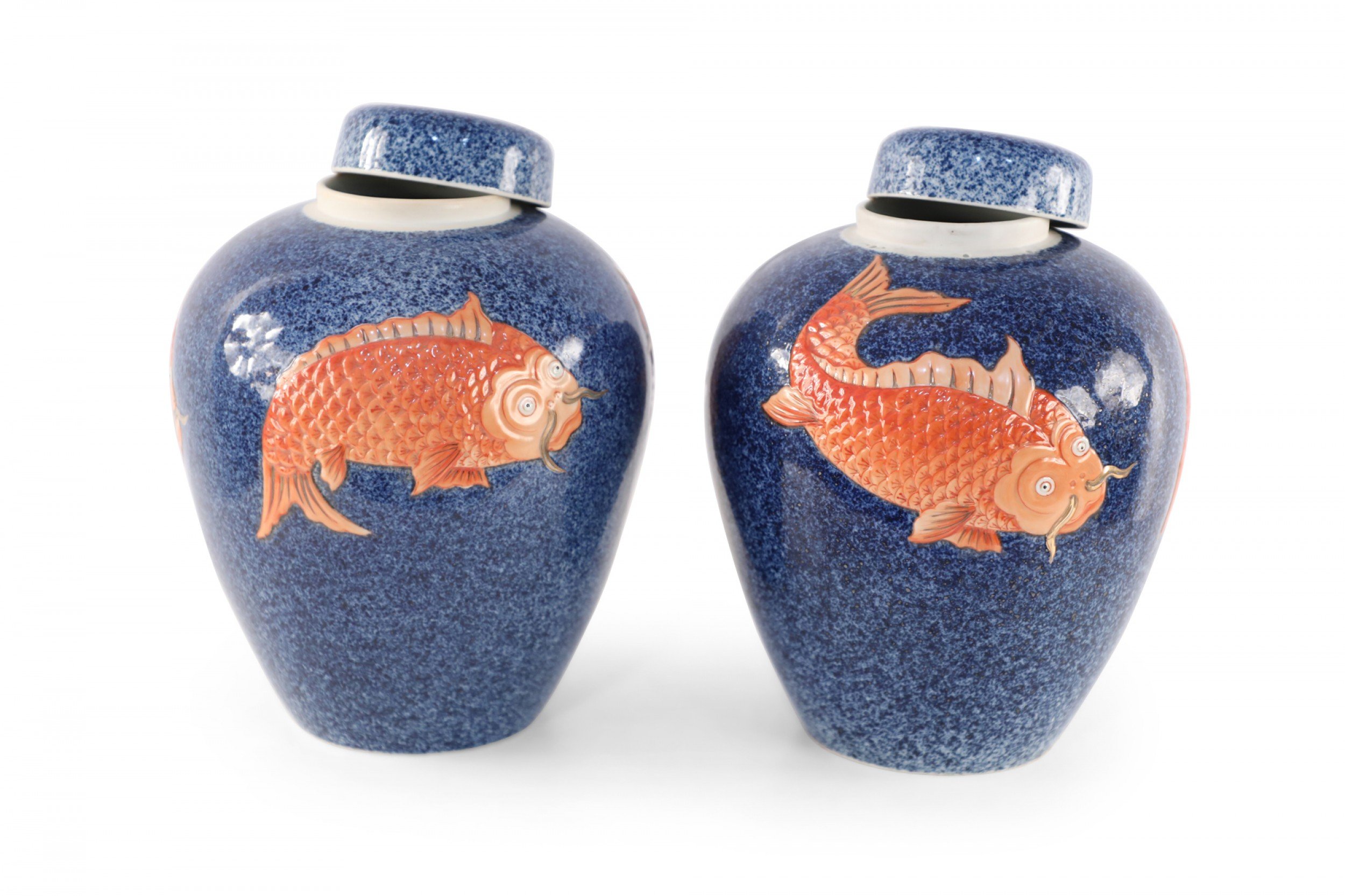 PAIR of Chinese (Mid 20th Century) lidded porcelain jars with orange fish swimming on blue, sponged backgrounds, inspired by patterns from the Ming Dynasty (PRICED AS A PAIR).