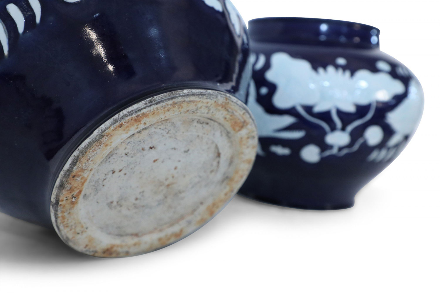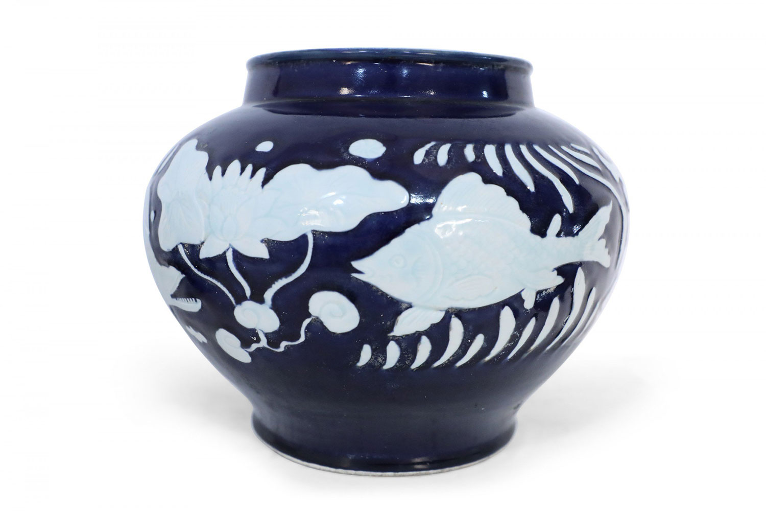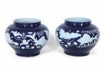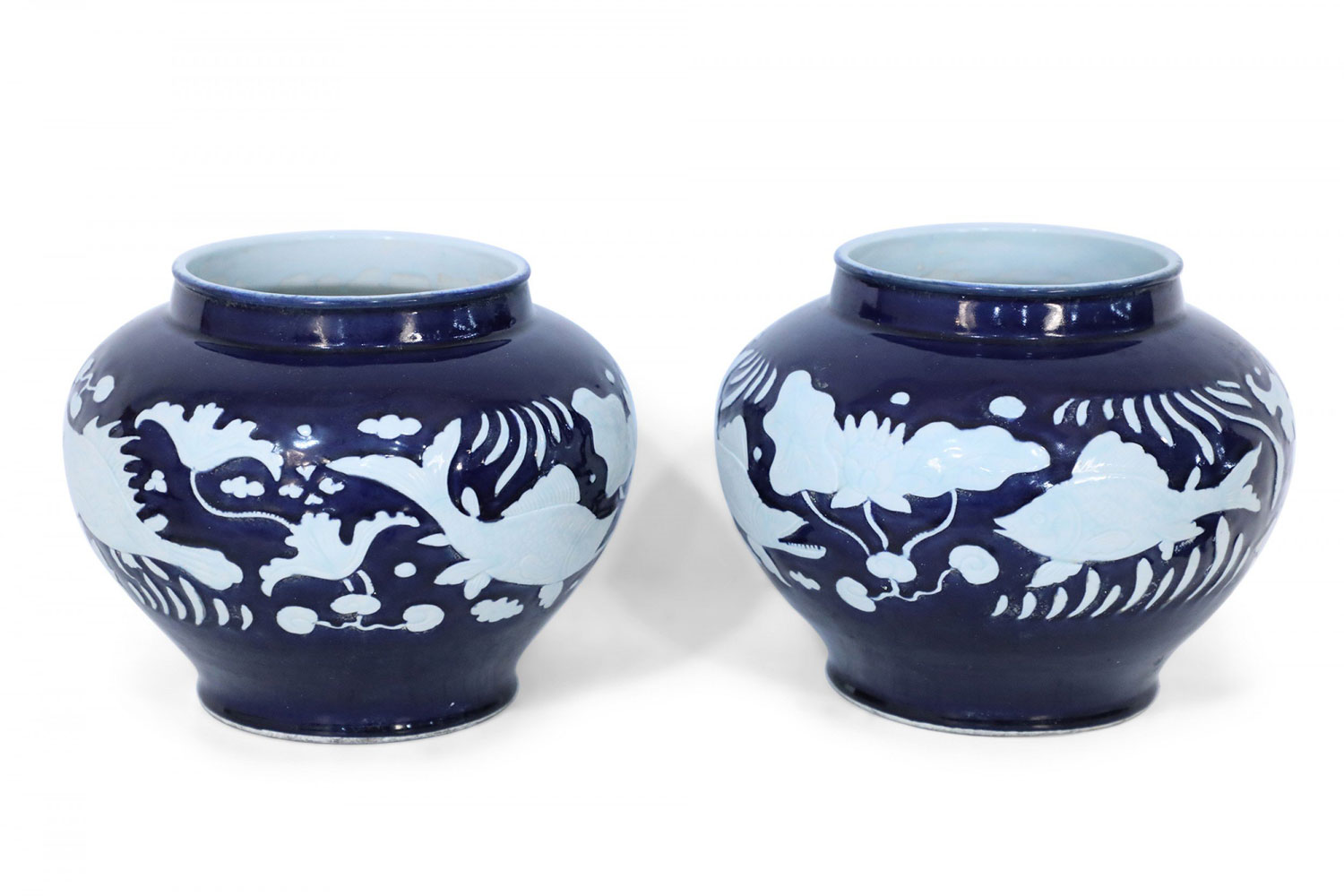 PAIR of Chinese porcelain pots in dark navy hues decorated with white underwater motifs capturing the silhouettes of fish and vegetation (PRICED AS PAIR).