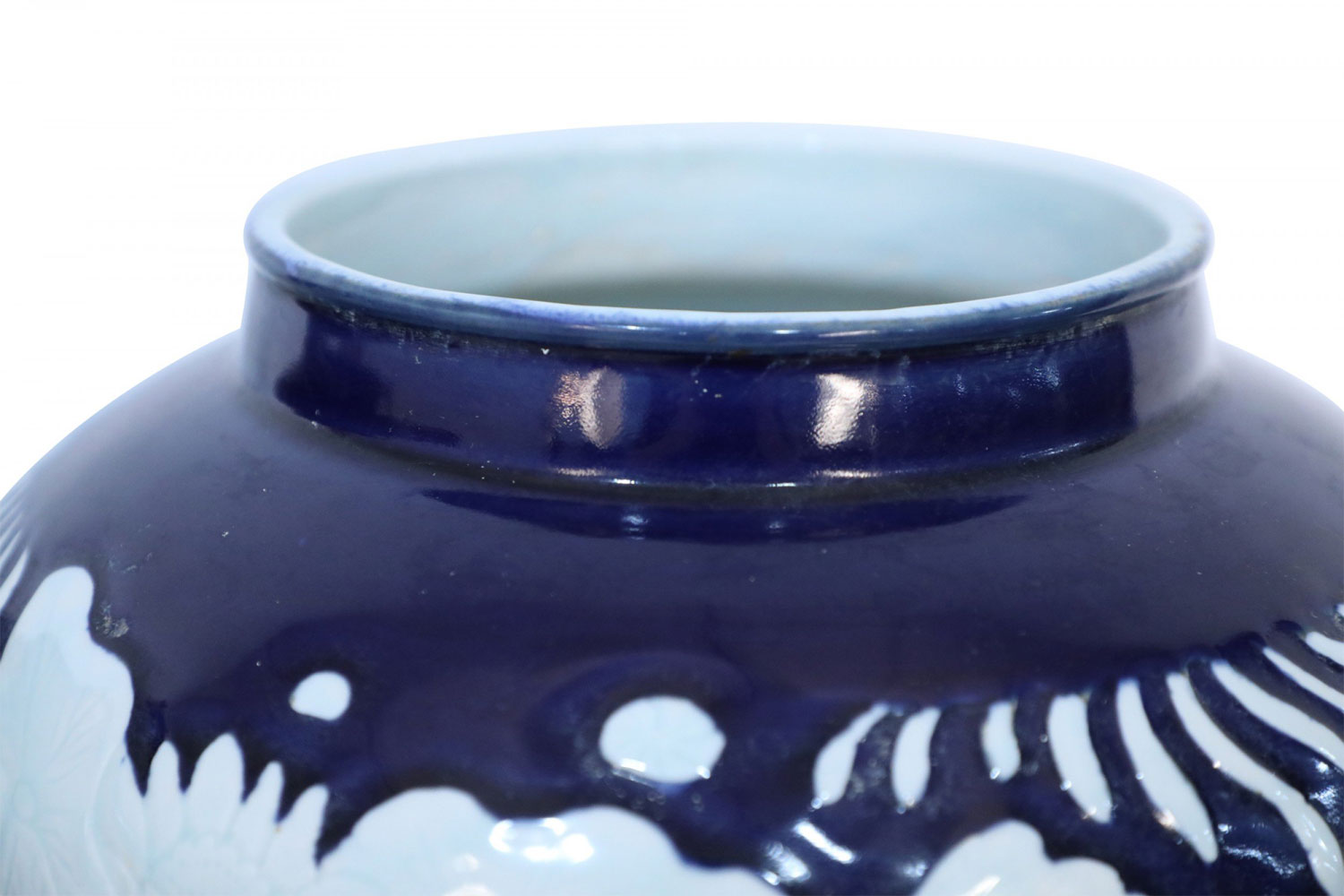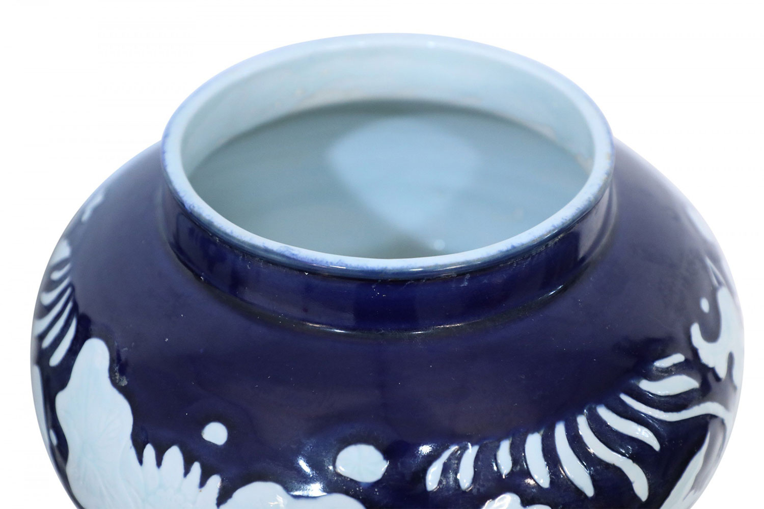 PAIR of Chinese porcelain pots in dark navy hues decorated with white underwater motifs capturing the silhouettes of fish and vegetation (PRICED AS PAIR)..