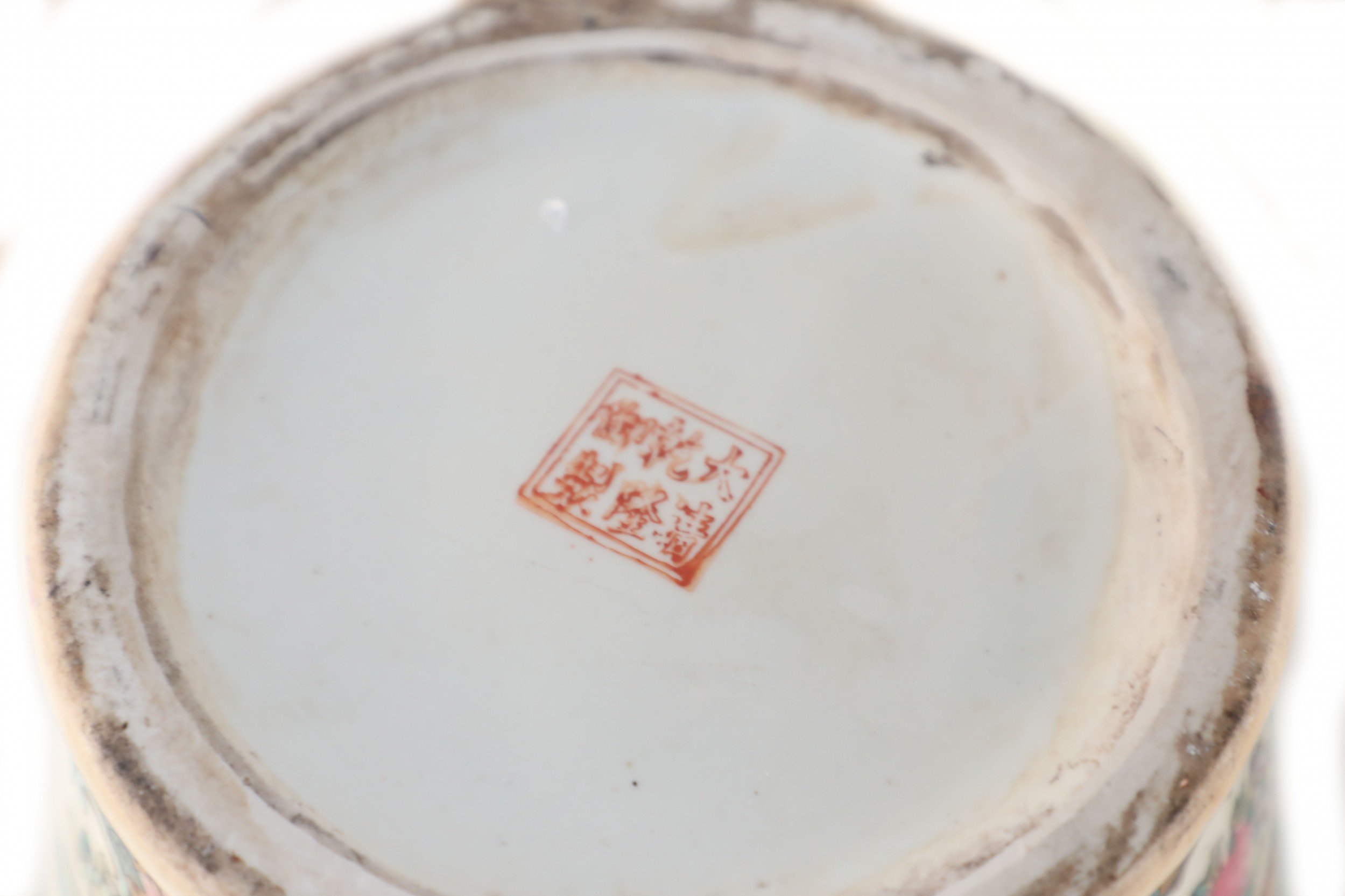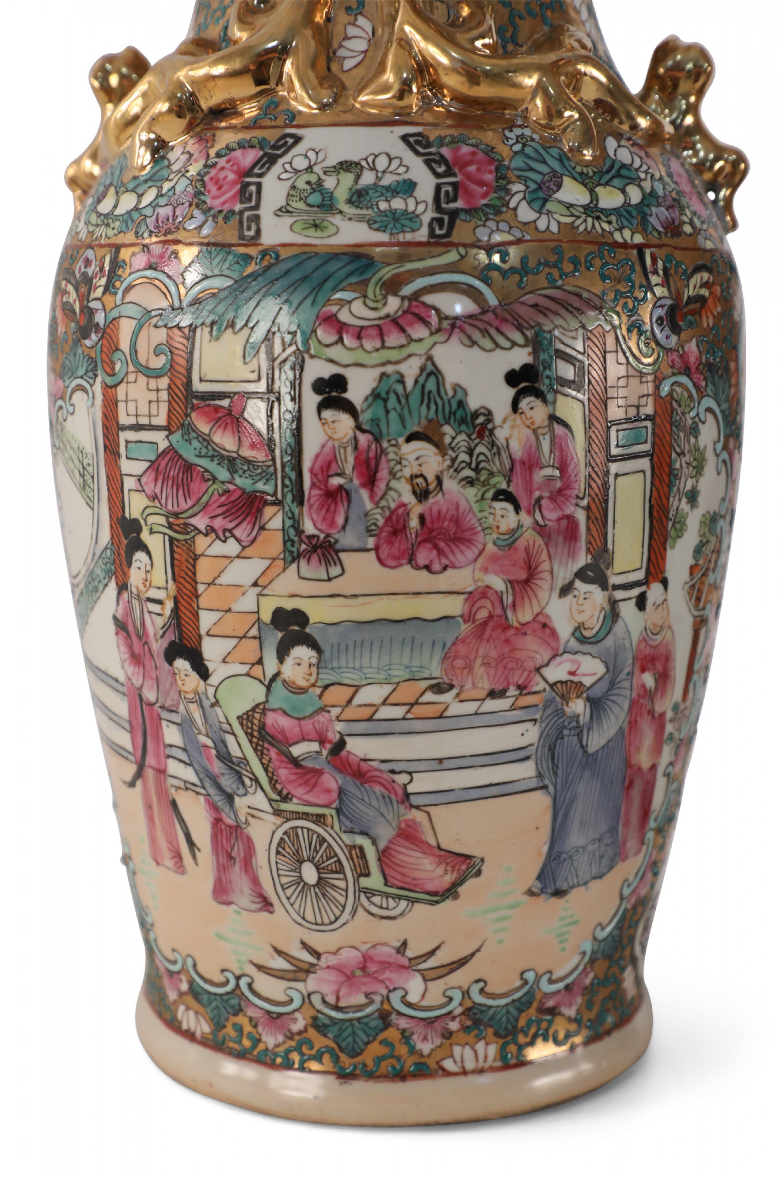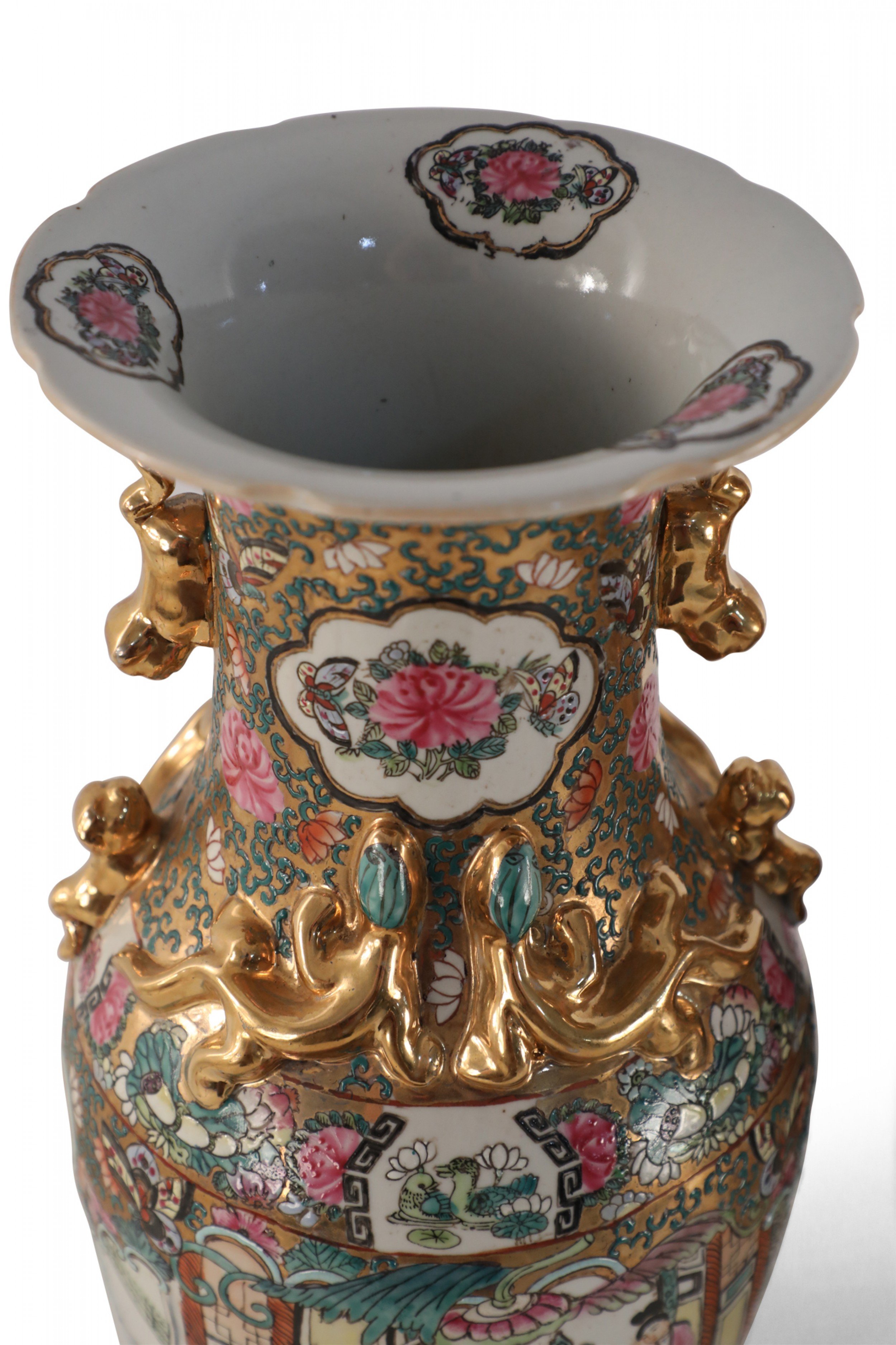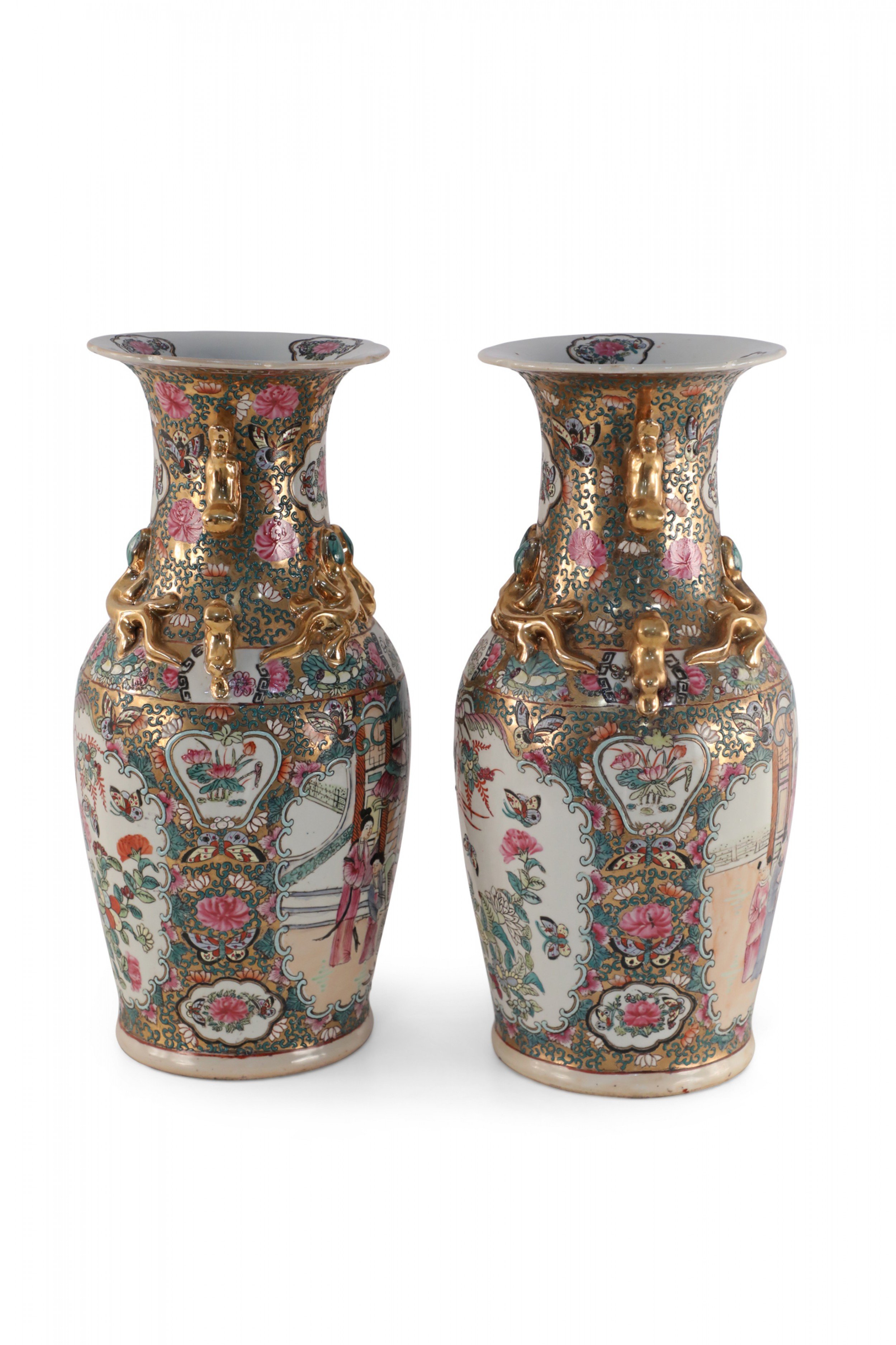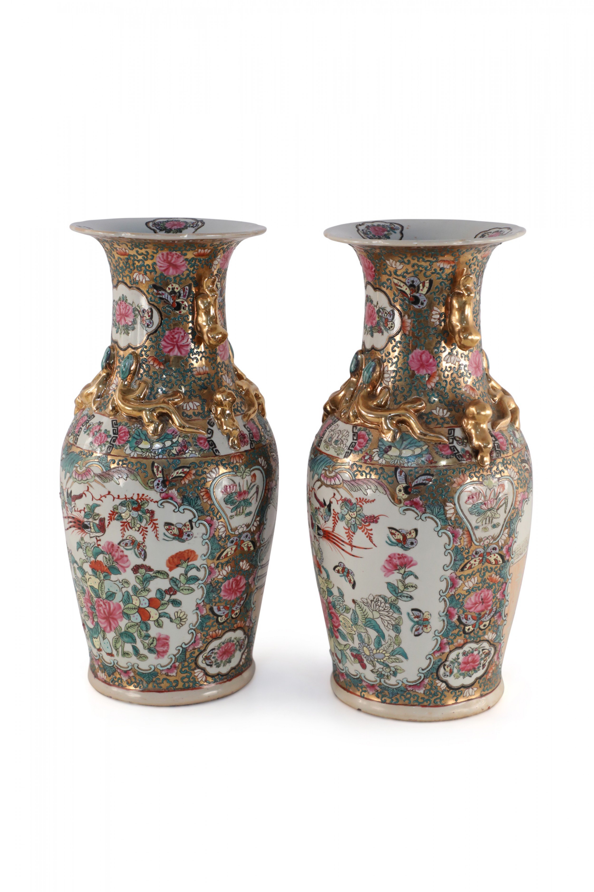 PAIR of Chinese Guangcai porcelain sleeve vases decorated with ornate floral and figurative scenes in palettes of pink, green and yellow with tops flanked by two golden dogs and necks wrapped in gilt animal forms. (mark on bottom) (PRICED AS PAIR)