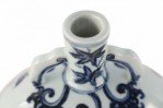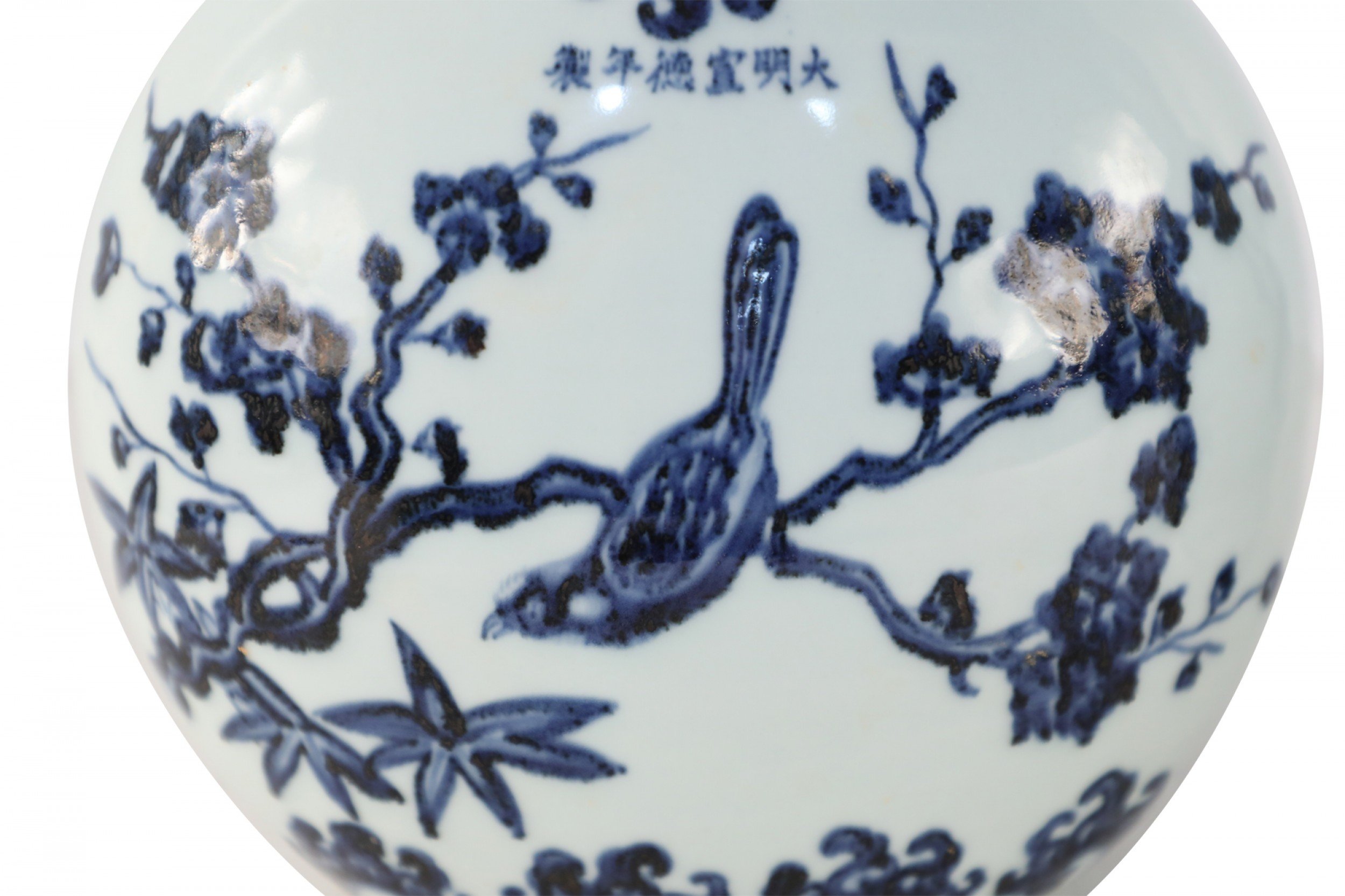 PAIR of Chinese Ming Dynasty Xuande Period-style (late 19th Century) white porcelain vases with moonflask forms, blue floral and bird motifs and marks noting the year of creation (PRICED AS PAIR).