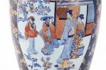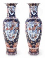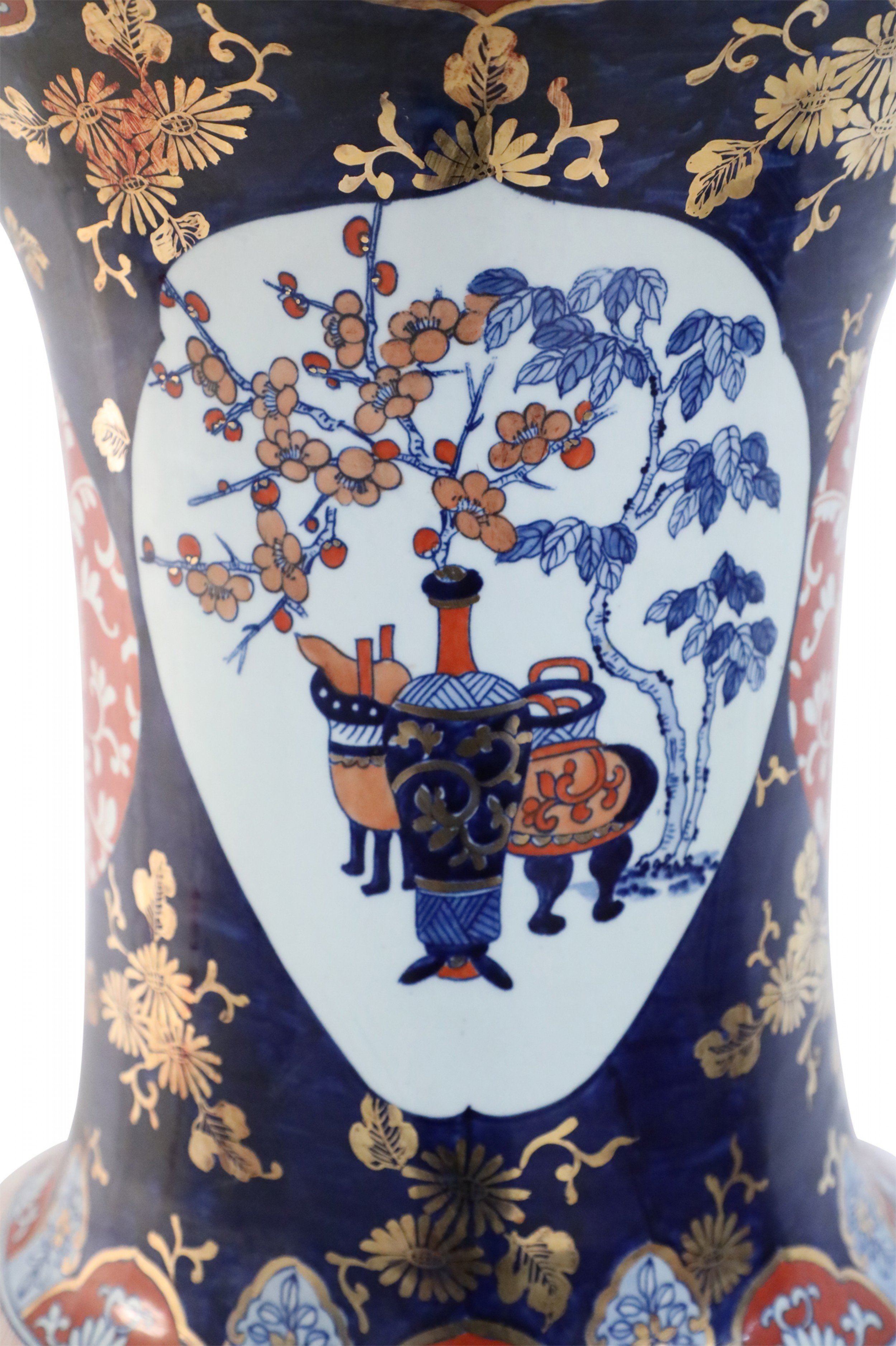 PAIR of Chinese monumental blue and gold floral porcelain floor vases celebrating Japanese Imari ware in both palette and design, with a central figurative scene of women in a garden flanked by richly-colored orange medallions with scrolling white floral patterns (PRICED AS PAIR).
