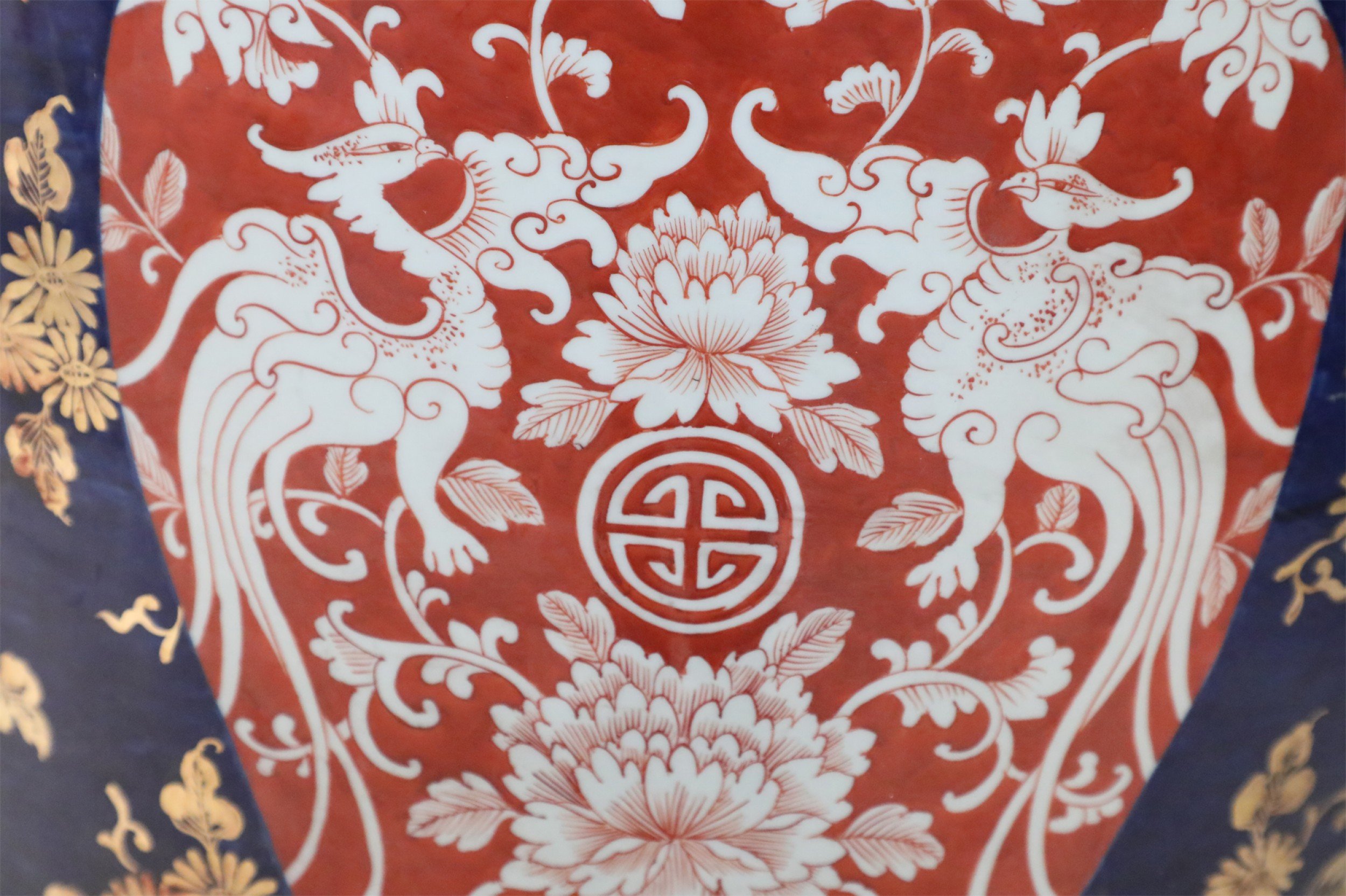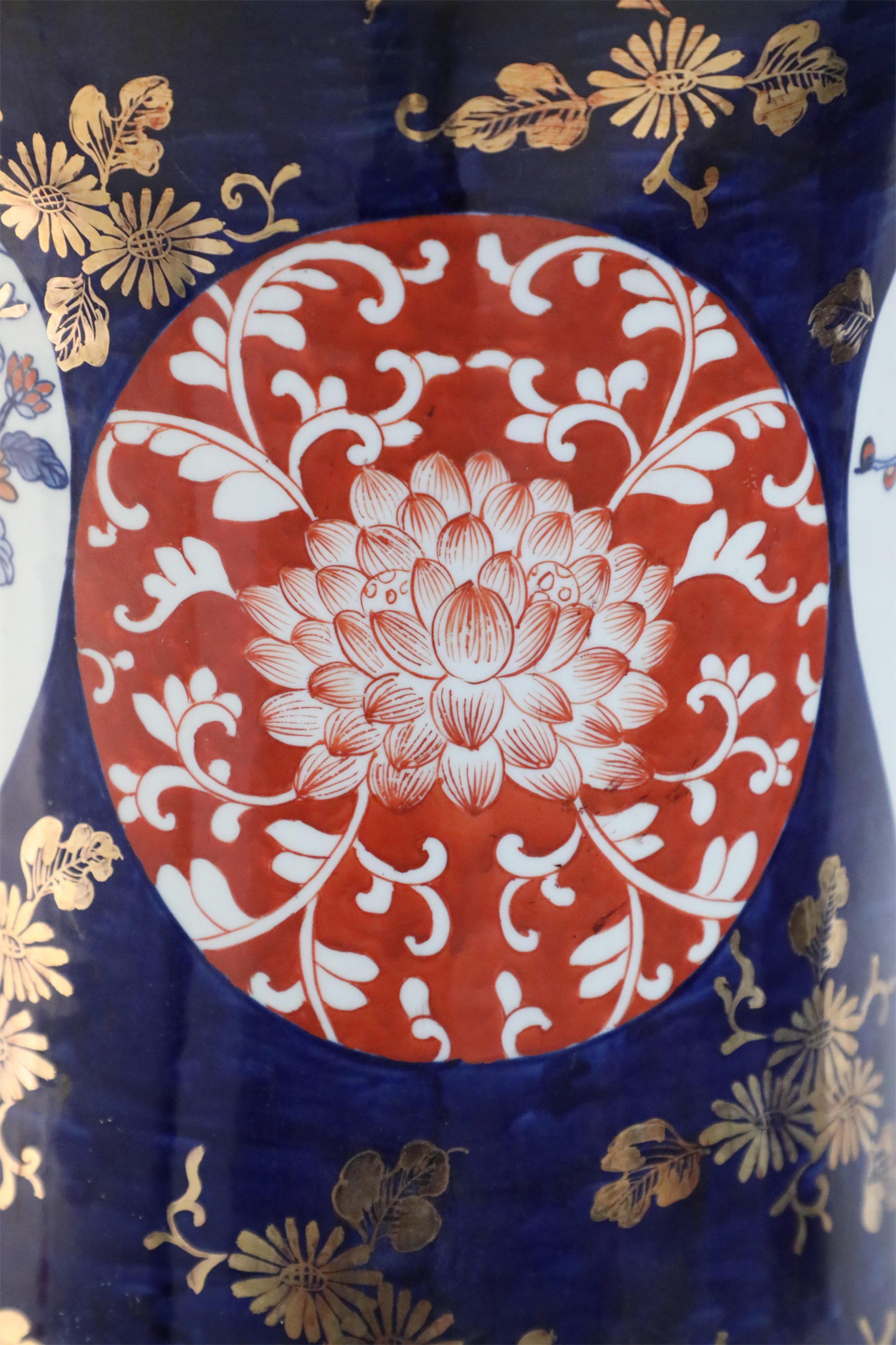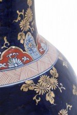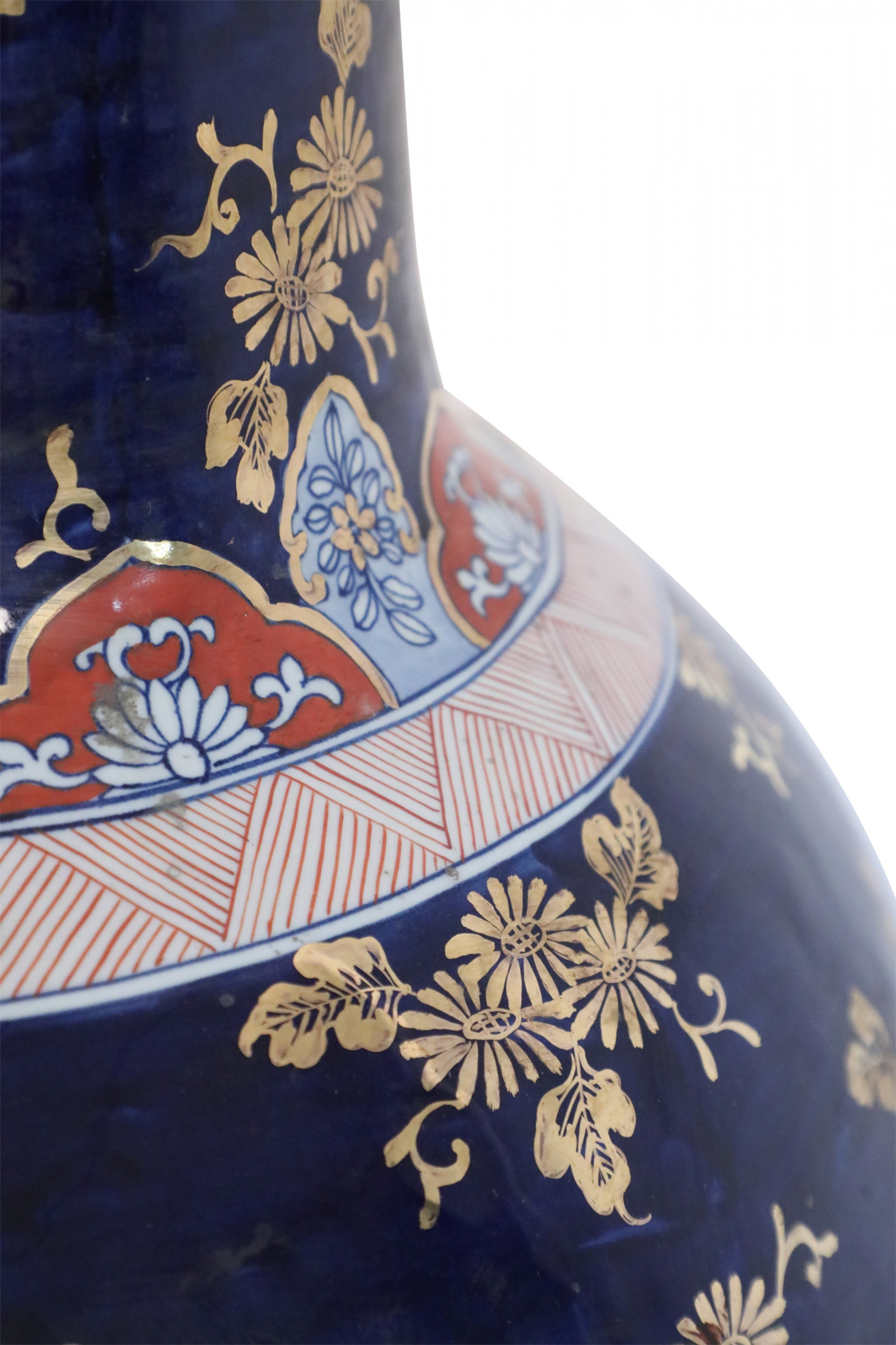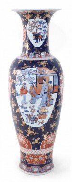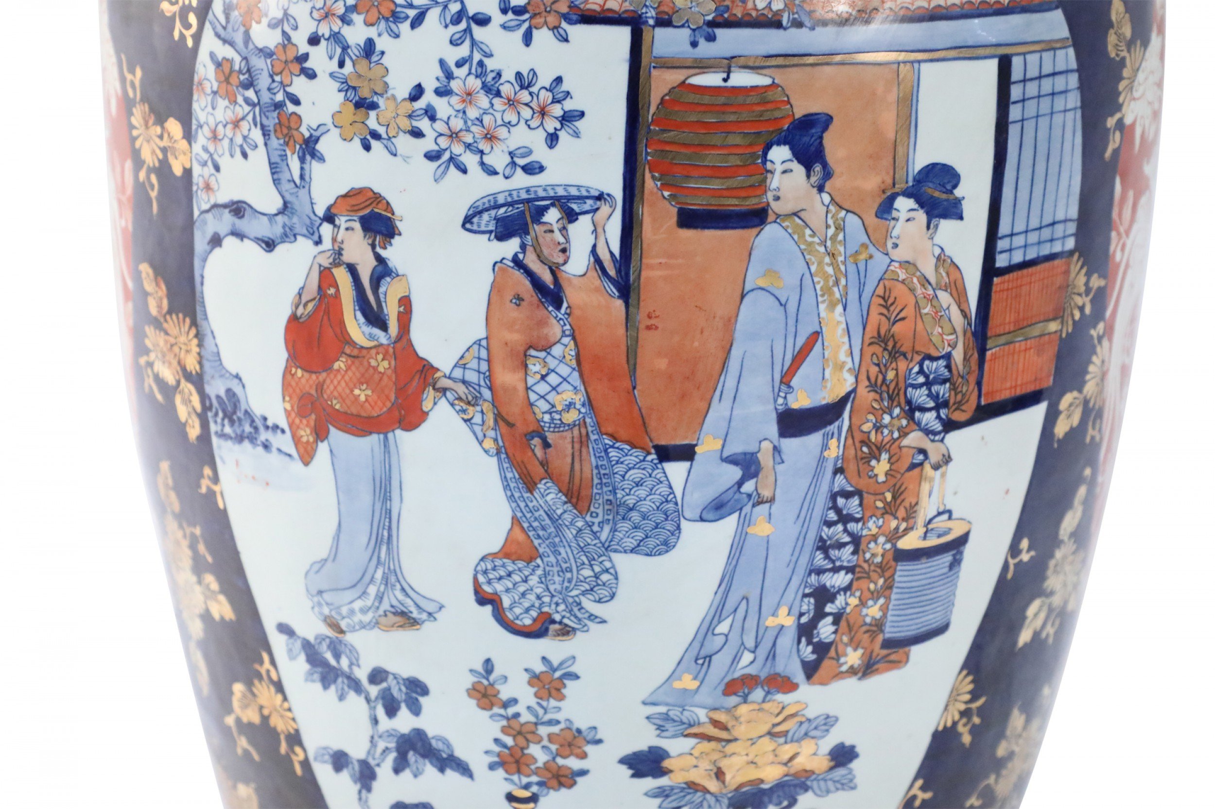 PAIR of Chinese monumental blue and gold floral porcelain floor vases celebrating Japanese Imari ware in both palette and design, with a central figurative scene of women in a garden flanked by richly-colored orange medallions with scrolling white floral patterns (PRICED AS PAIR)..