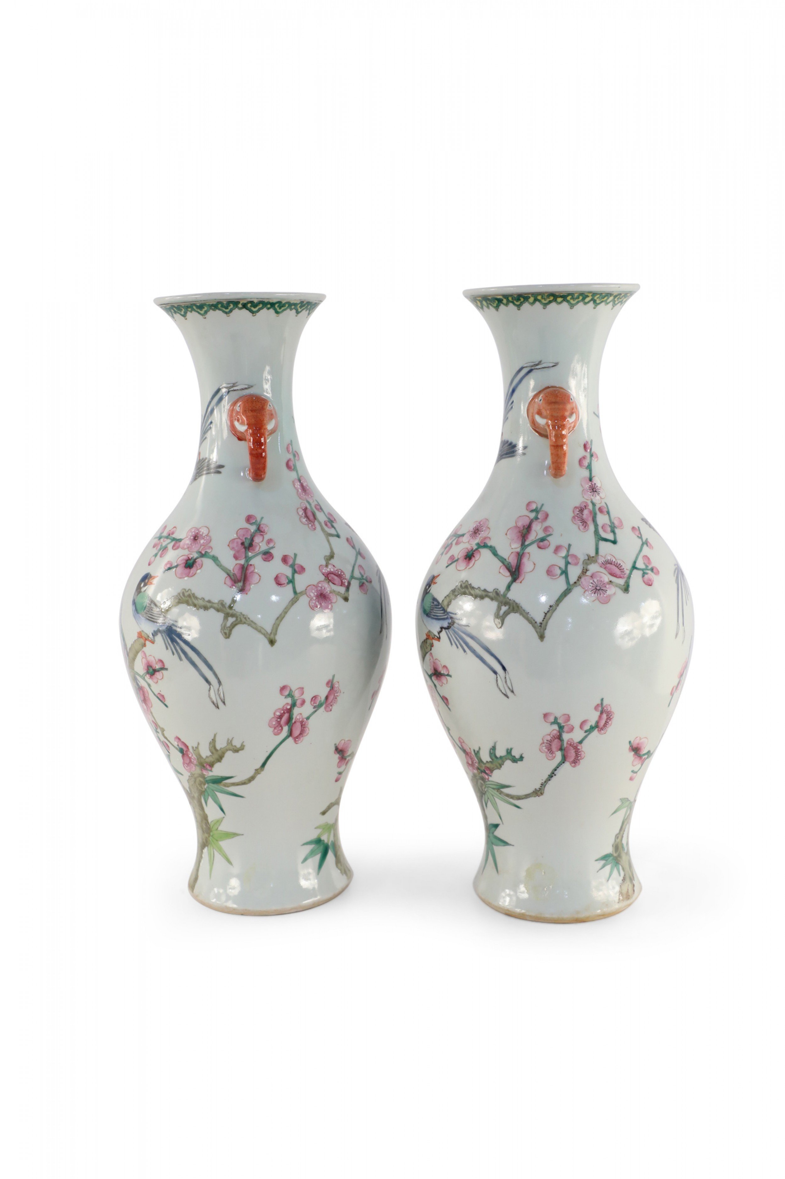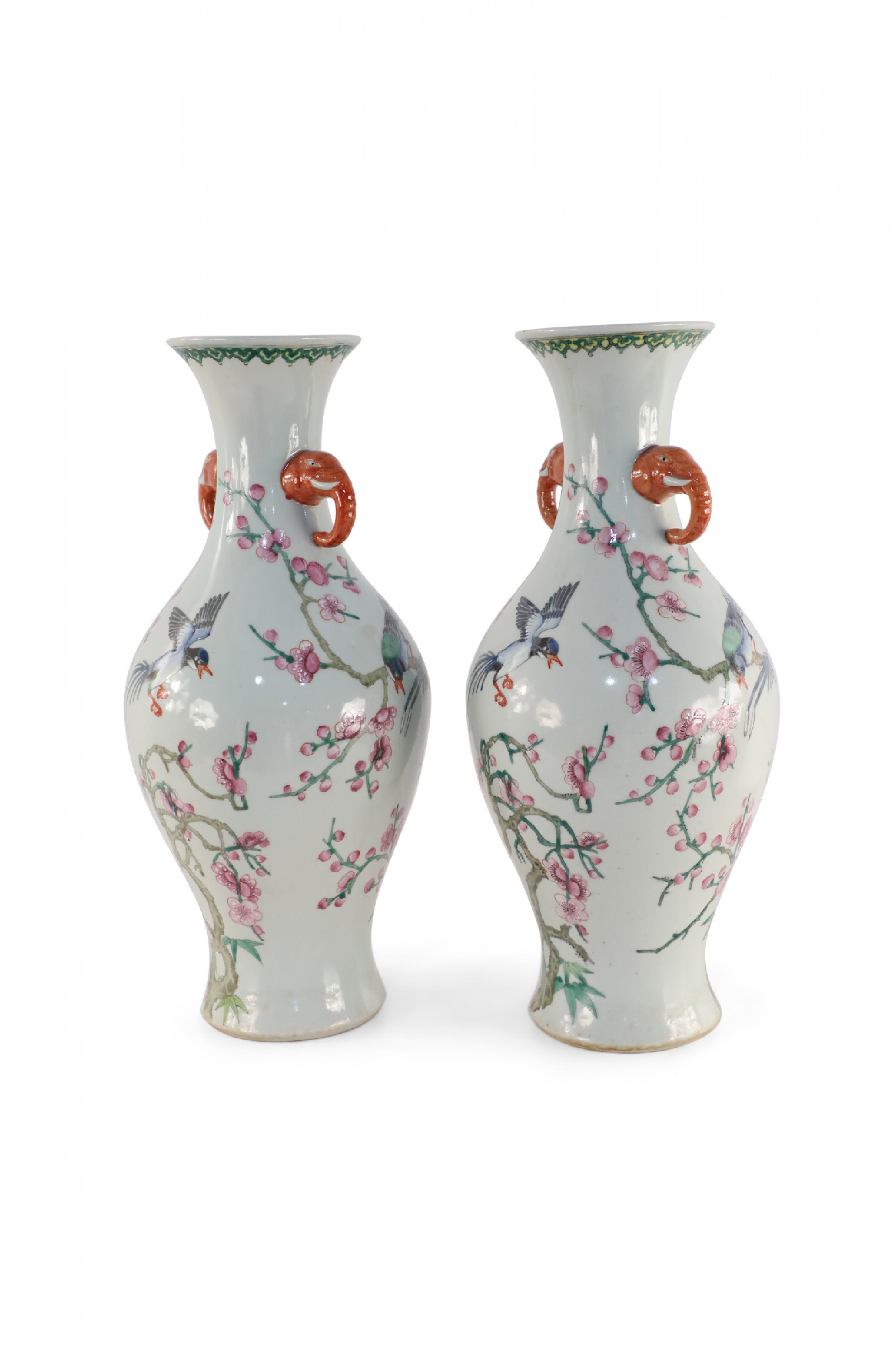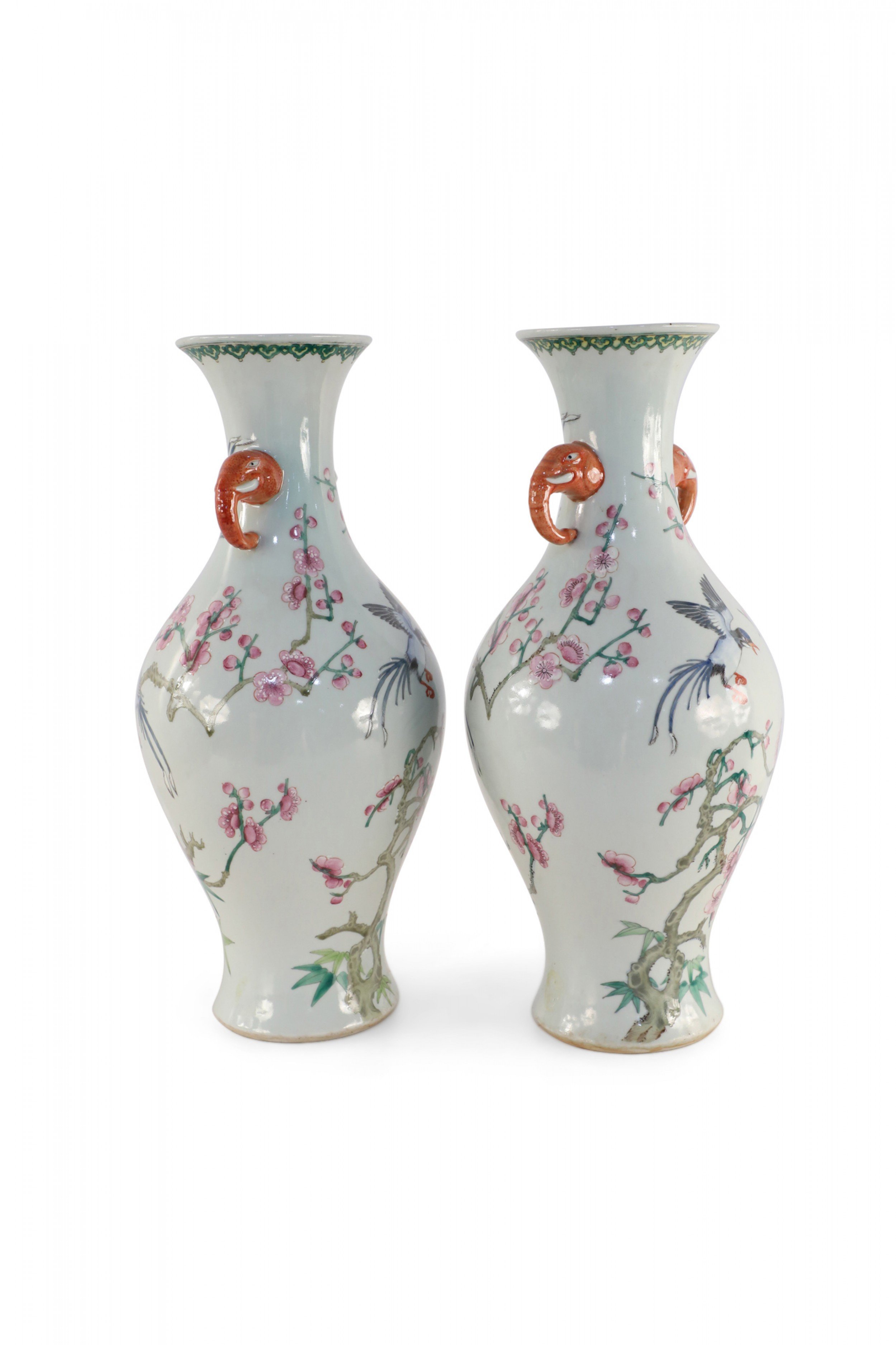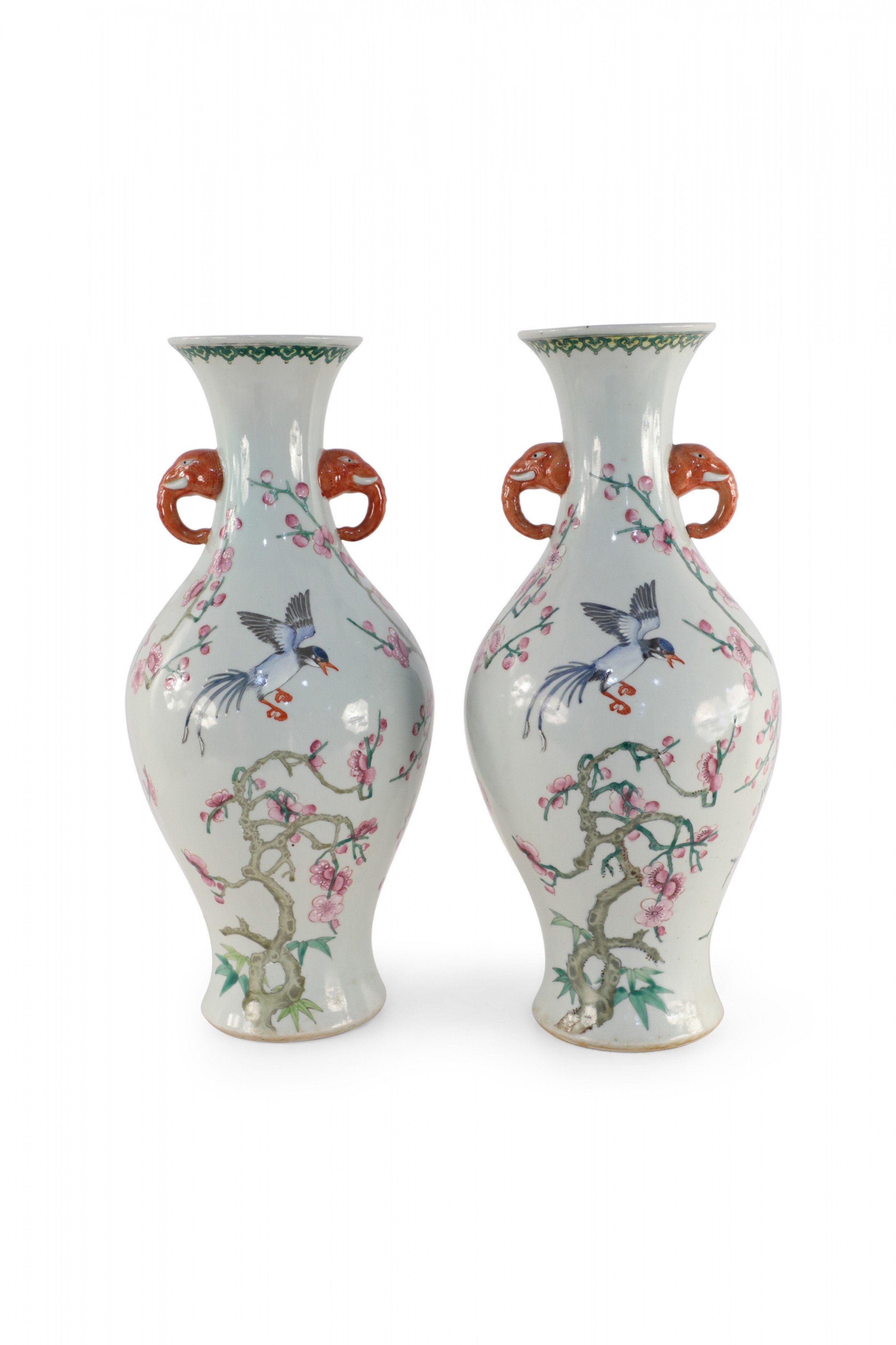 PAIR of Chinese off-white urn-shaped porcelain vases depicting groups of birds perched on flowering branches of cherry blossom trees and one bird flying above, positioned between two orange, elephant handles that adorn the necks (PRICED AS PAIR).